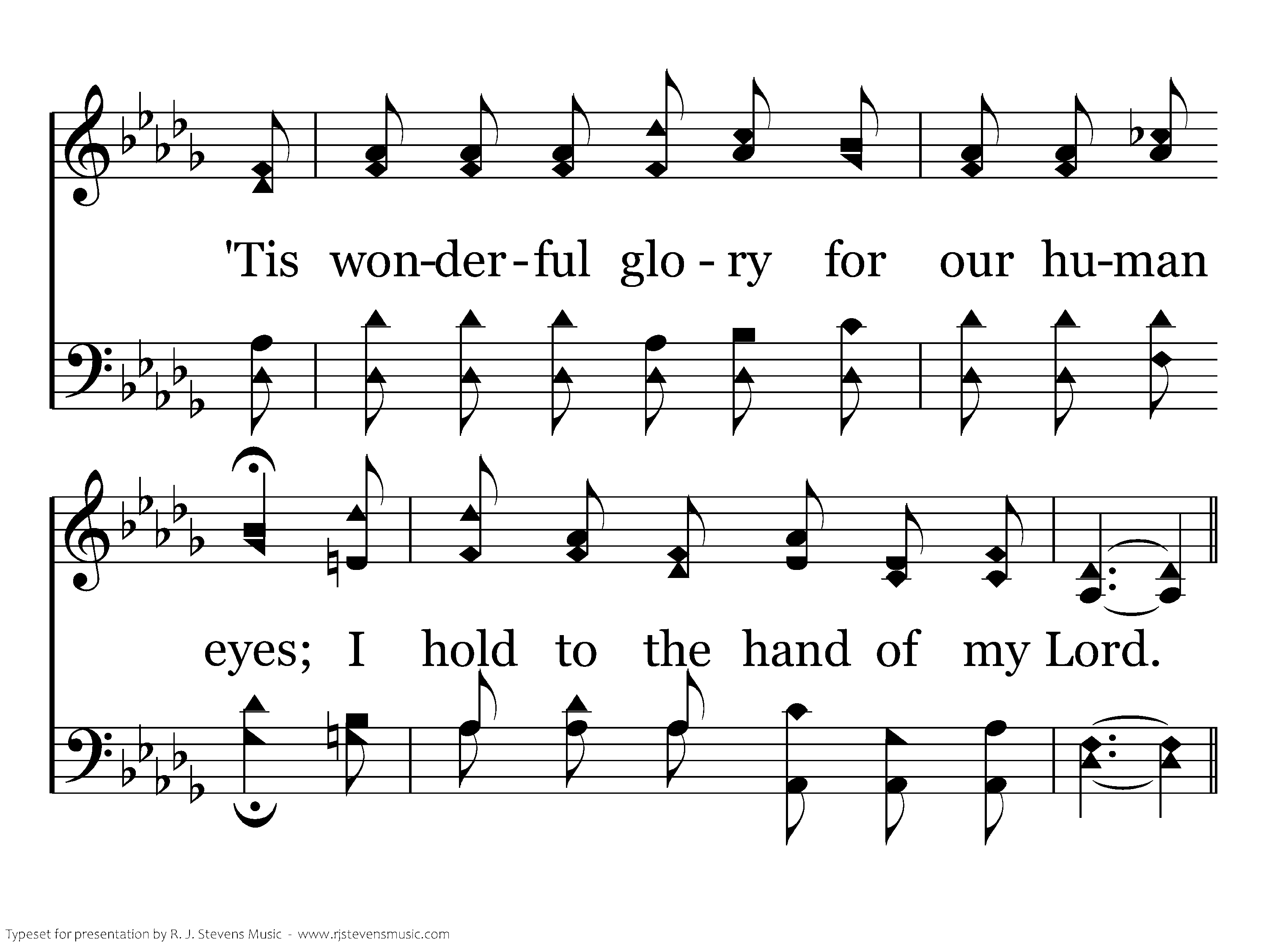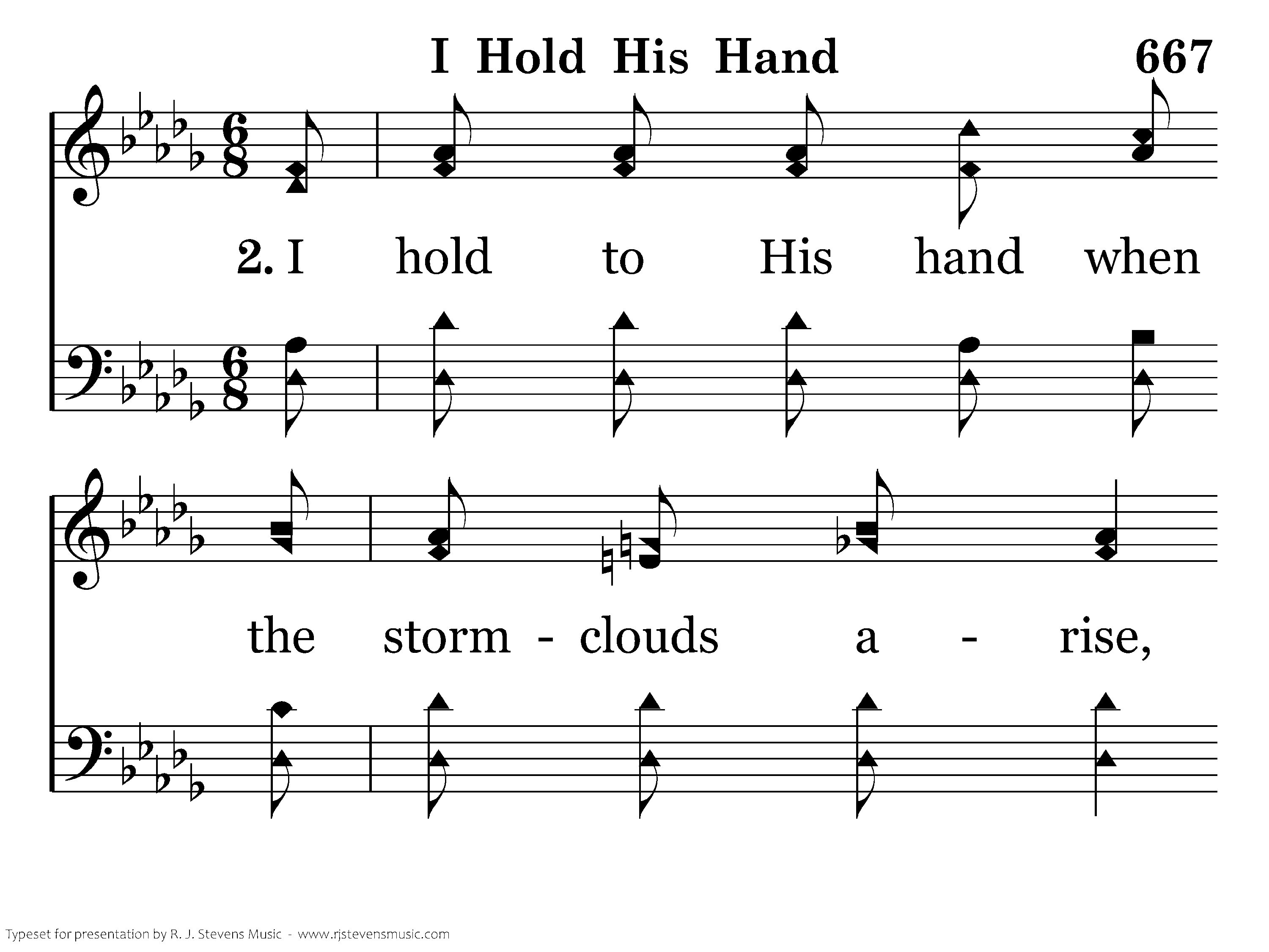 I hold to His hand when the stormclouds arise, He speaks and the shadows roll back from the skies, 'Tis wonderful glory for our human eyes; I hold to the hand of my Lord.