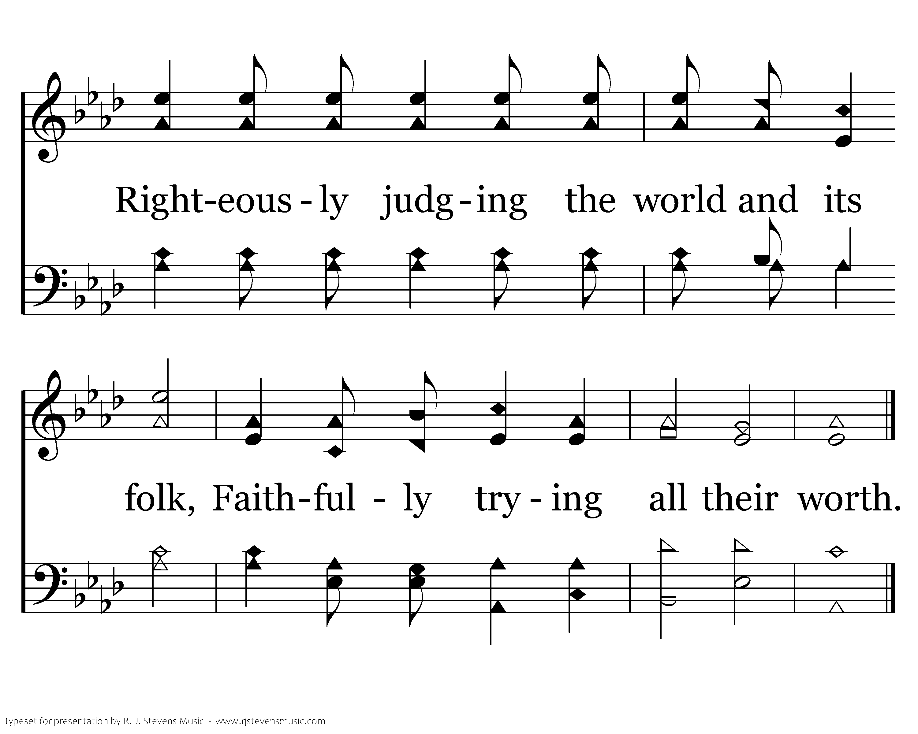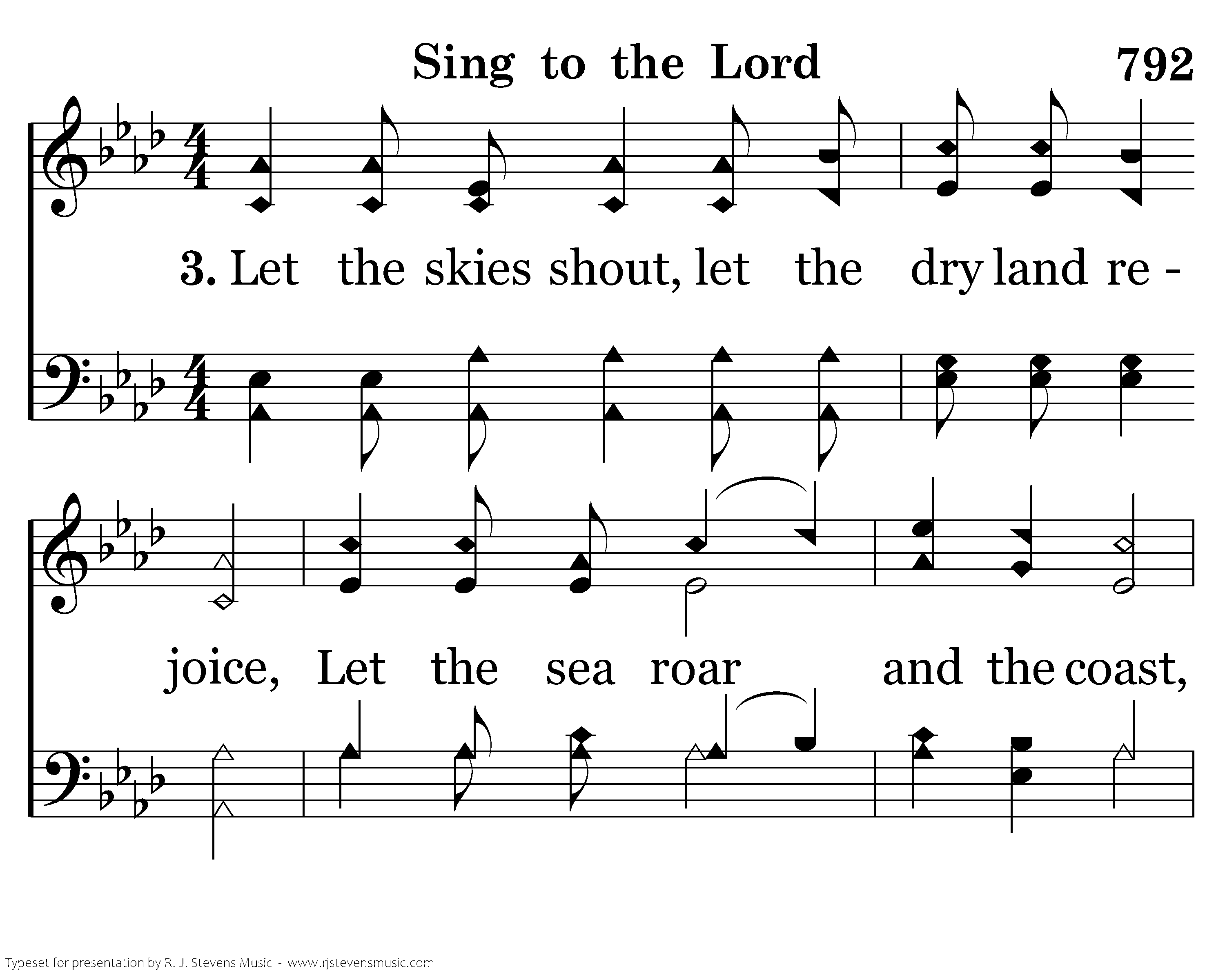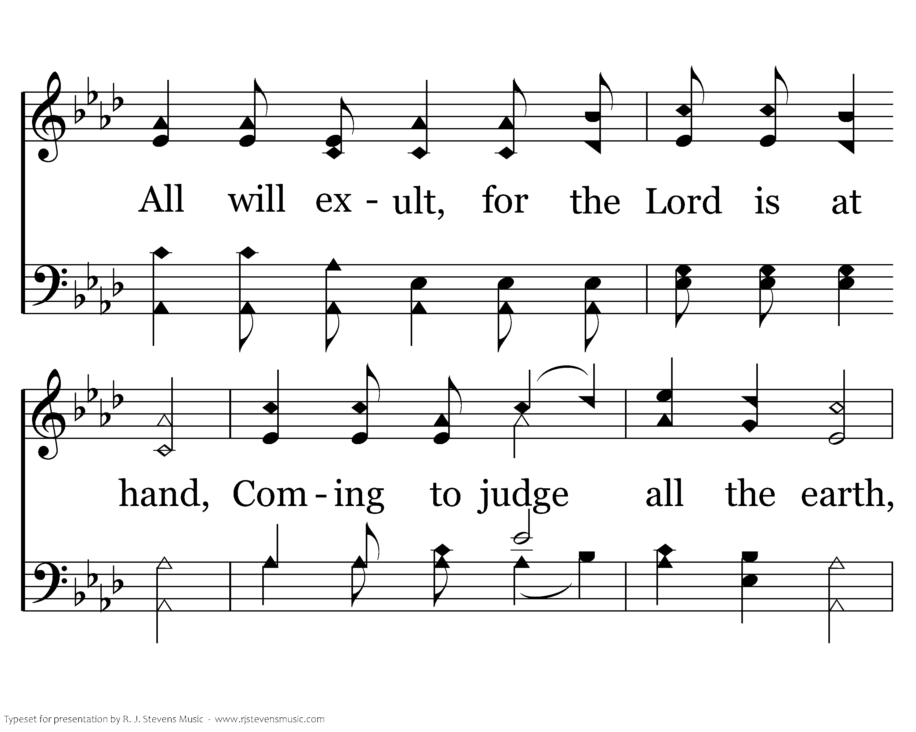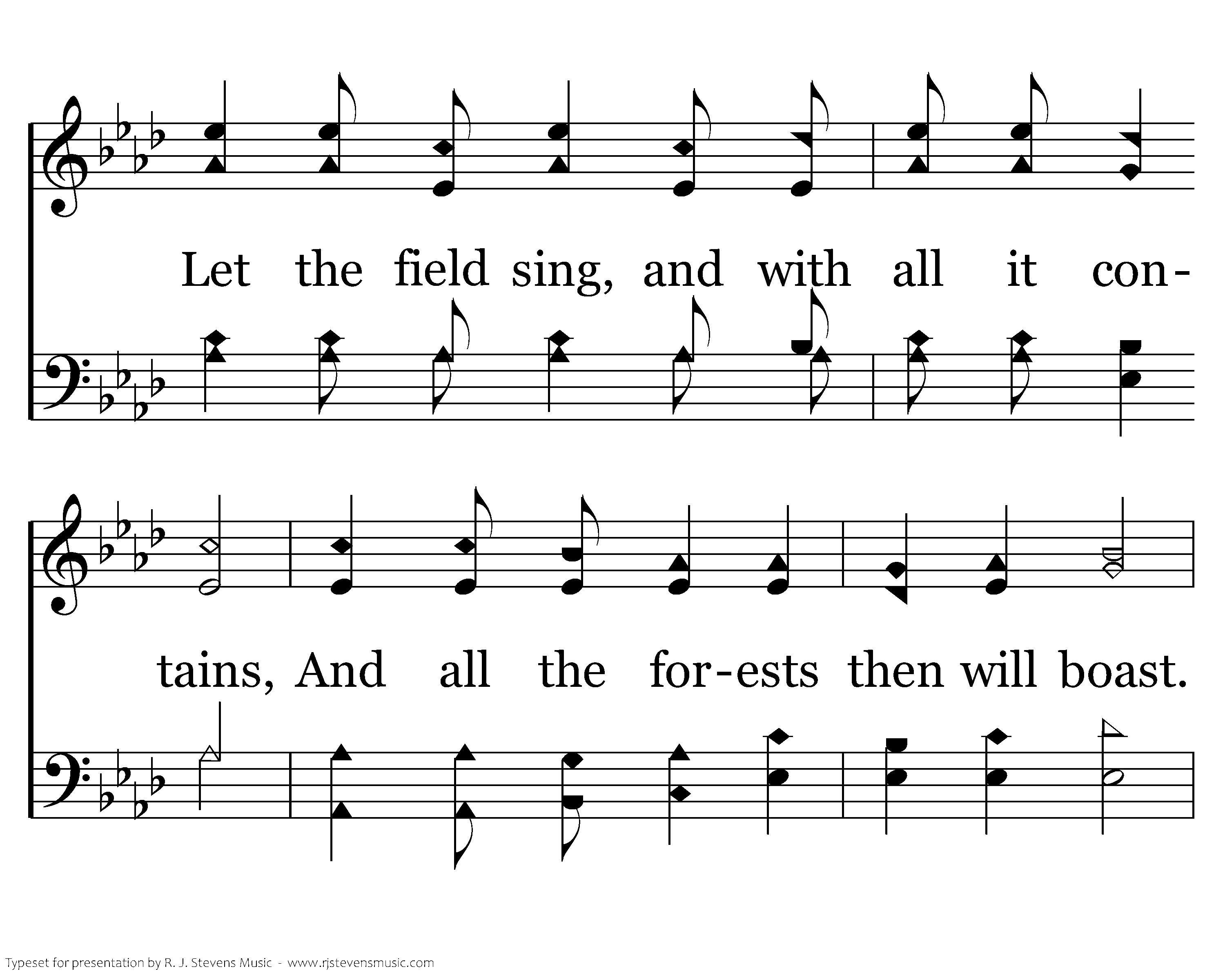 Let the skies shout let the dry land rejoice, Let the sea roar and the coast, Let the field sing and with all it contains, And all the forest then will boast. All will excult, for the Lord is at hand, Coming to judge all the earth, Righteously judging the world and its folk, Faithfully trying all their worth.
