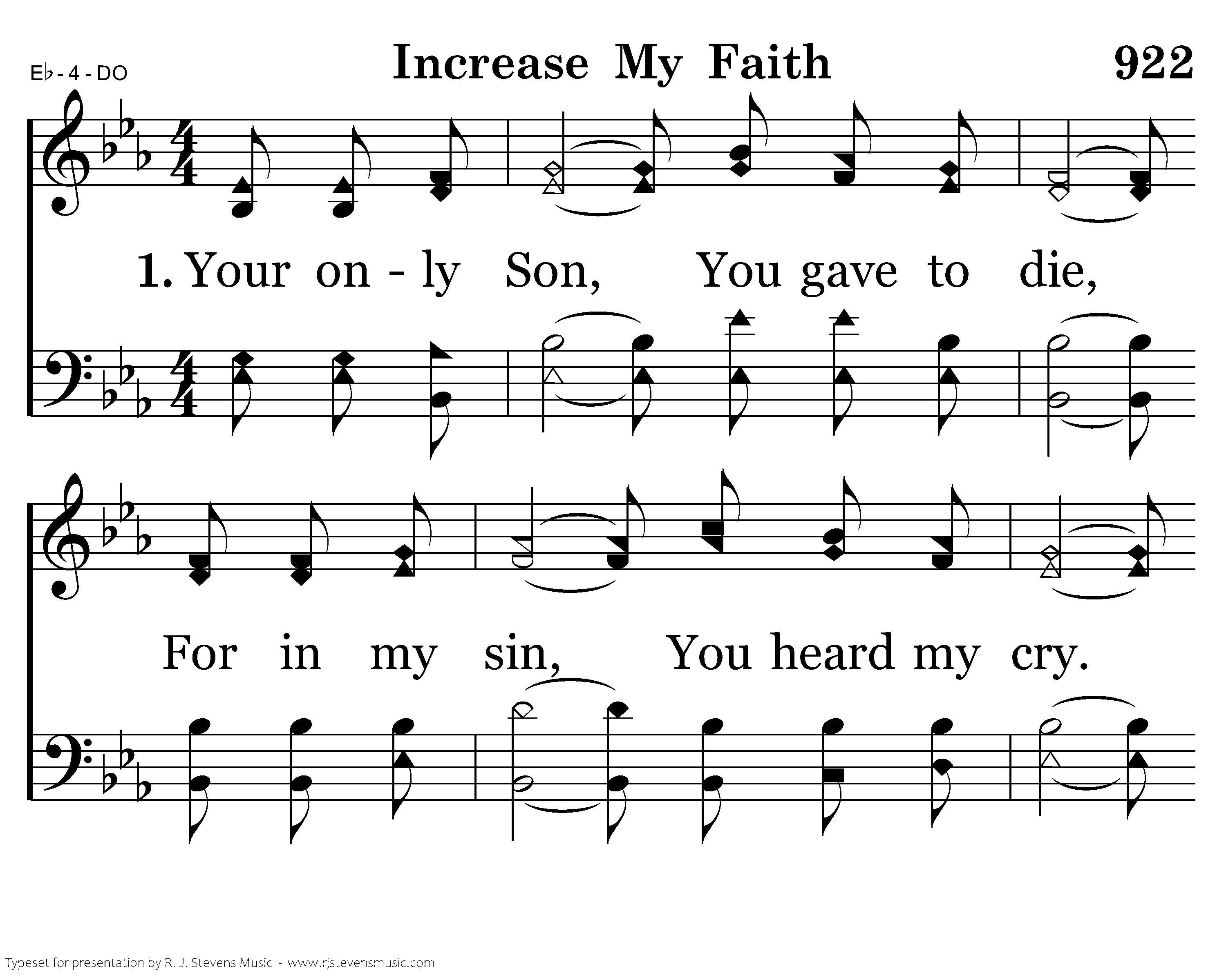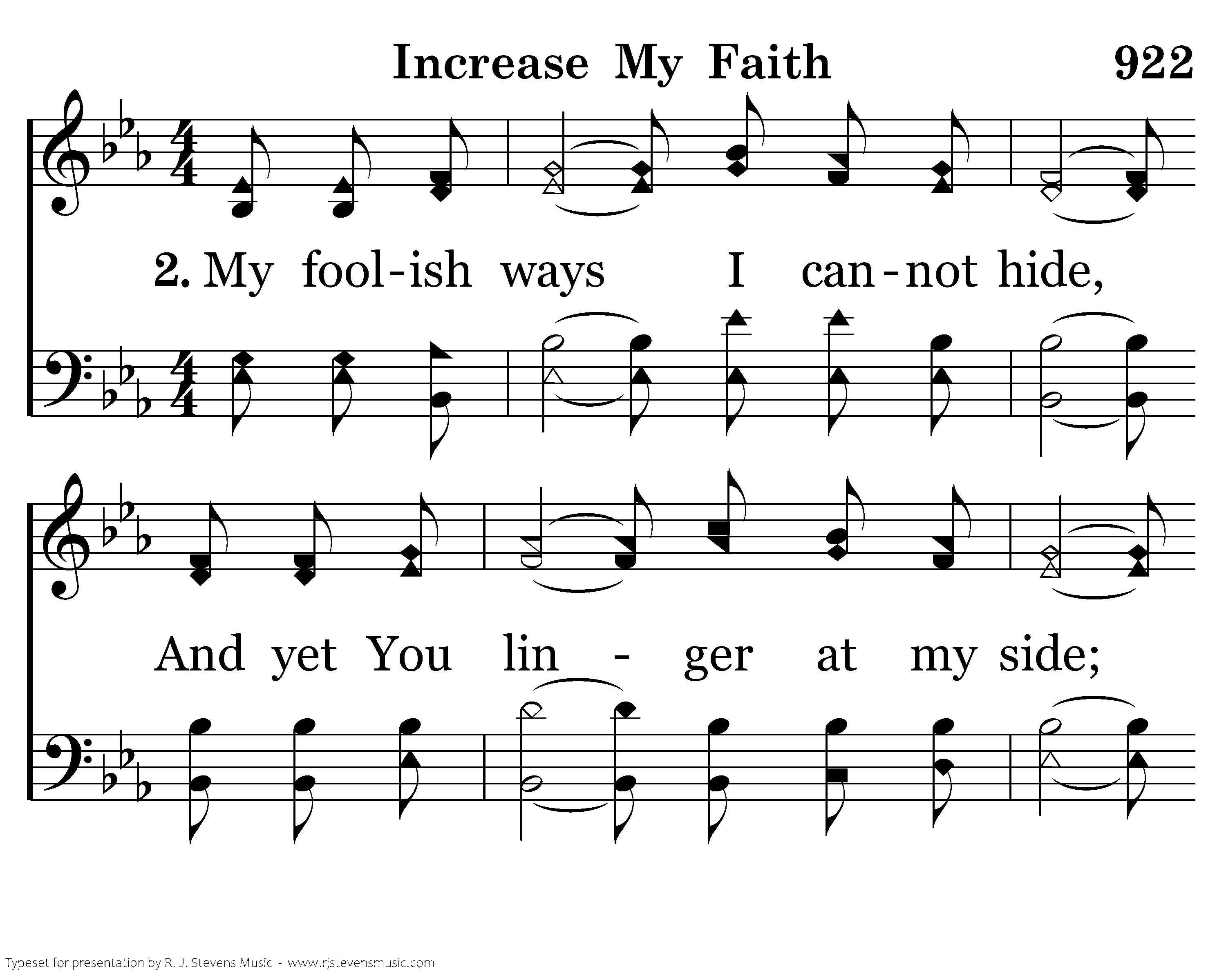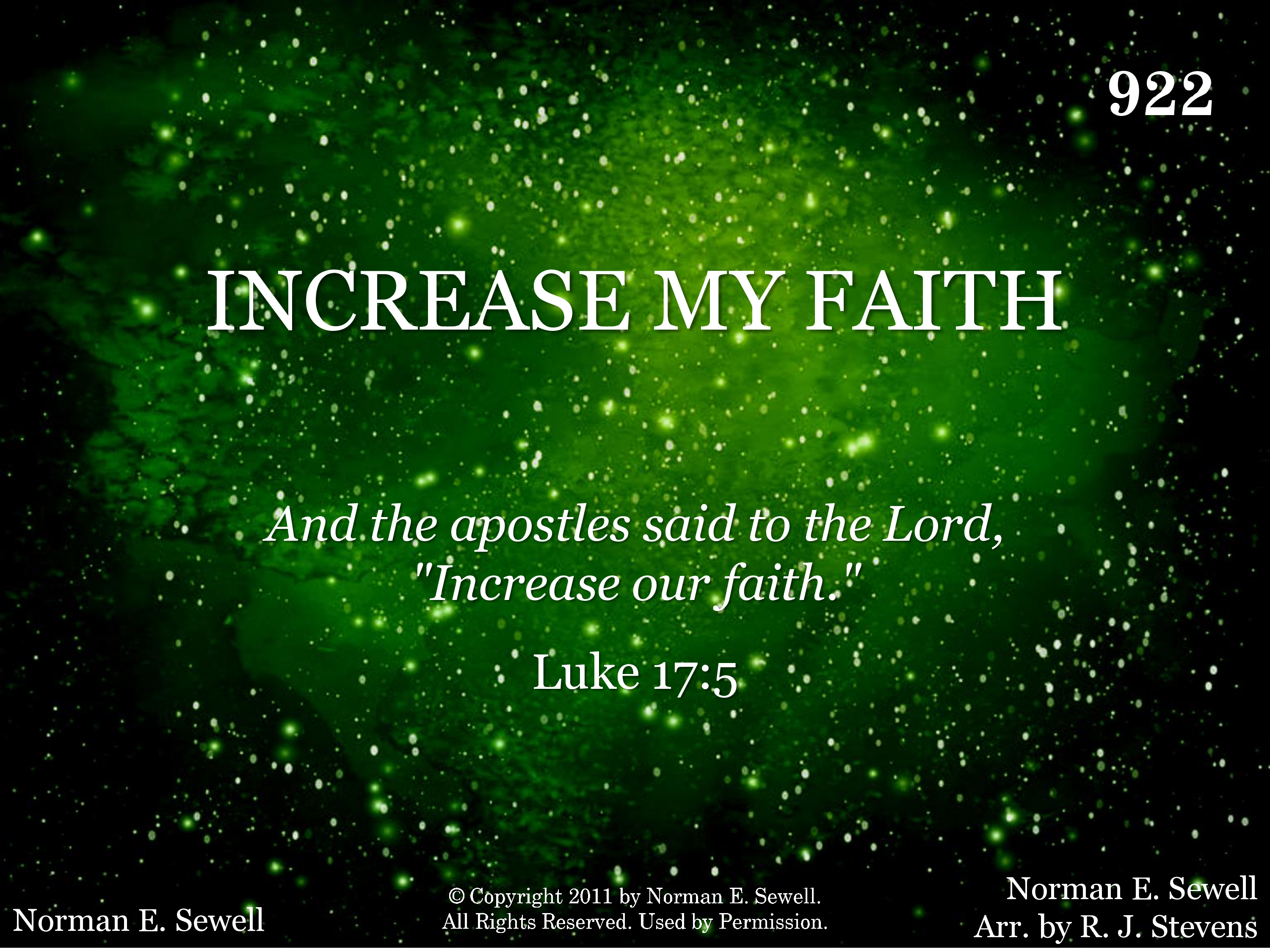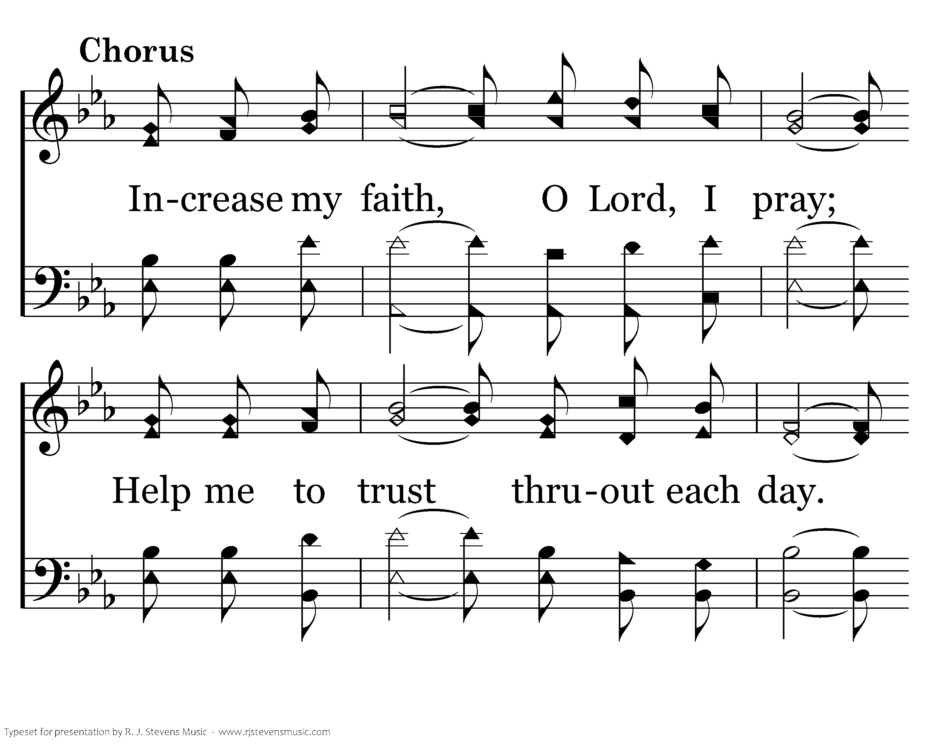 Increase my faith, O Lord, I pray; Help me to trust thruout each day. Your promises I count so dear; Forgive, dear Lord, and hold me near.