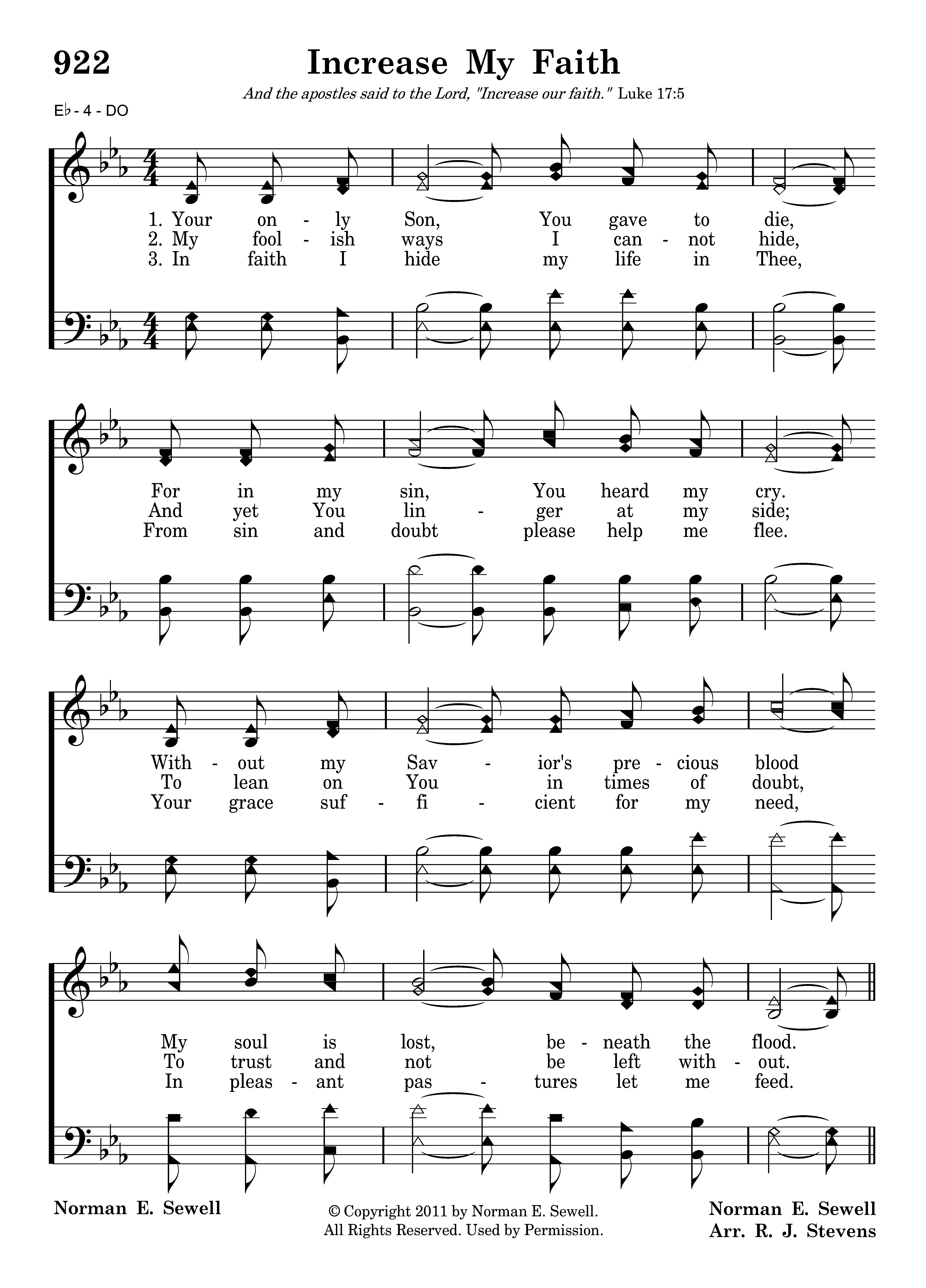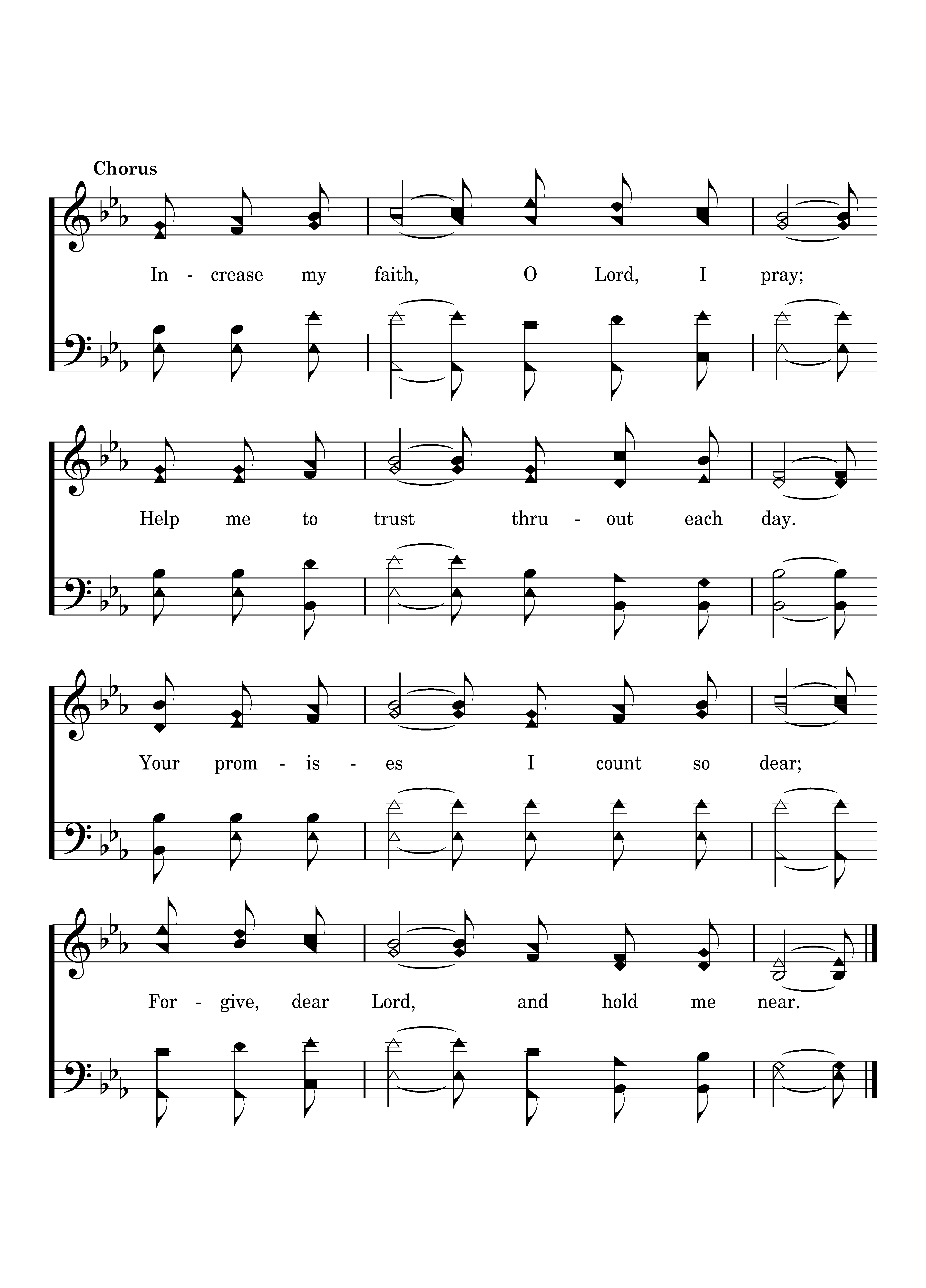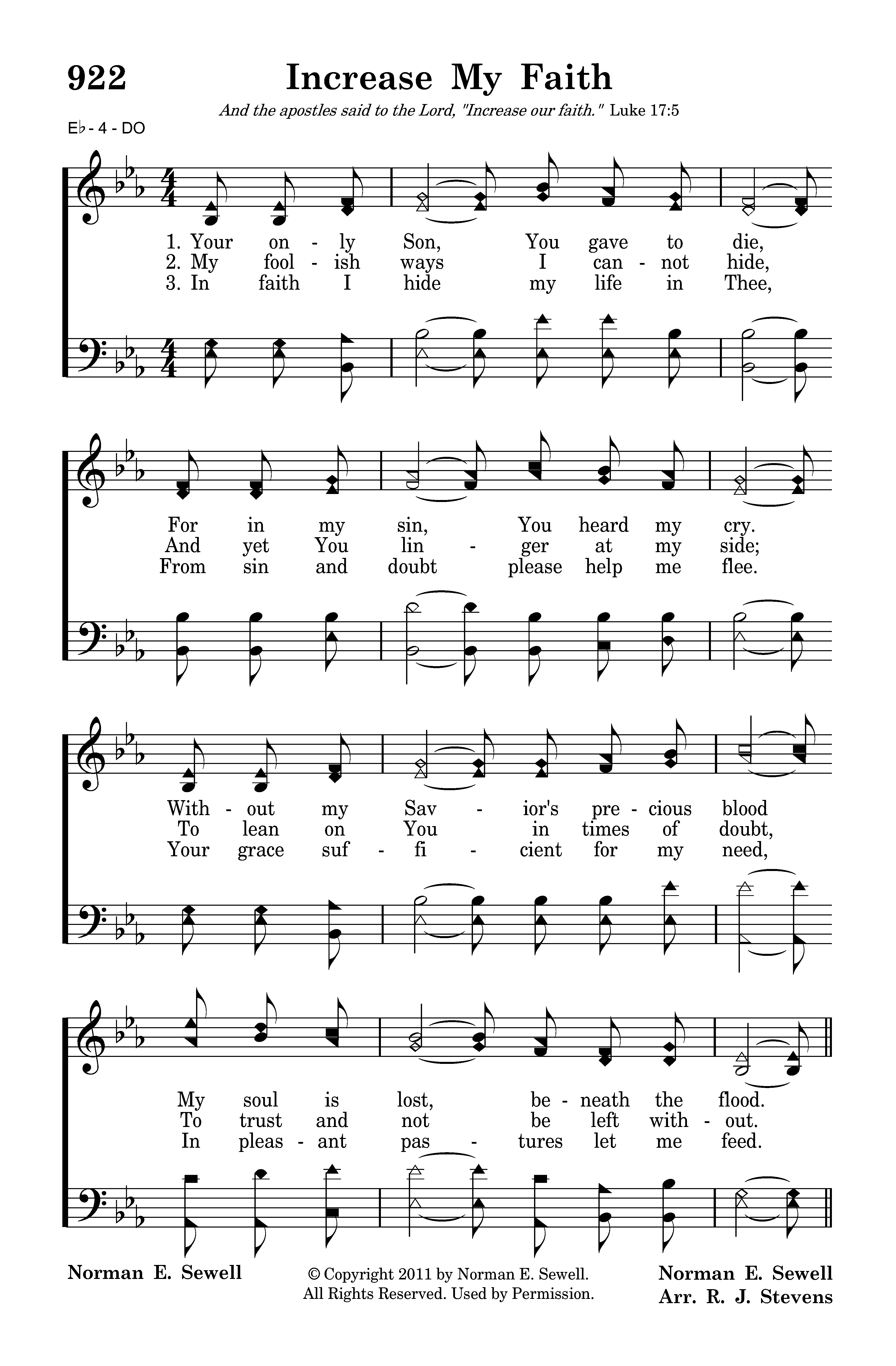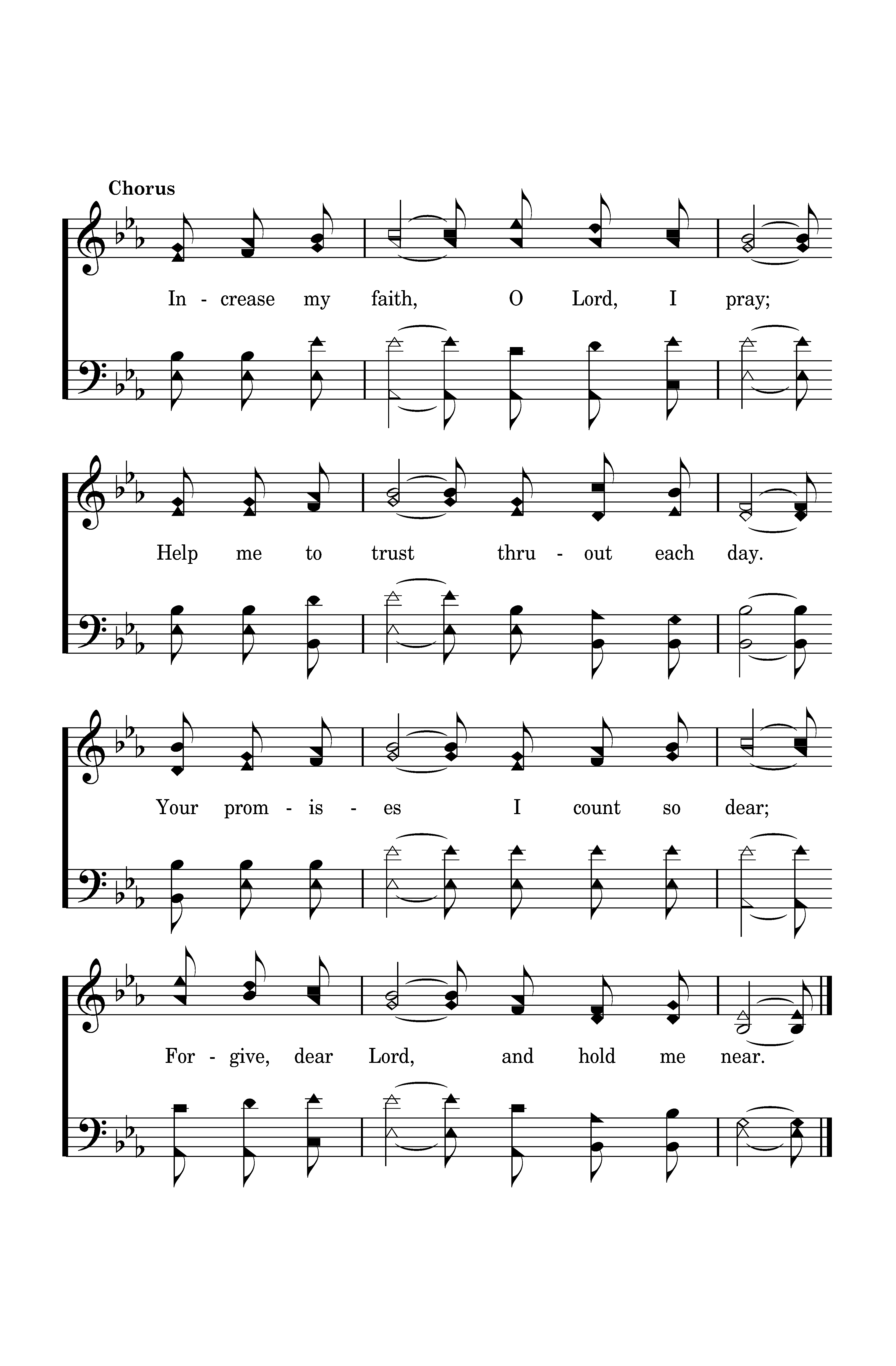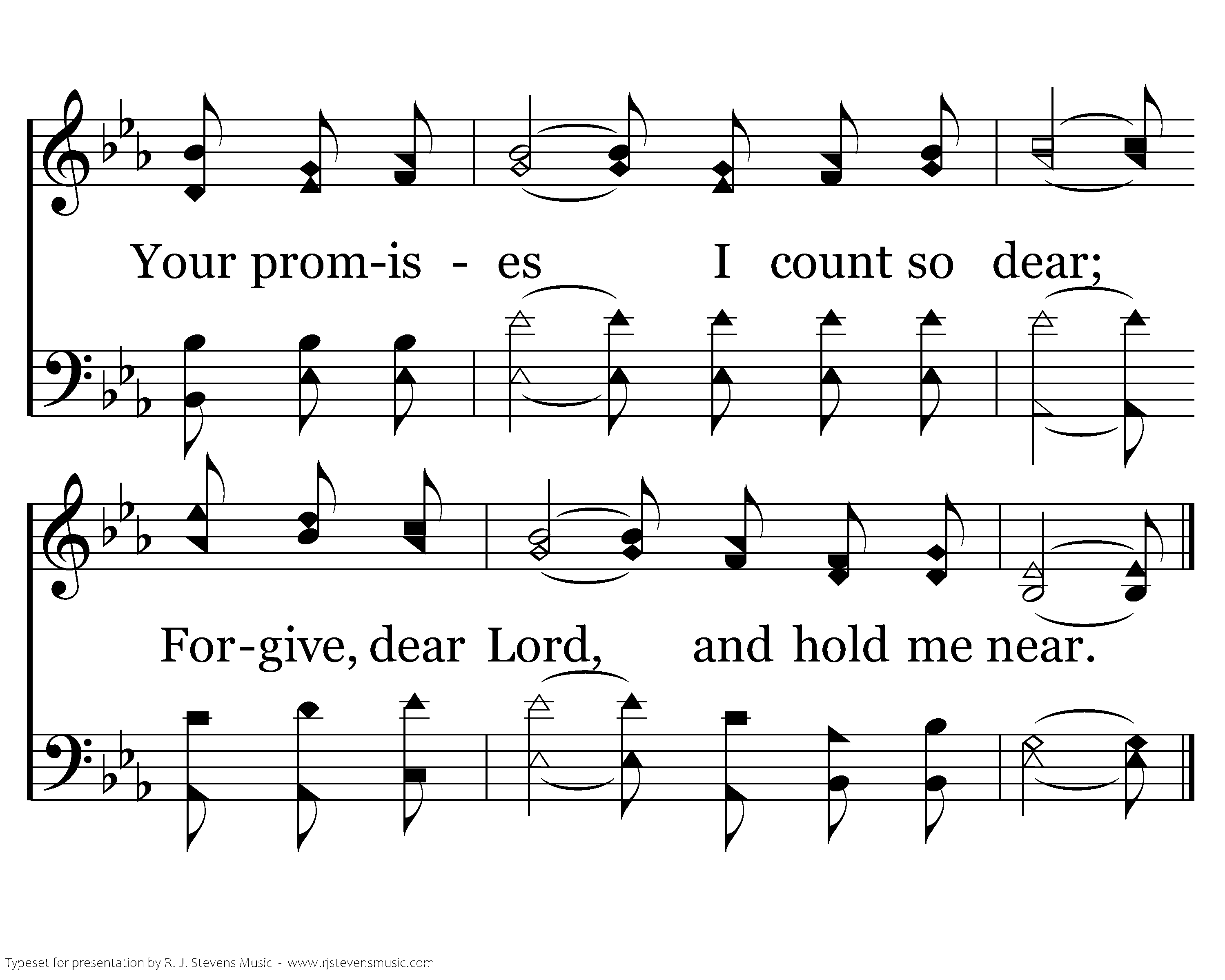 Increase my faith, O Lord, I pray; Help me to trust thruout each day. Your promises I count so dear; Forgive, dear Lord, and hold me near.