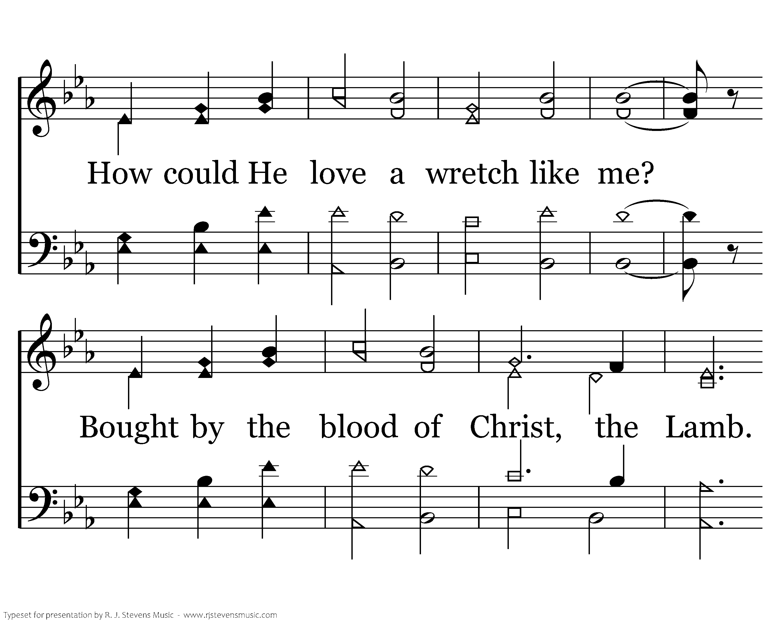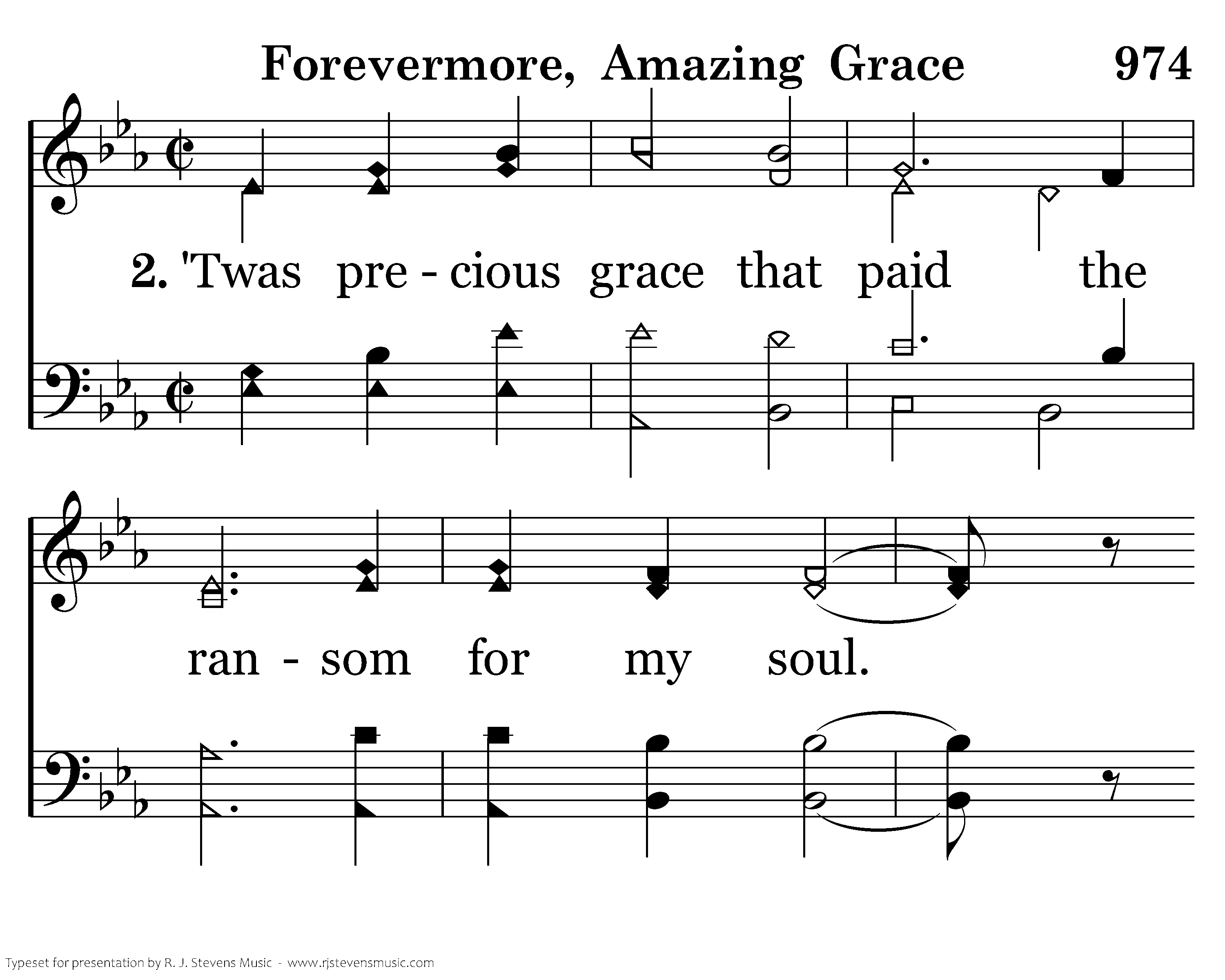 Twas precious grace that paid the ransom for my soul. How could He love a wretch like me? Bought by the blood of Christ, the Lamb. Forevermore, amazing grace, O Lord, how sweet. Now by that grace I am redeemed, Once I was blind But now I see. Ten thousand years, and then forevermore, Amazing grace shall be my plea.