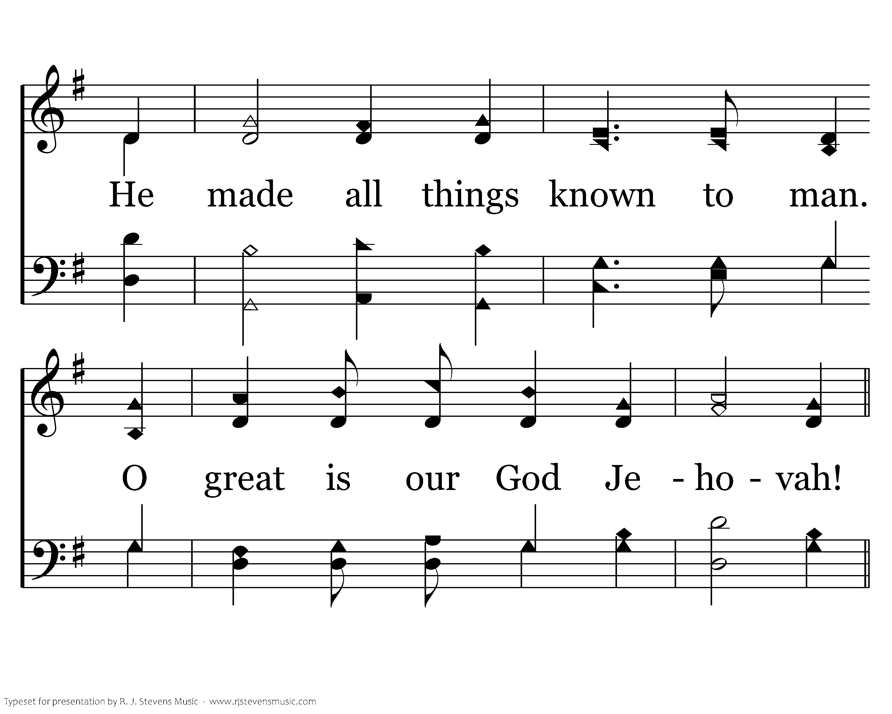 We praise God our Father, the Lord of the universe. He made all things known to man. O great is our God Jehovah!