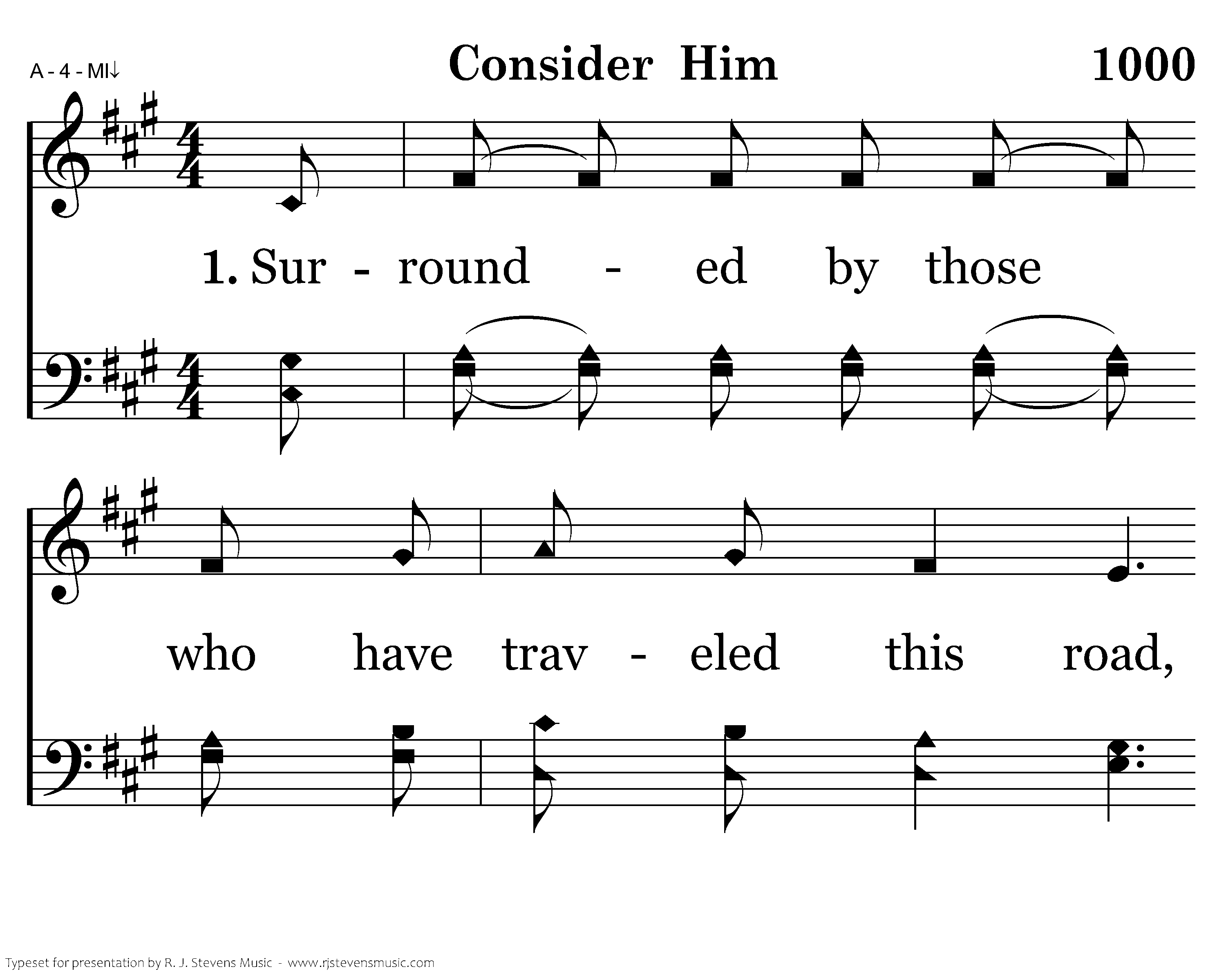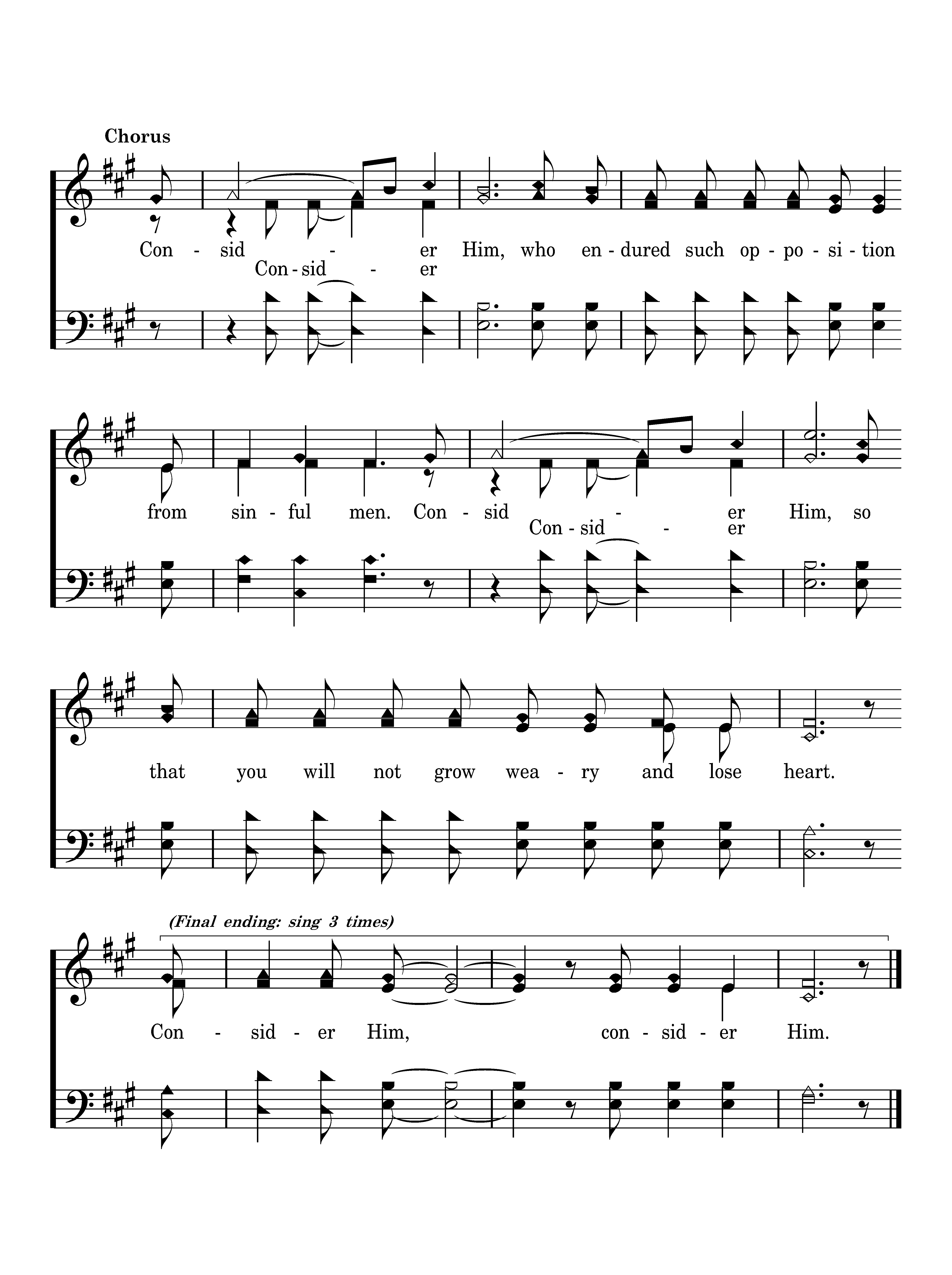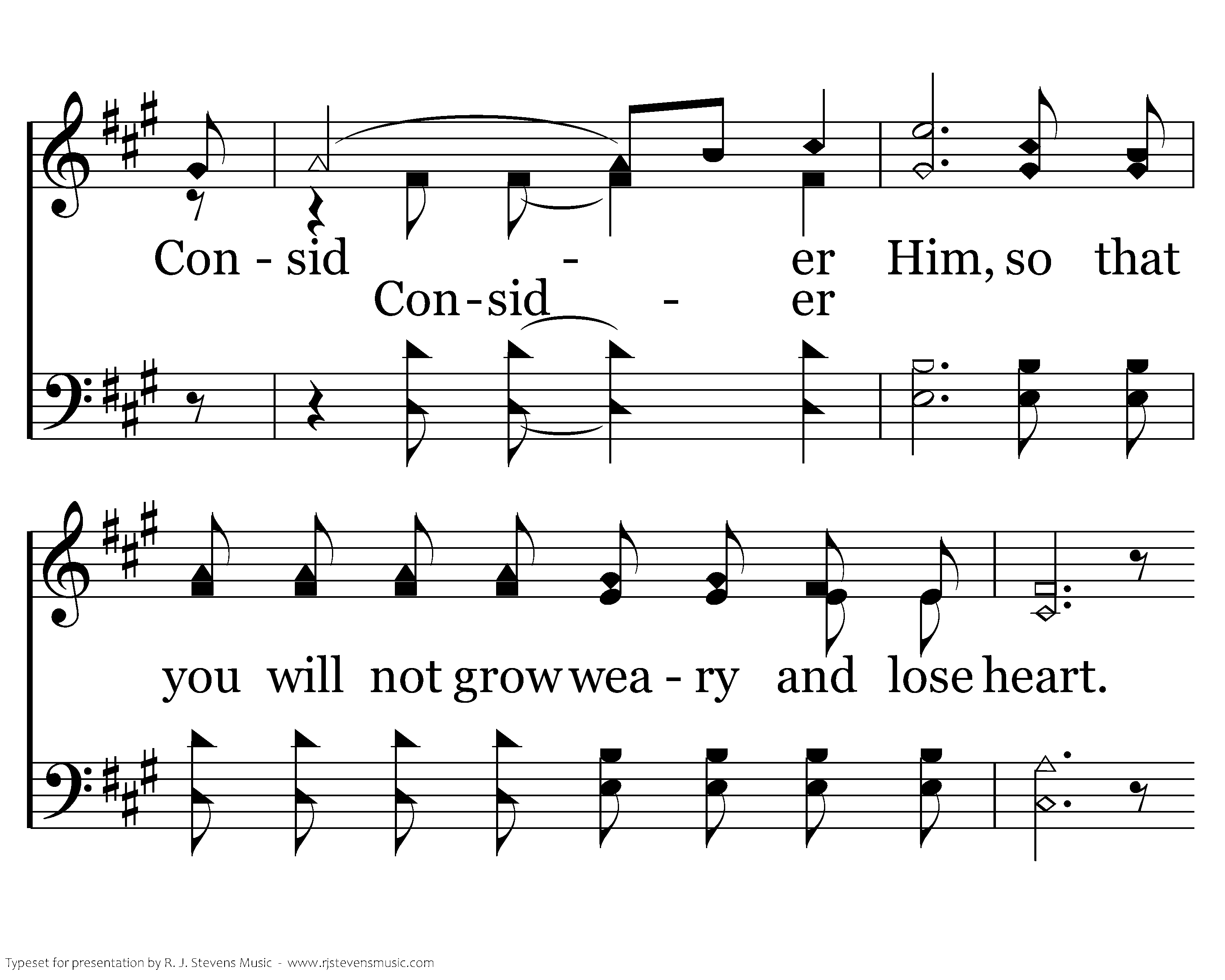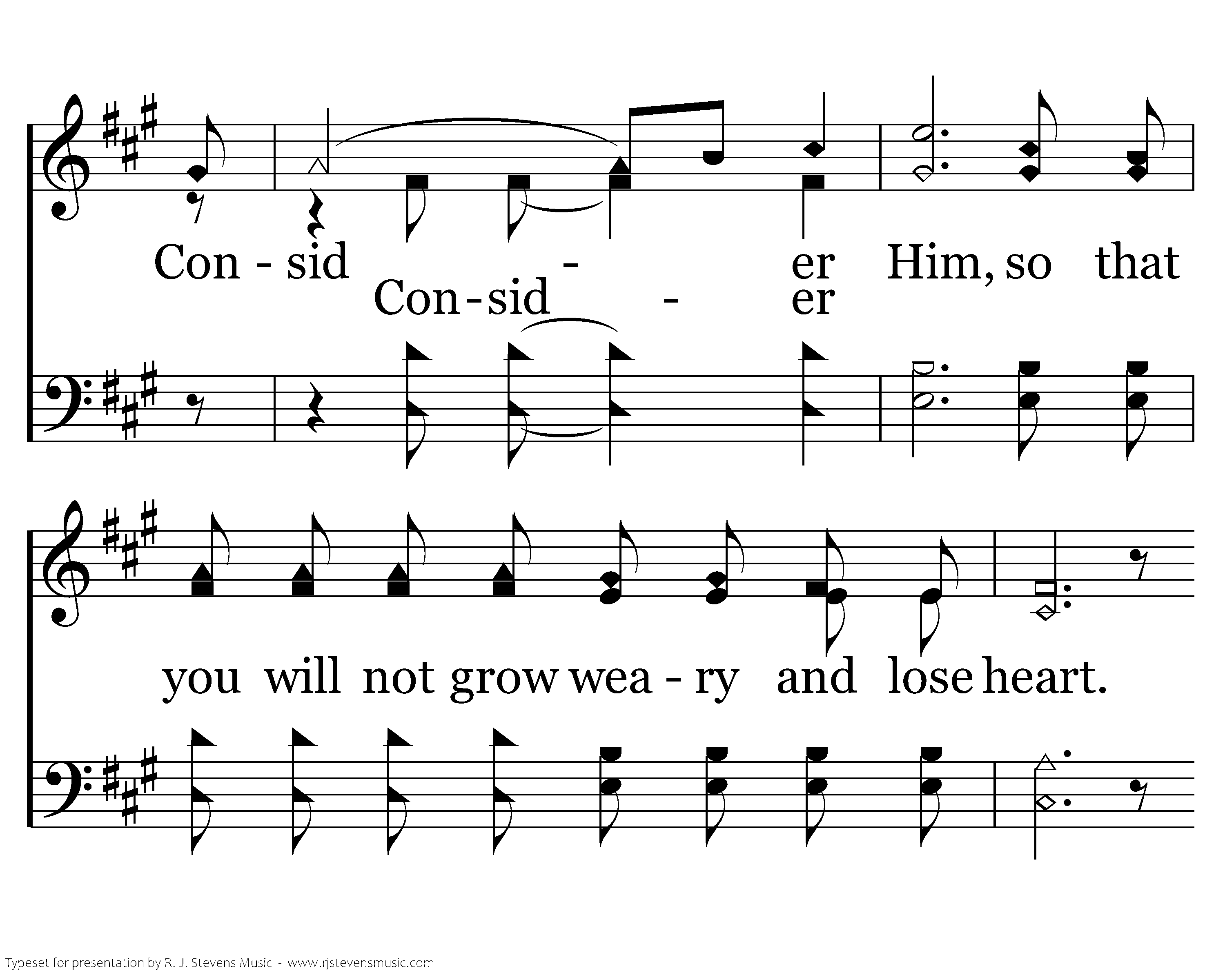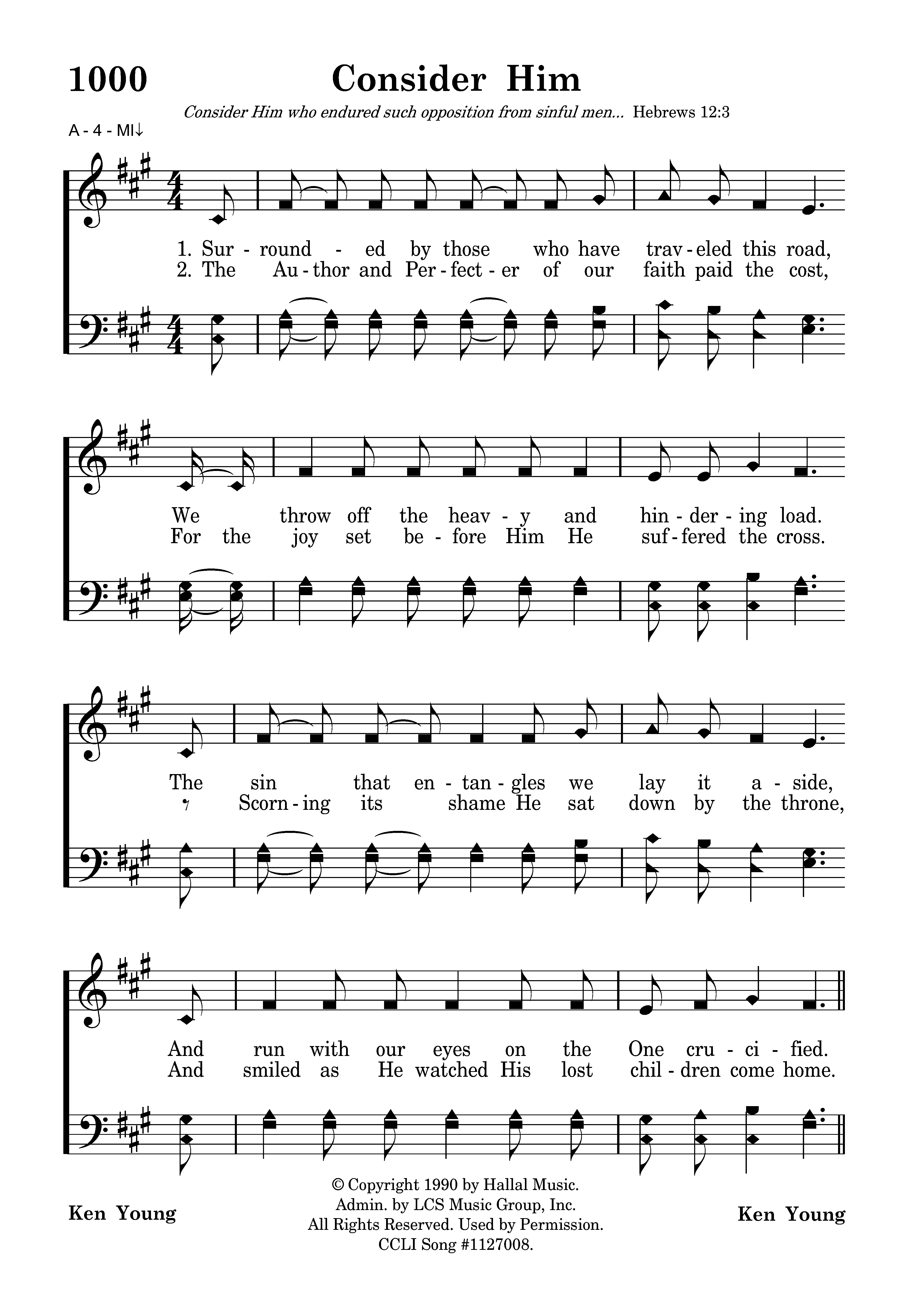 Surrounded by those who have traveled this road, We throw off the heavy and hindering load. The sin that entangles we lay it aside, And run with our eyes on the One crucified. Consider Him, who endured such opposition from sinful men. Consider Him, so that you will not grow weary and lose heart. Consider Him, consider Him.