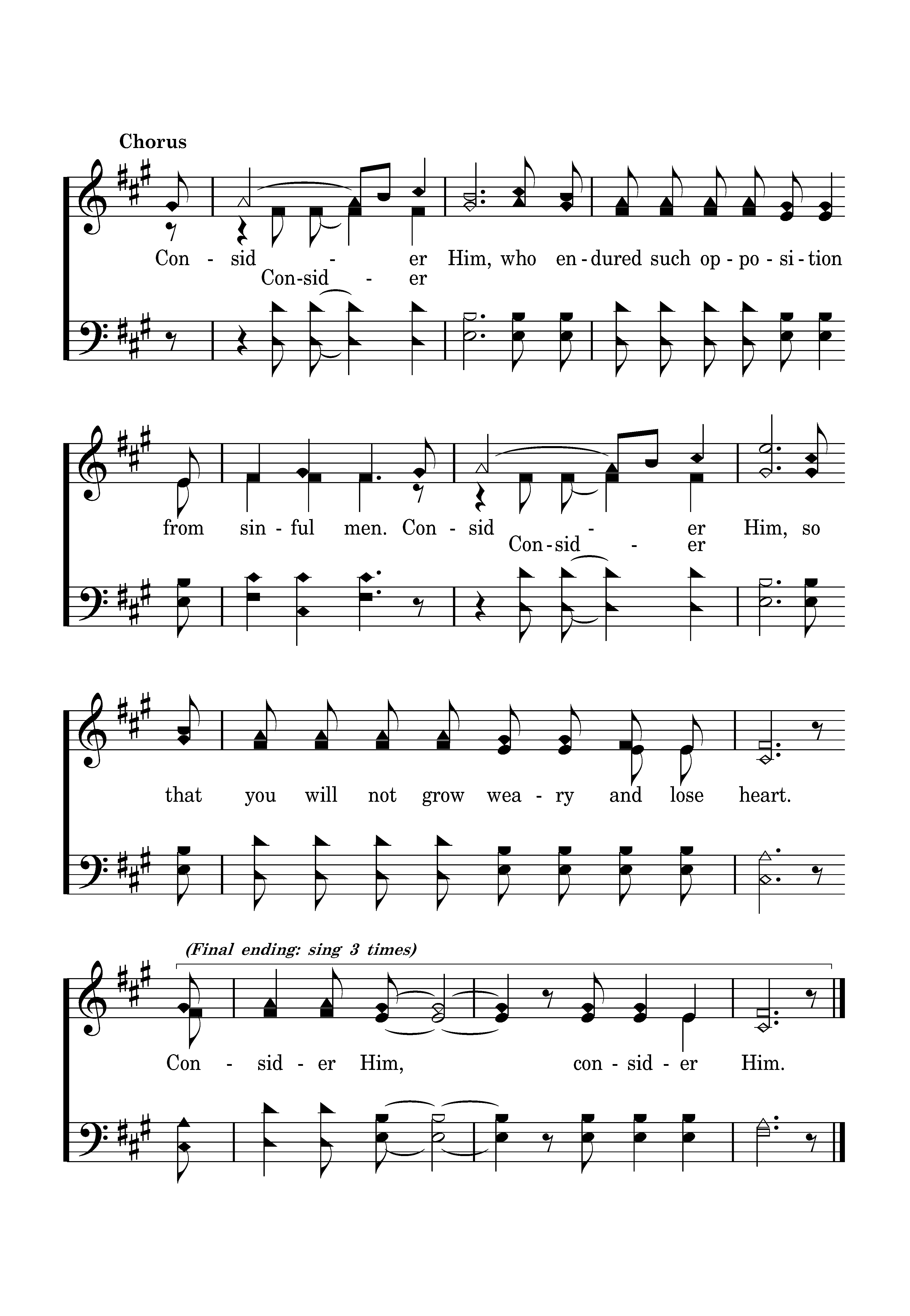 The Author and Perfecter of our faith paid the cost, For the joy set before Him He suffered the cross. Scorning its shame He sat down by the throne, And smiled as He watched His lost children come home. Consider Him, who endured such opposition from sinful men. Consider Him, so that you will not grow weary and lose heart. Consider Him, consider Him.