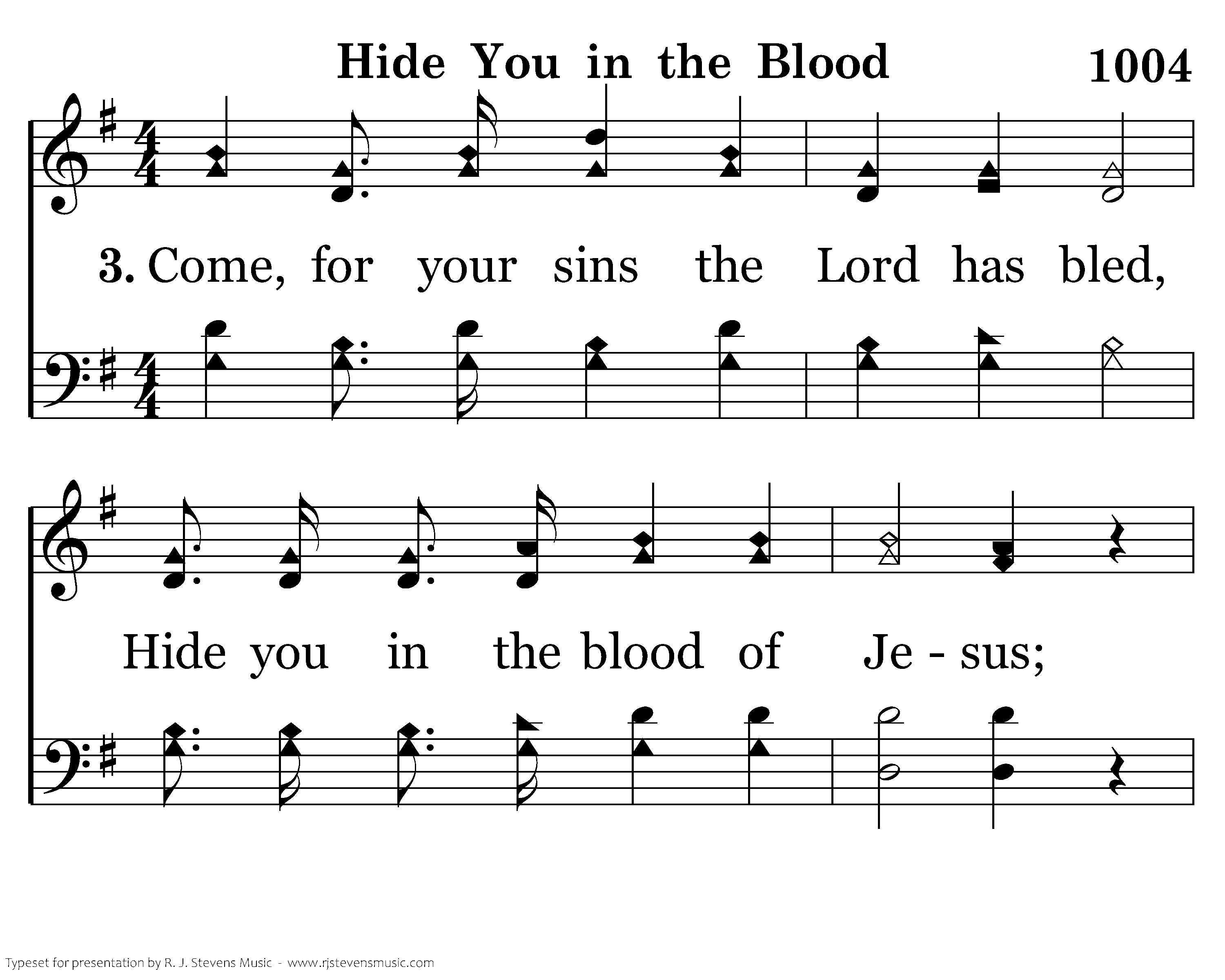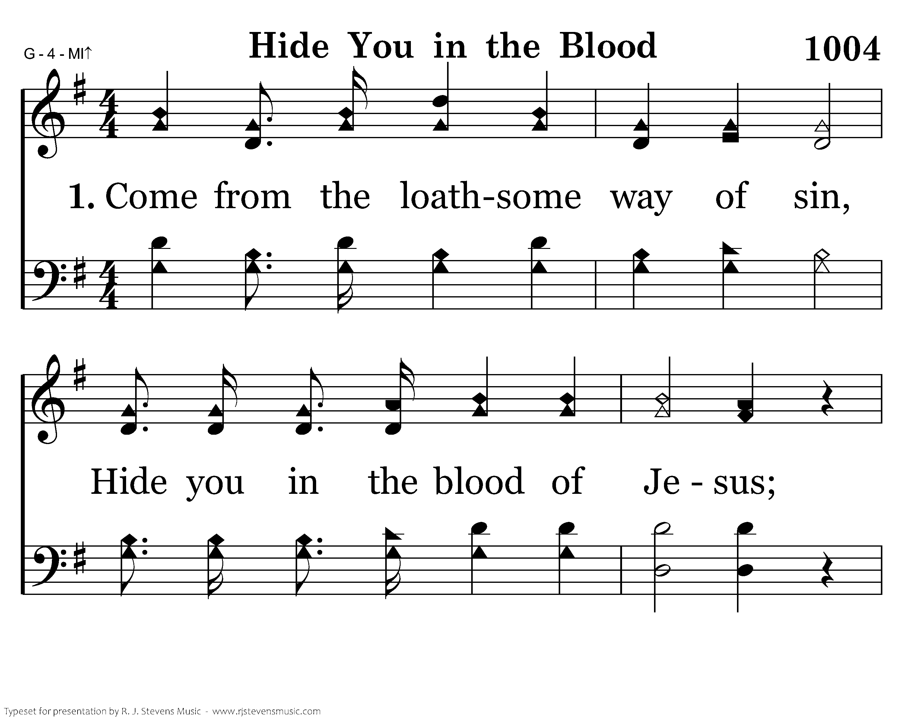 Come from the loathsome way of sin, Hide you in the blood of Jesus; Come, for the Lord will take you in, Hide you in the blood of Jesus.