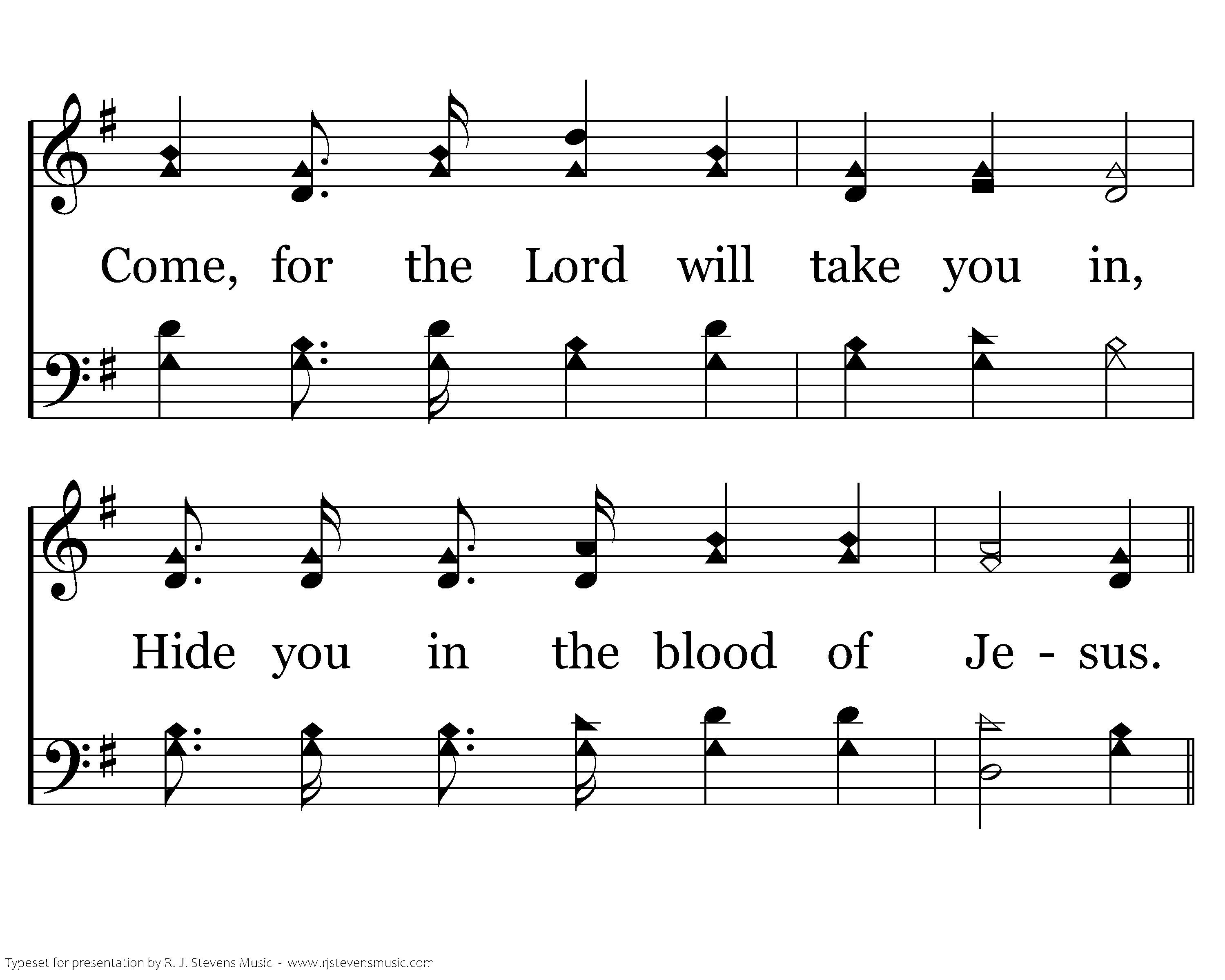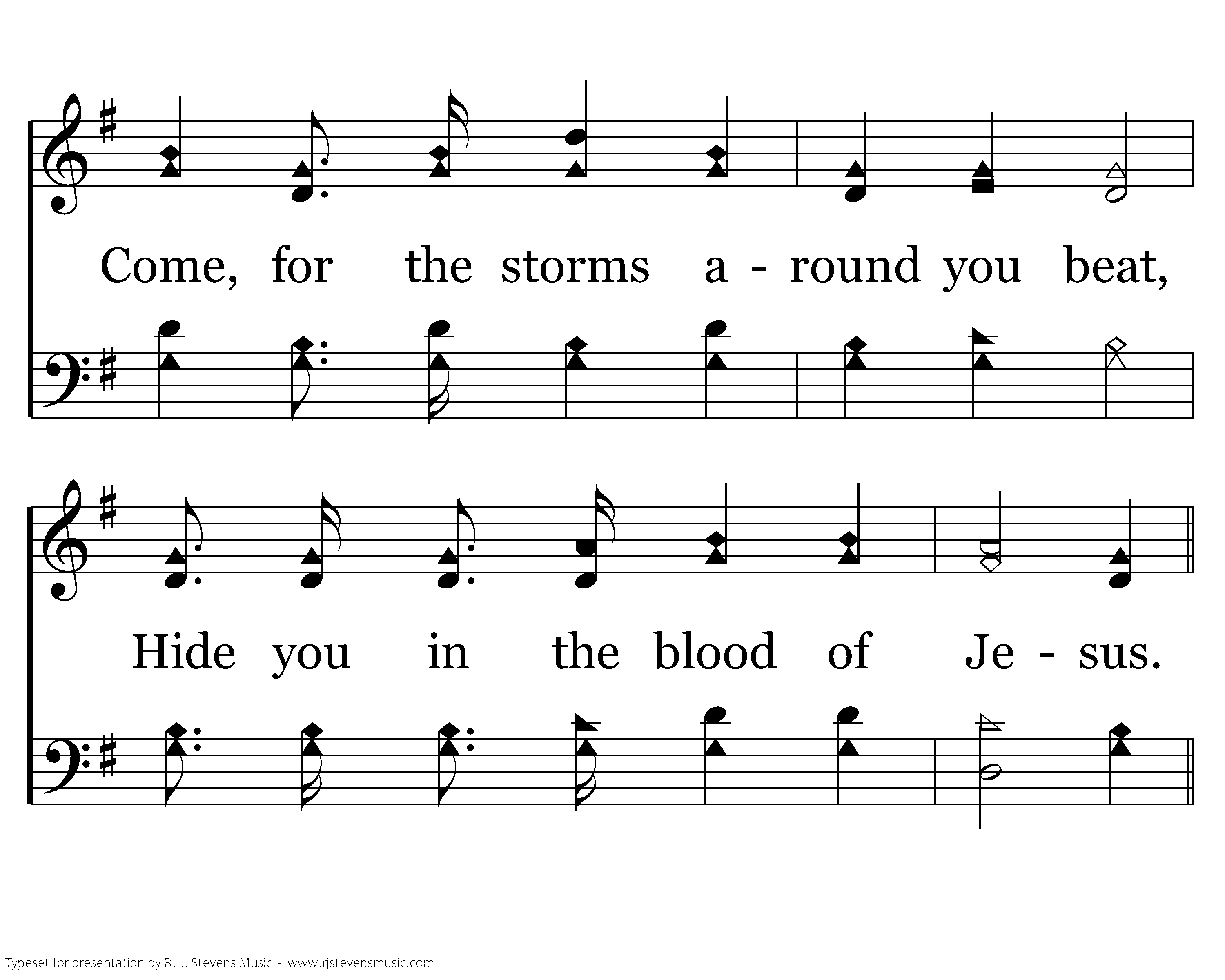 Come to the shelter's safe retreat, Hide you in the blood of Jesus; Come, for the storms around you beat, Hide you in the blood of Jesus.