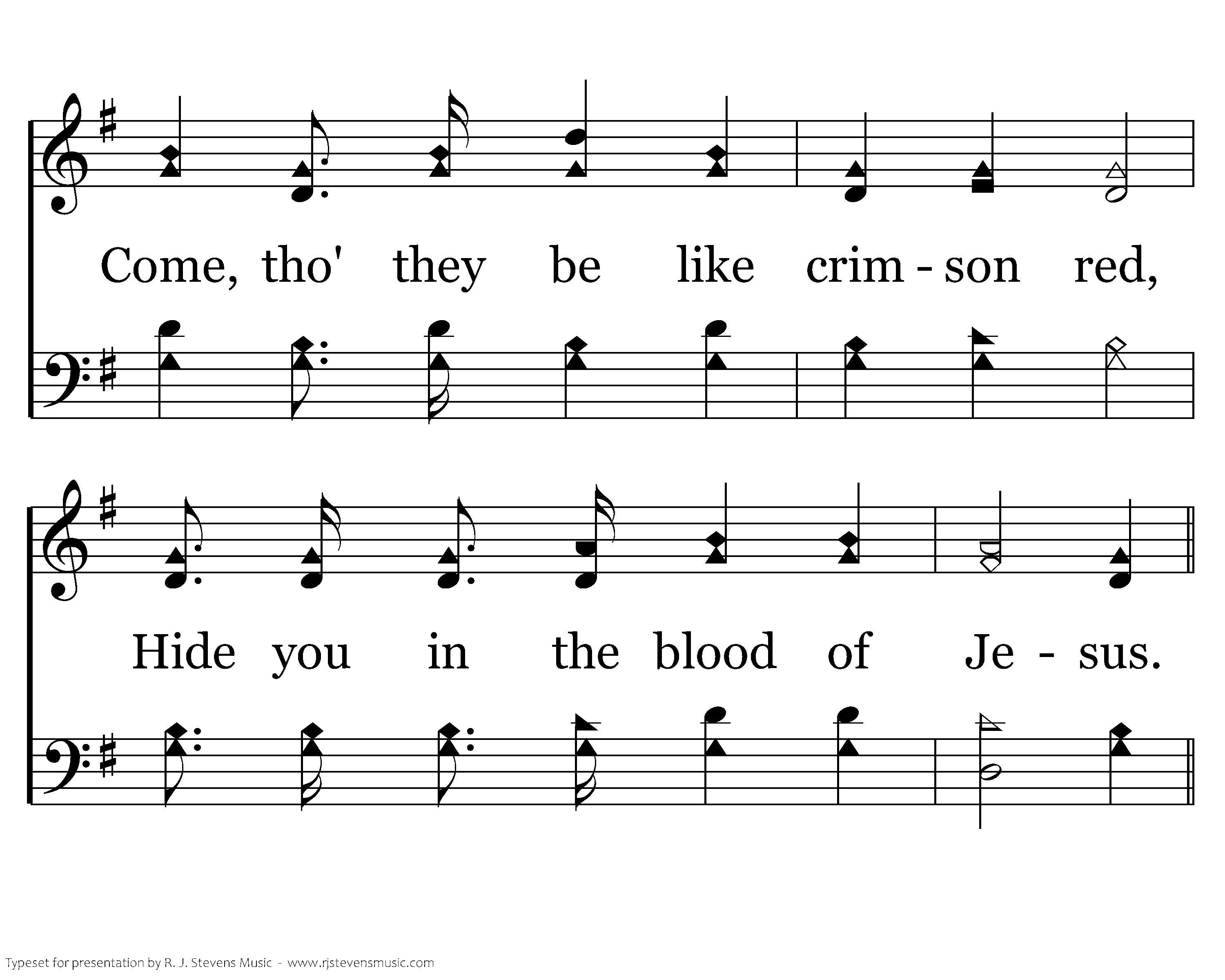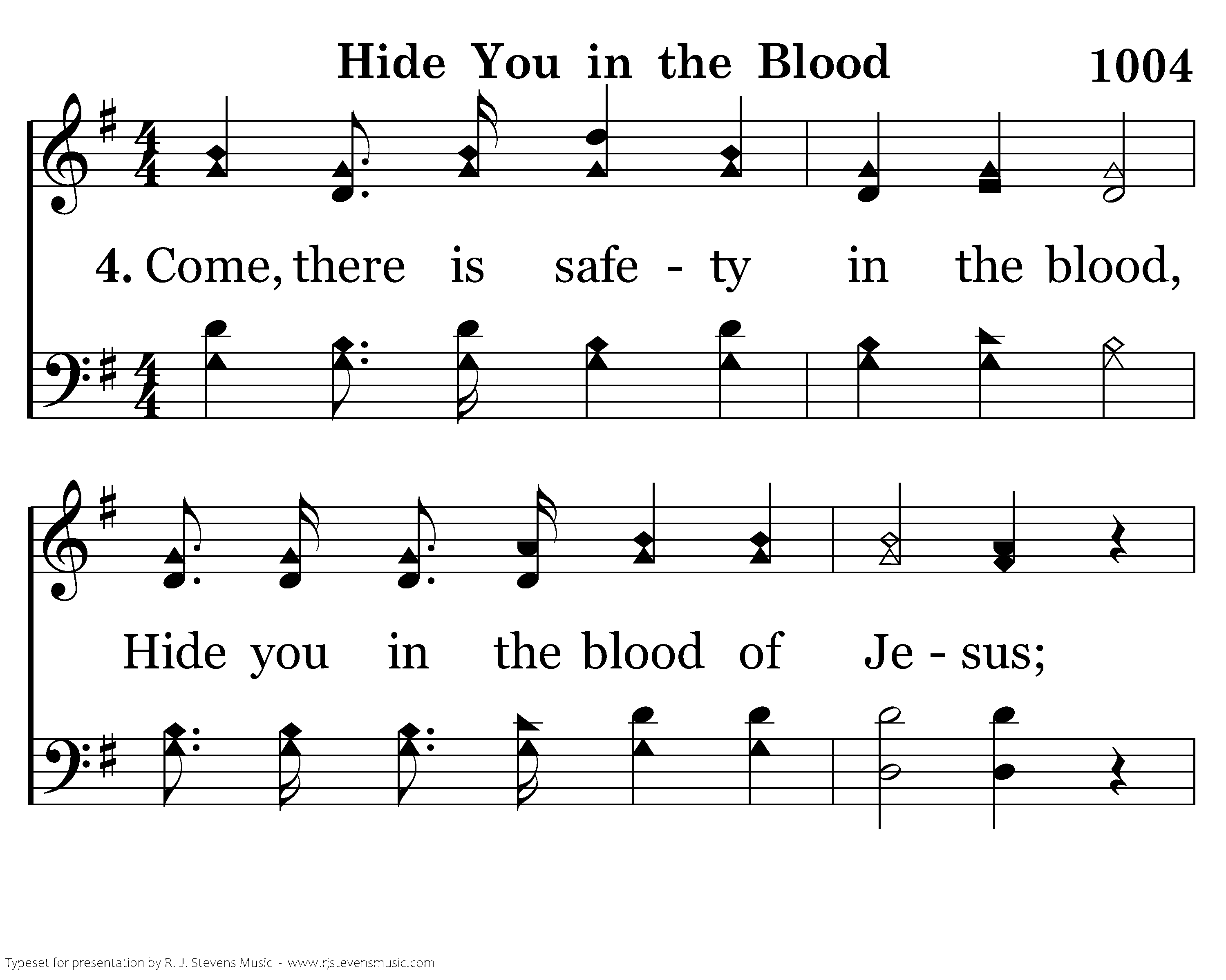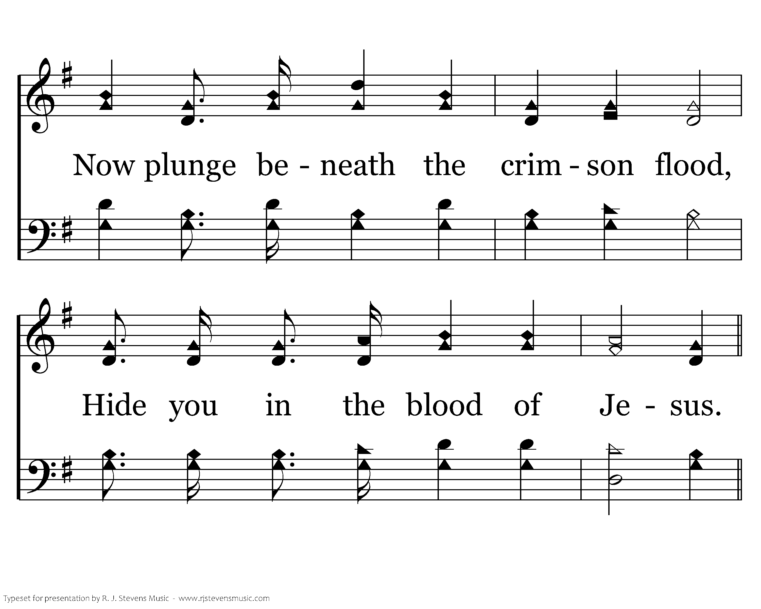 Come, there is safety in the blood, Hide you in the blood of Jesus; Now plunge beneath the crimson flood, Hide you in the blood of Jesus.