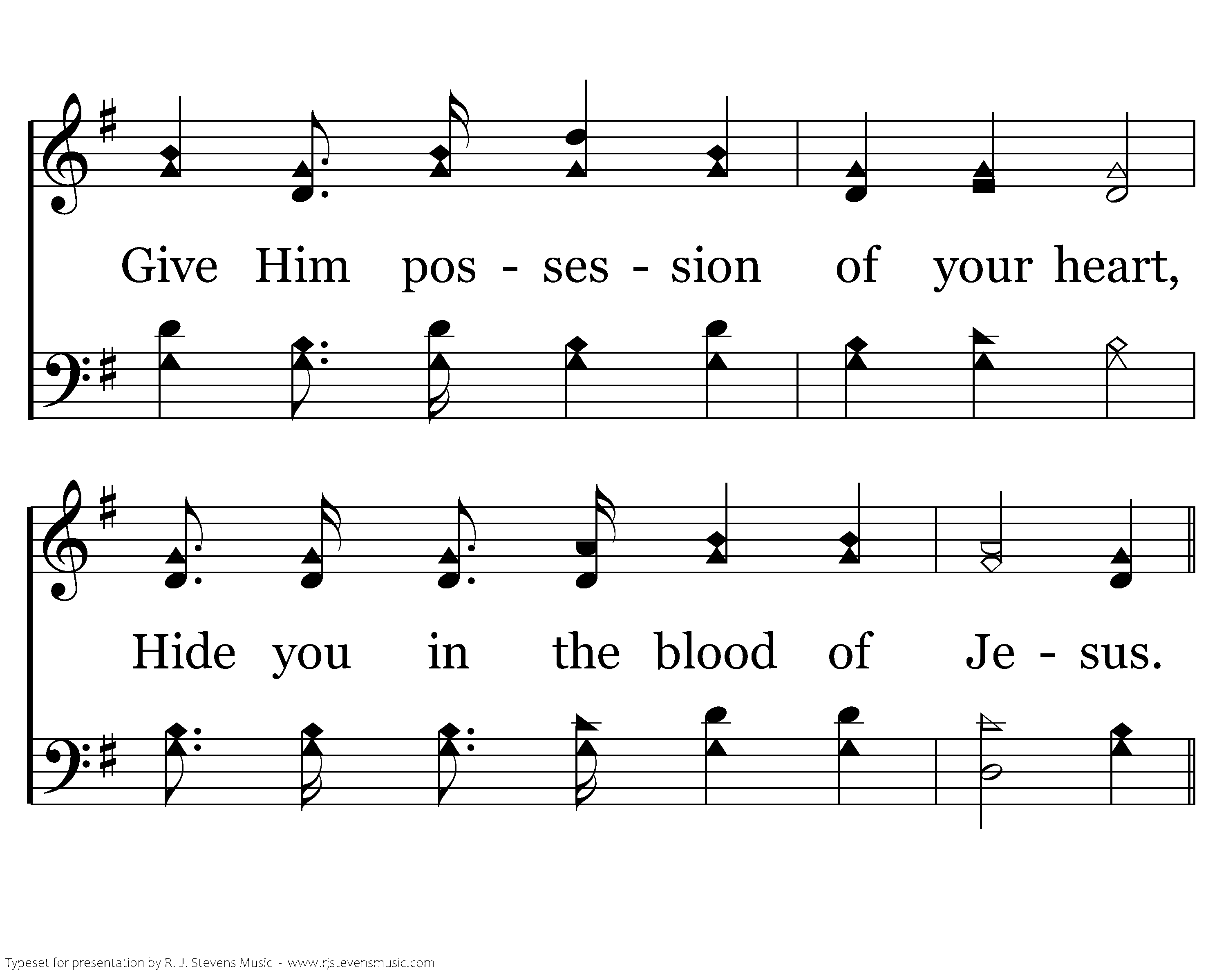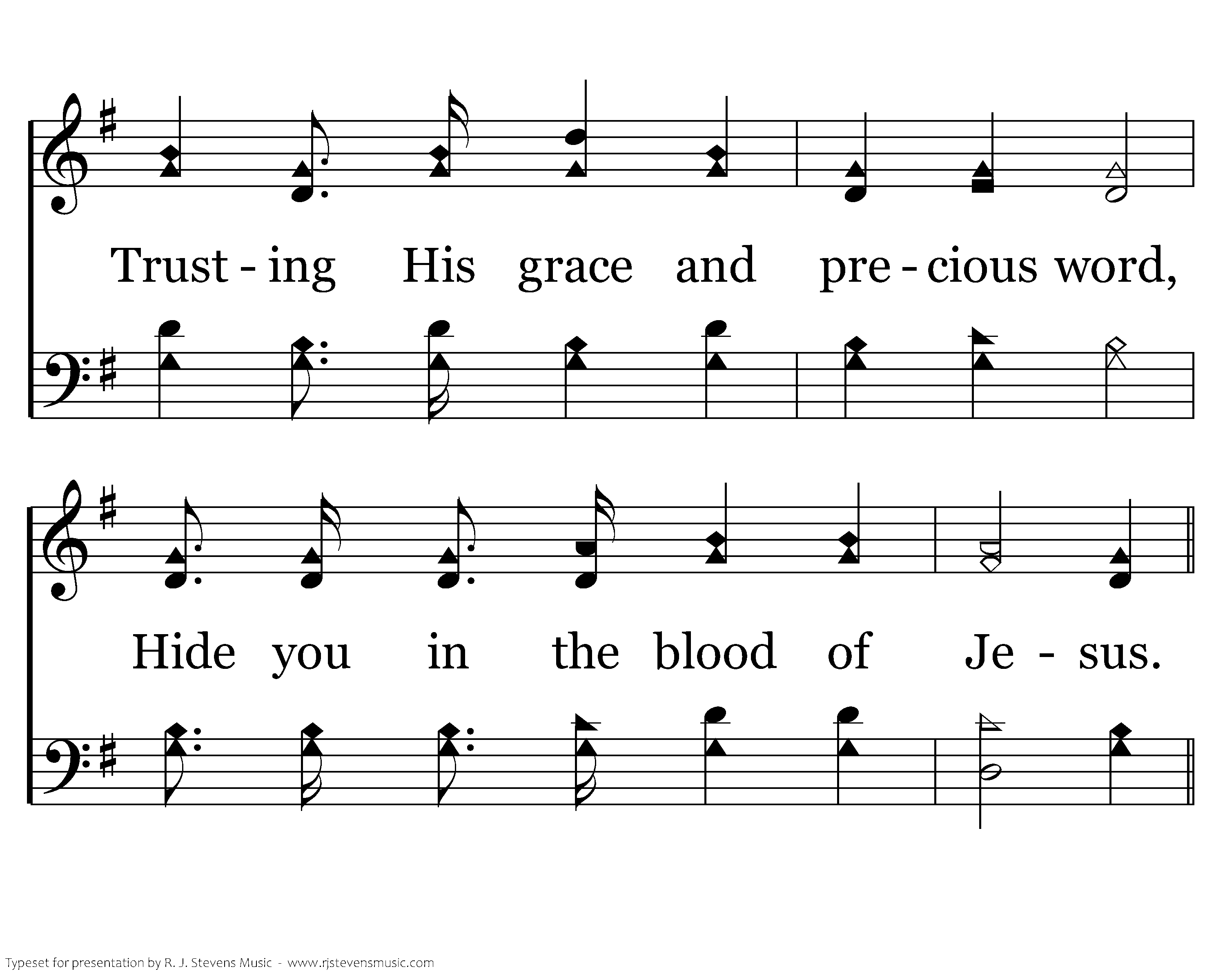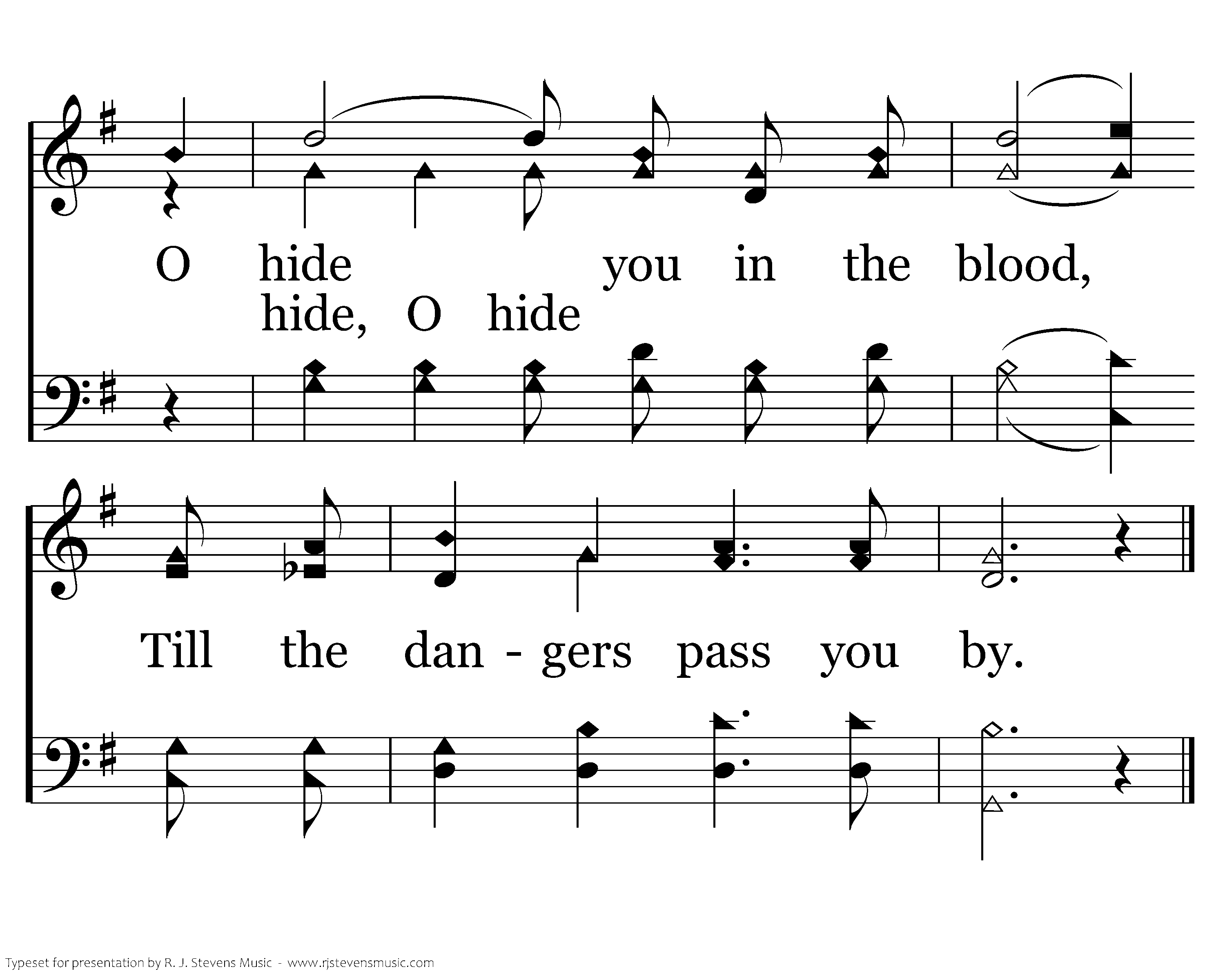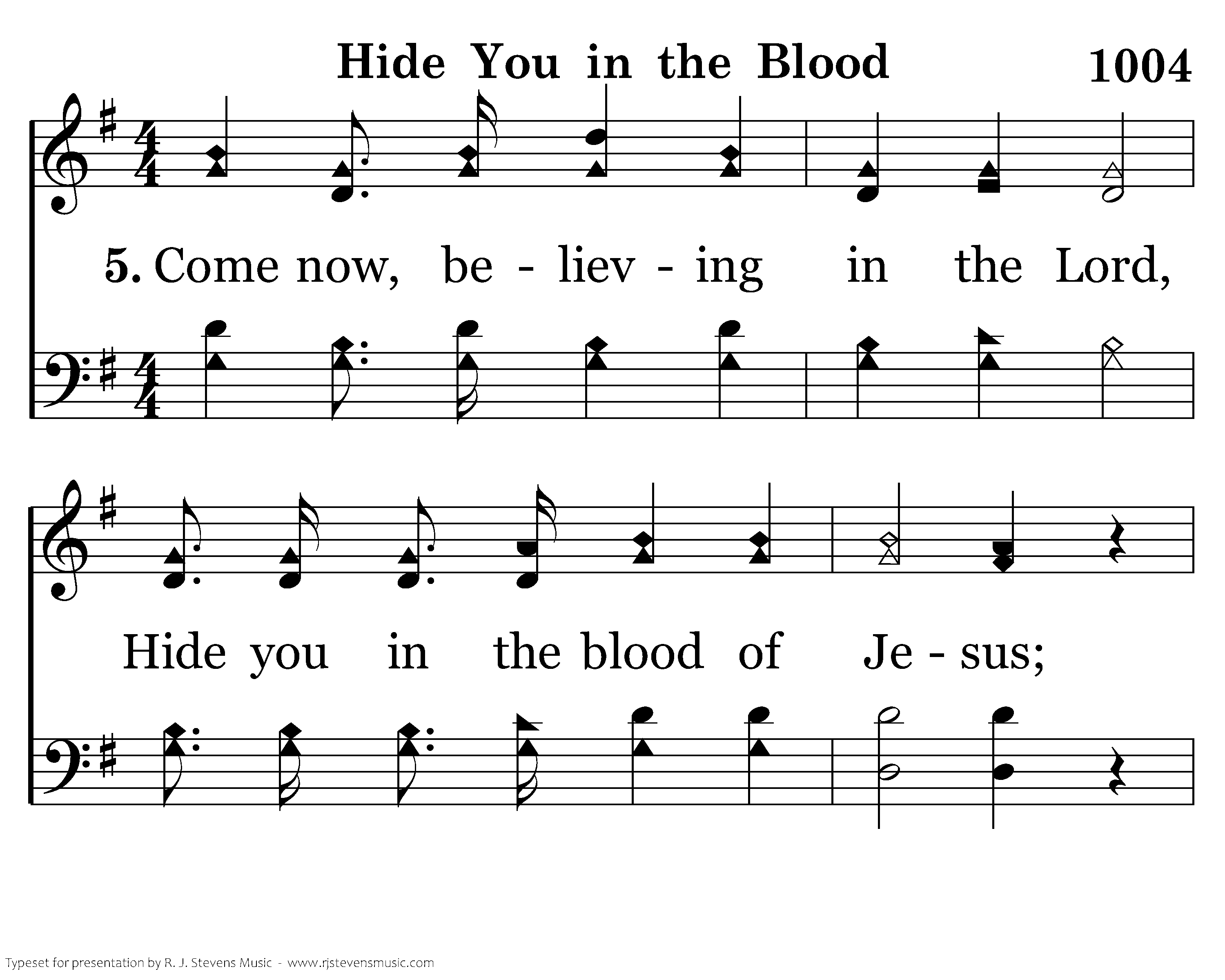 Come, there is safety in the blood, Hide you in the blood of Jesus; Now plunge beneath the crimson flood, Hide you in the blood of Jesus.