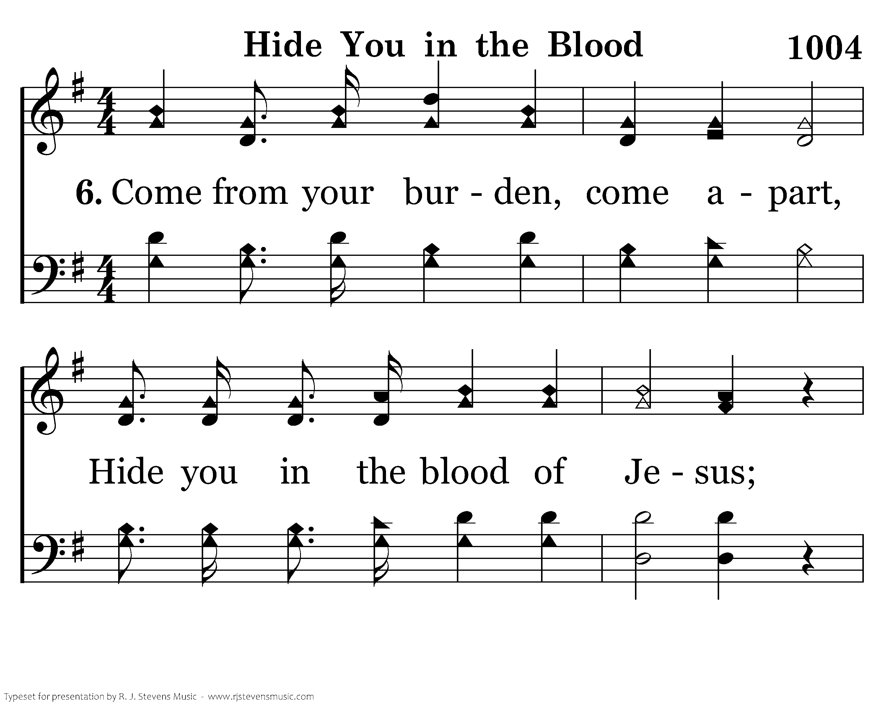Come from your burden, come apart, Hide you in the blood of Jesus; Give Him possession of your heart, Hide you in the blood of Jesus.