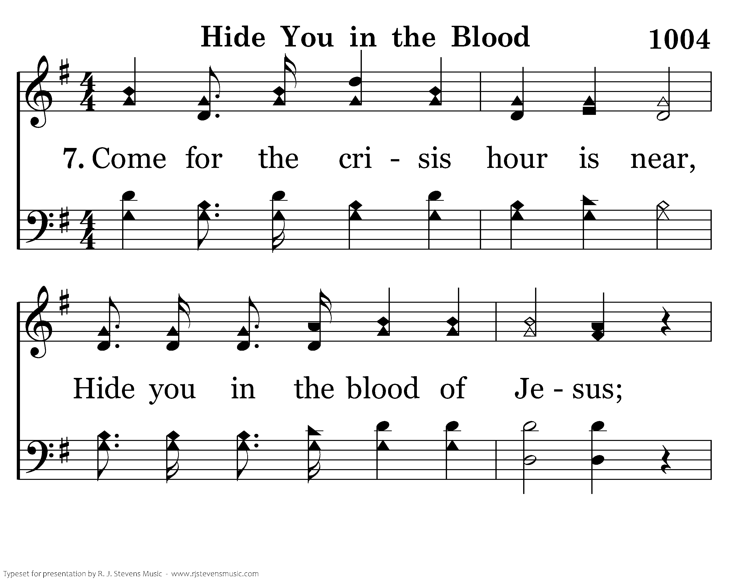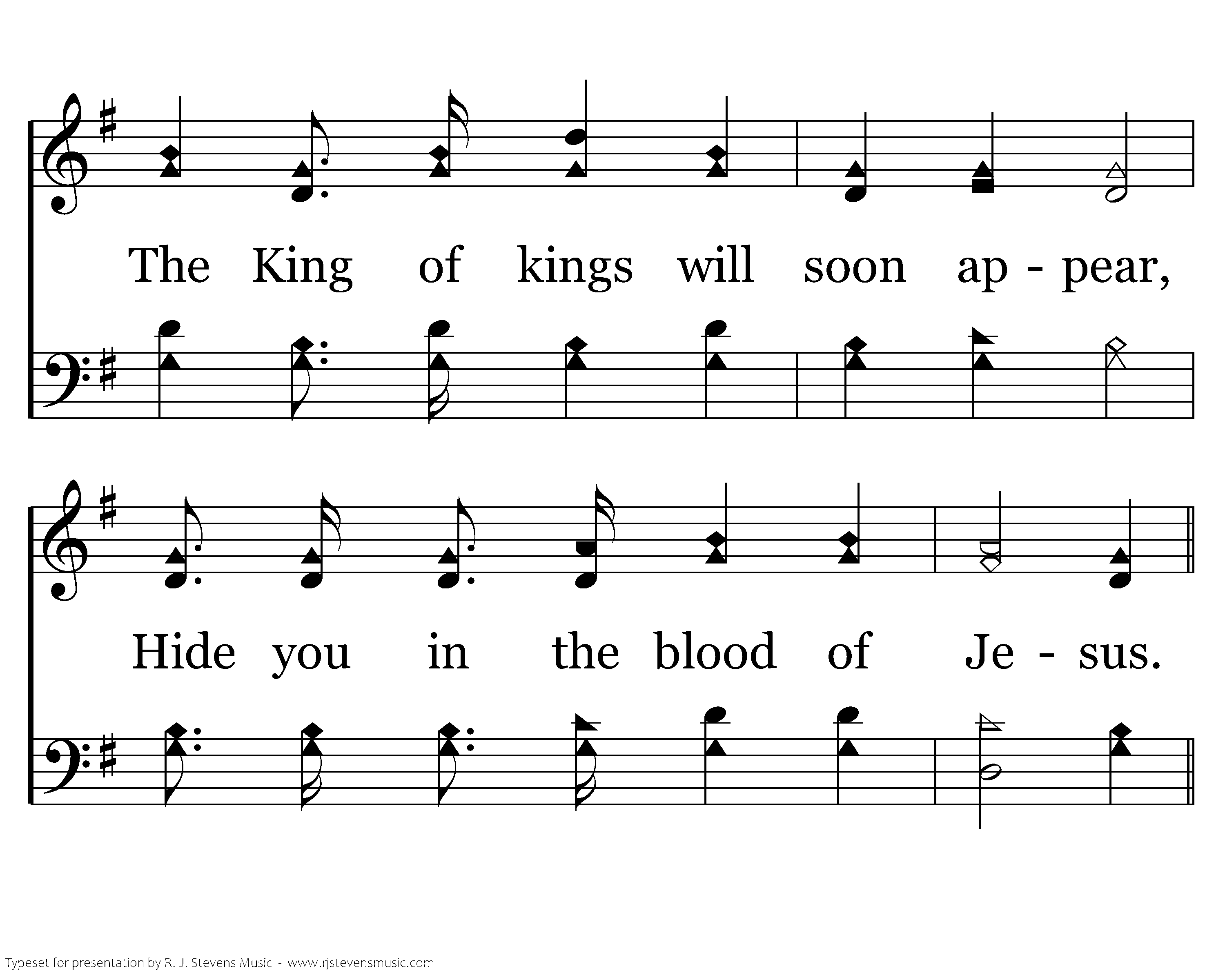 Come for the crisis hour is near, Hide you in the blood of Jesus; The King of kings will soon appear, Hide you in the blood of Jesus.