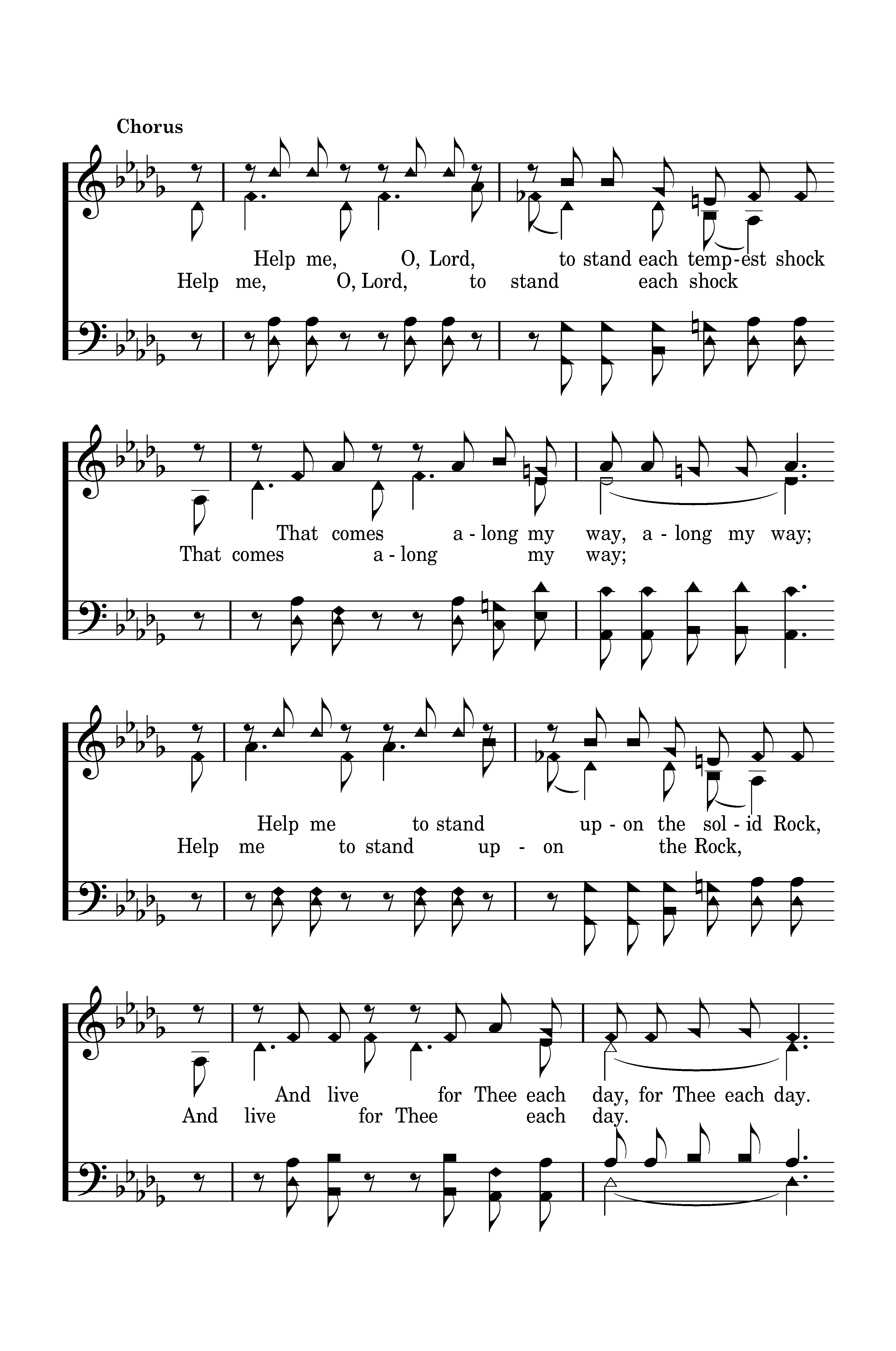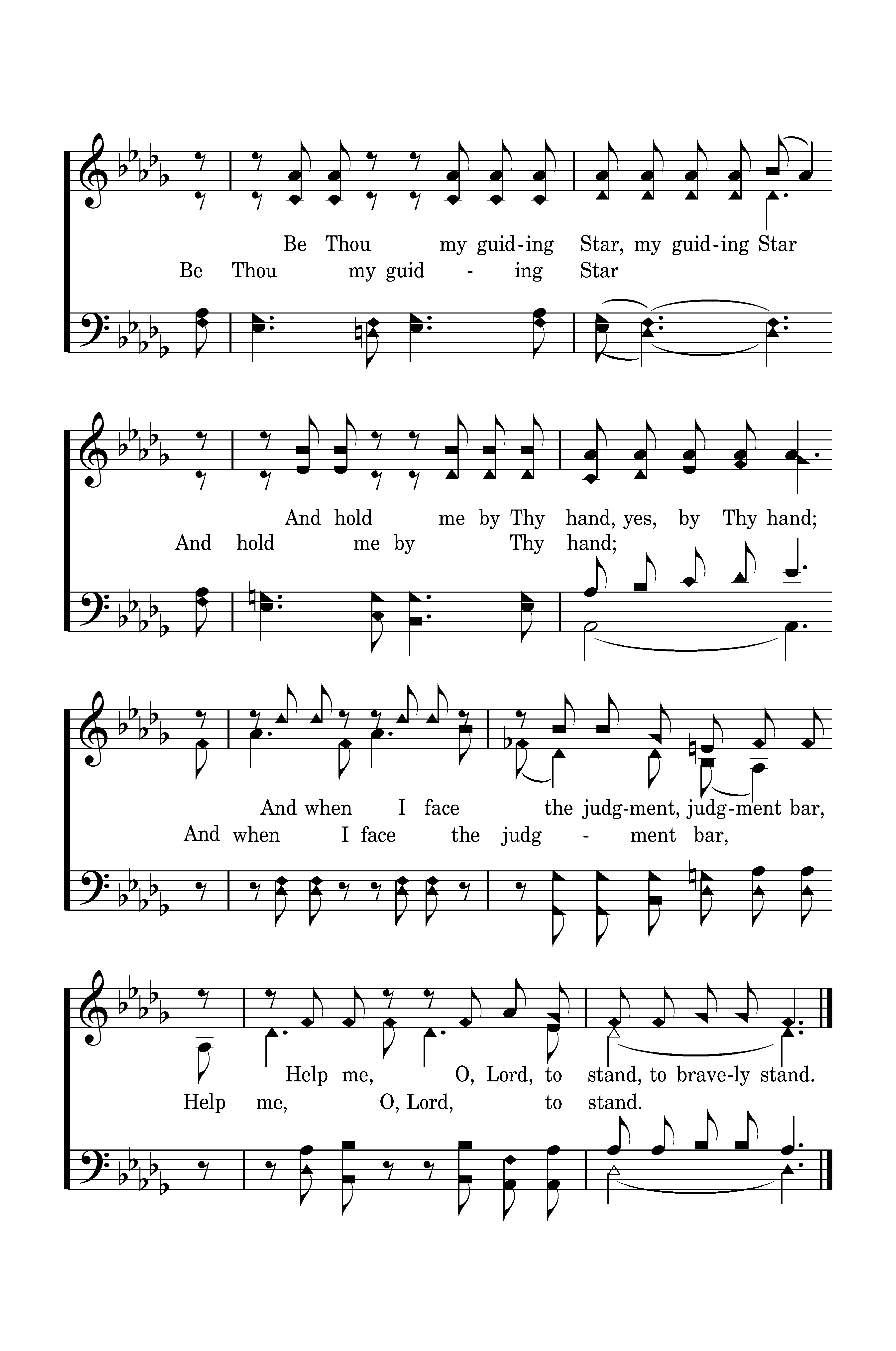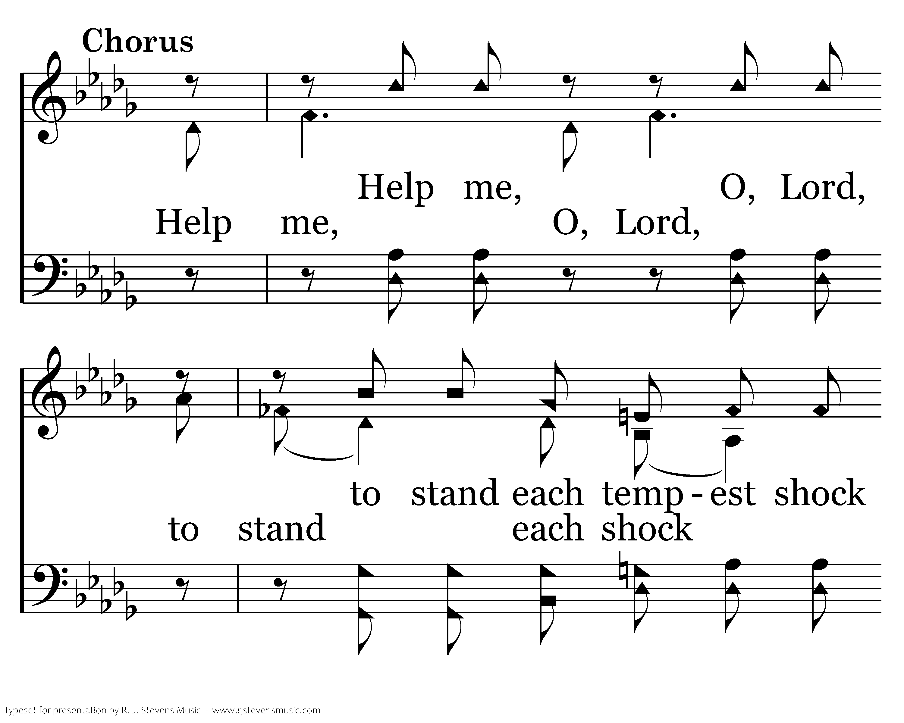 Help me, O, Lord, to stand each tempest shock That comes along my way, along my way; Help me to stand upon the solid Rock, And live for Thee each day, for Thee each day. Be Thou my guiding Star, my guiding Star And hold me by Thy hand, yes, by Thy hand; And when I face the judgment, judgment bar, Help me, O, Lord, to stand, to bravely stand.