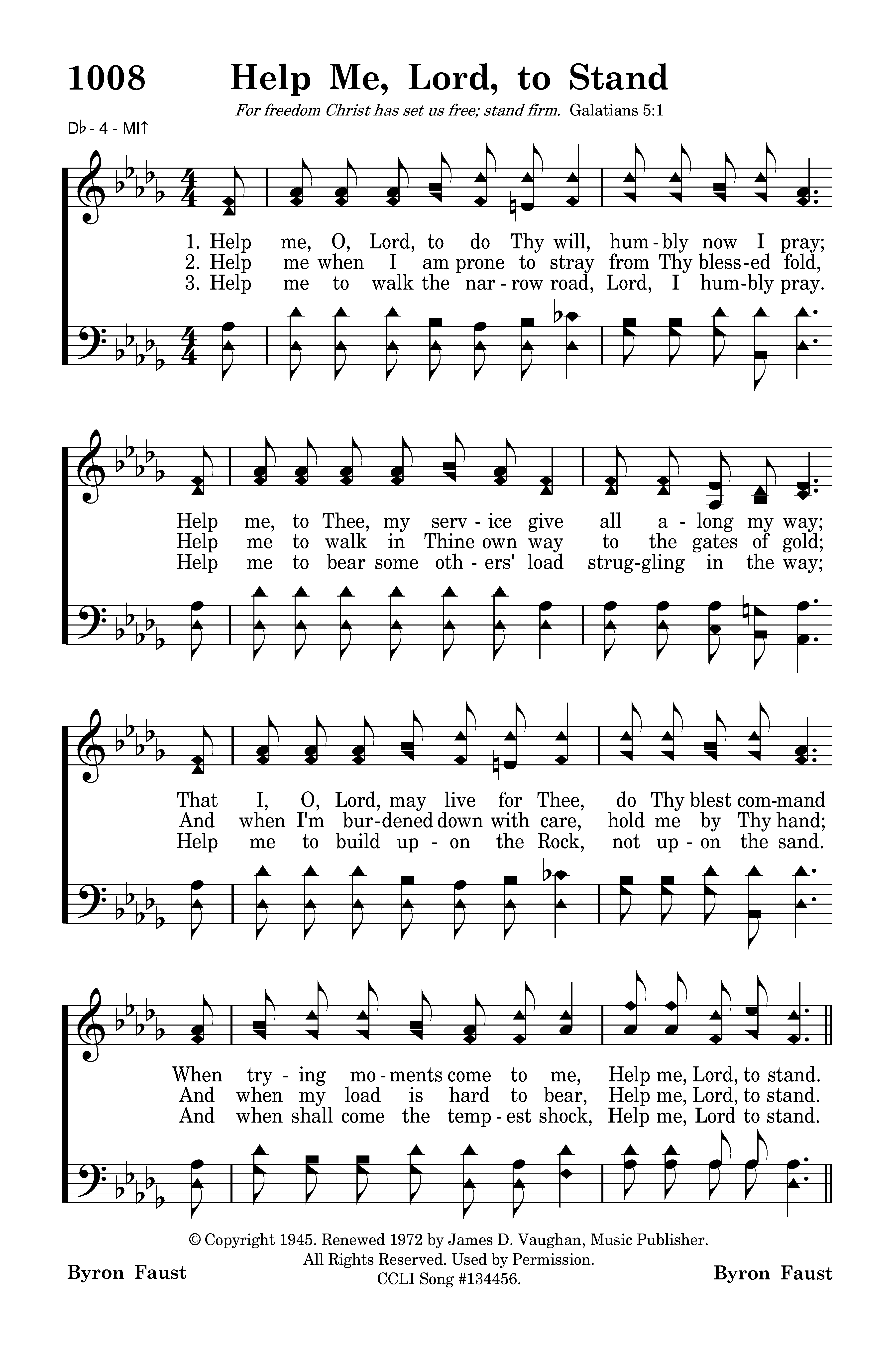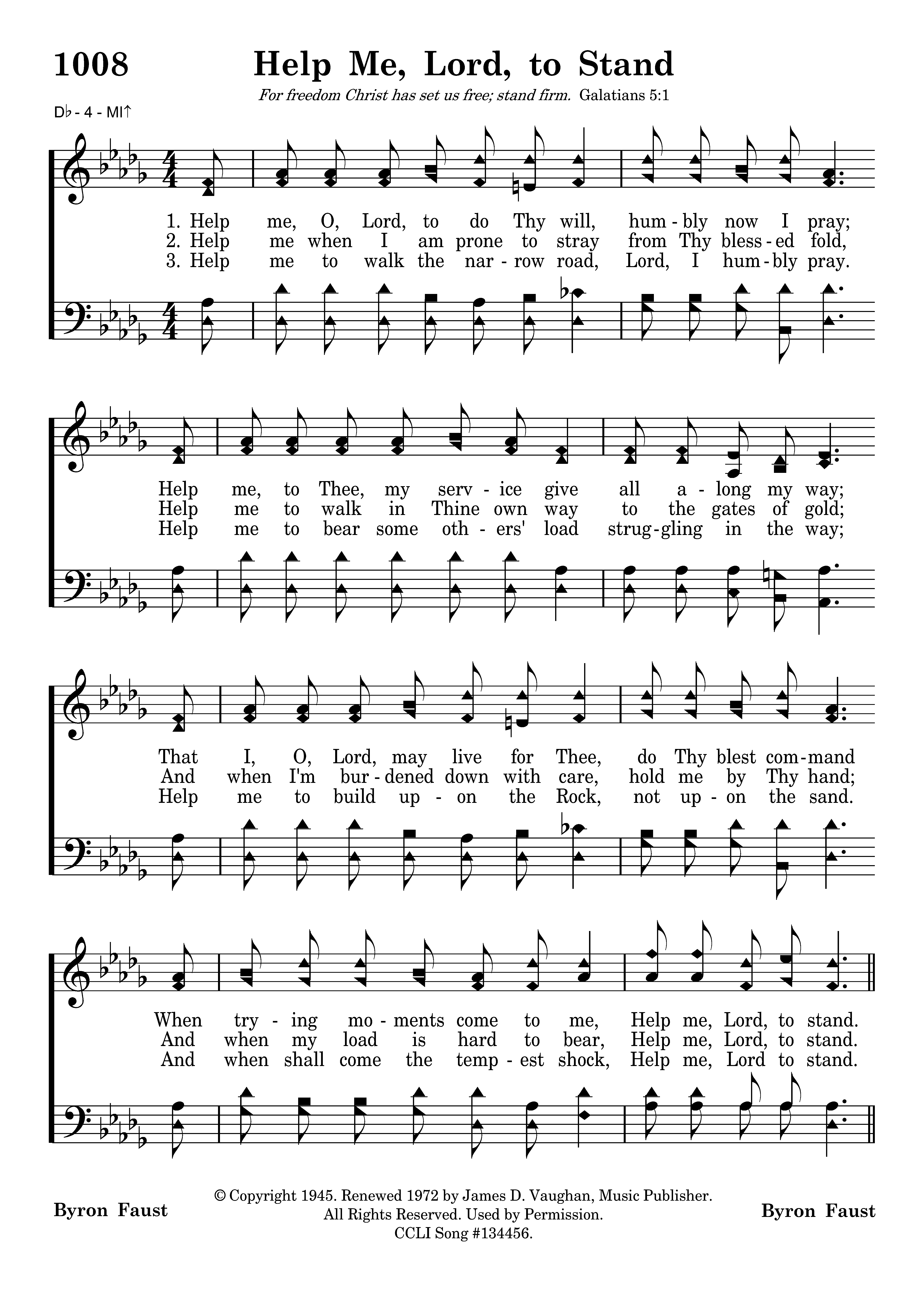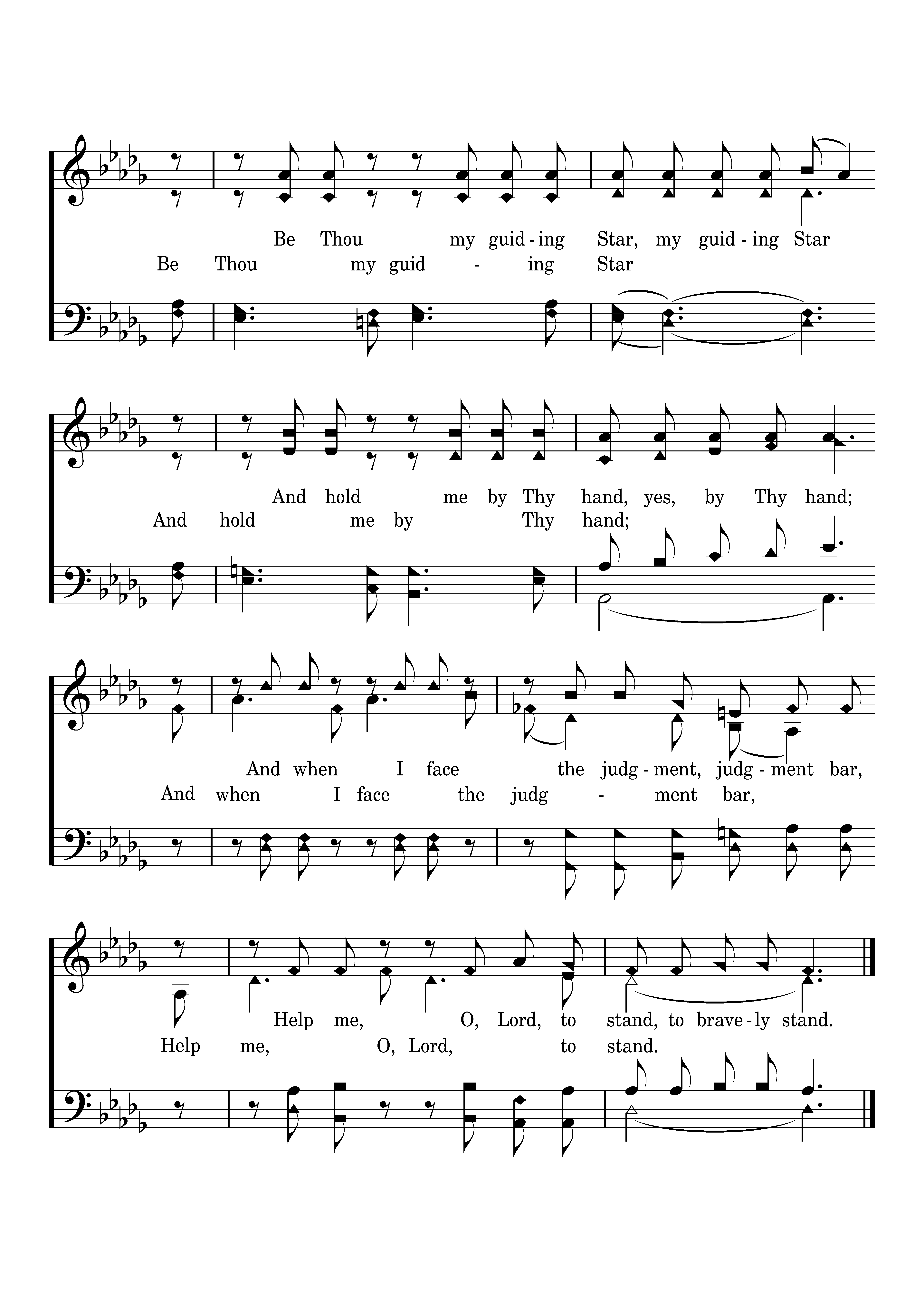 Help me, O, Lord, to stand each tempest shock That comes along my way, along my way; Help me to stand upon the solid Rock, And live for Thee each day, for Thee each day. Be Thou my guiding Star, my guiding Star And hold me by Thy hand, yes, by Thy hand; And when I face the judgment, judgment bar, Help me, O, Lord, to stand, to bravely stand.