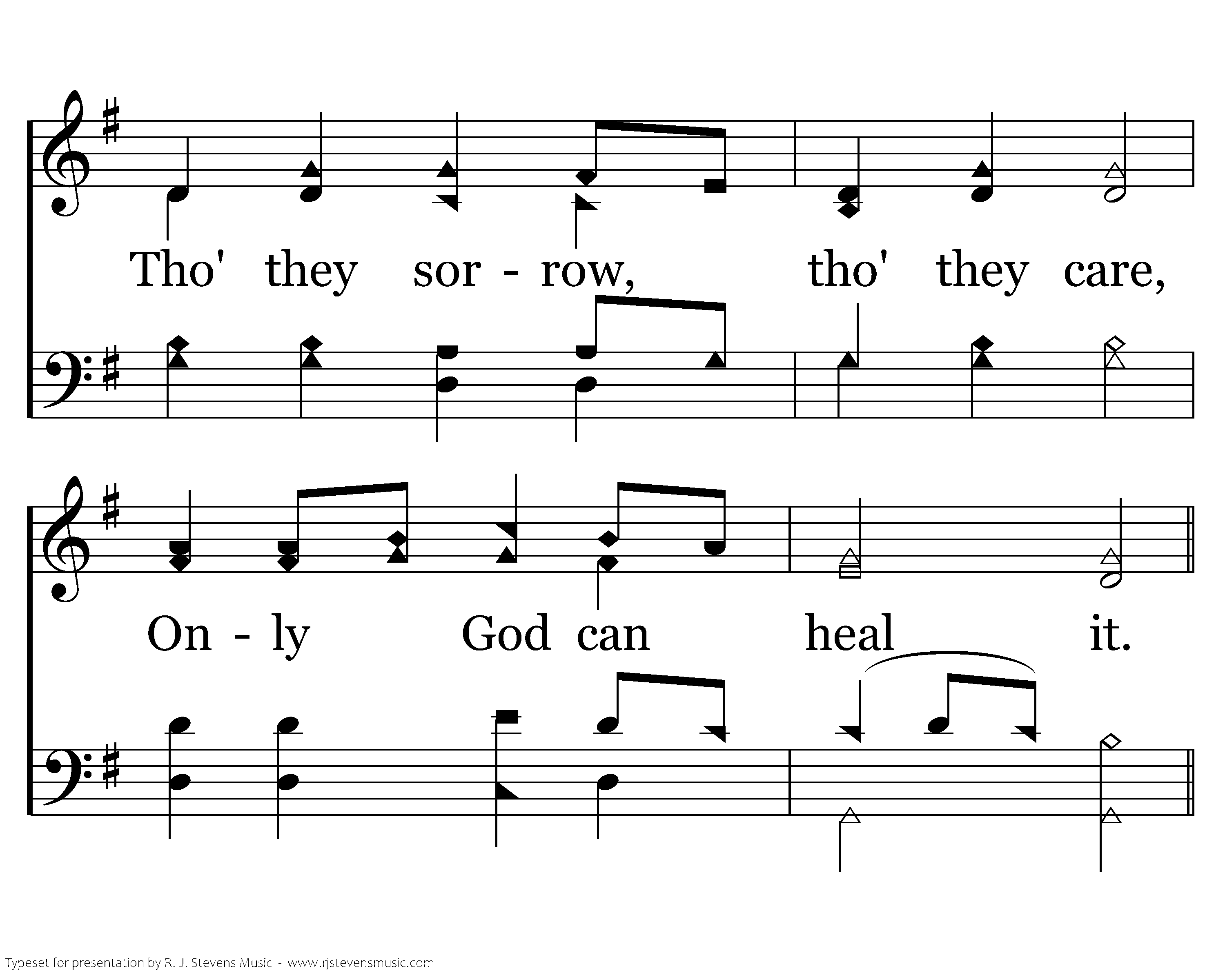 Sometimes pain is hard to bear, Pain so strong that loved ones feel it. Tho' they sorrow, tho' they care, Only God can heal it.