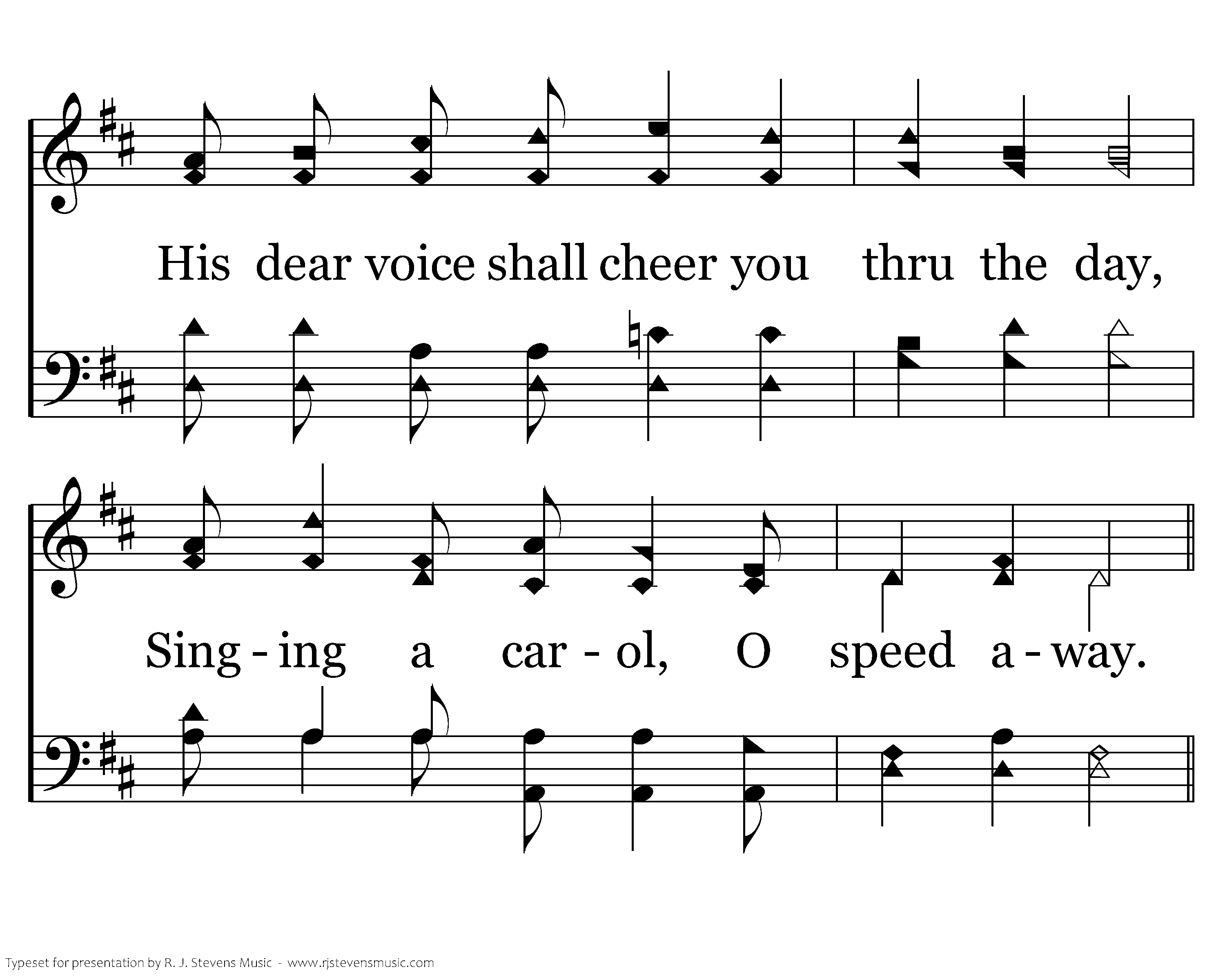 There to shield and help you He will be; Fruitage of your labors you shall see; His dear voice shall cheer you thru the day, Singing a carol, O speed away.