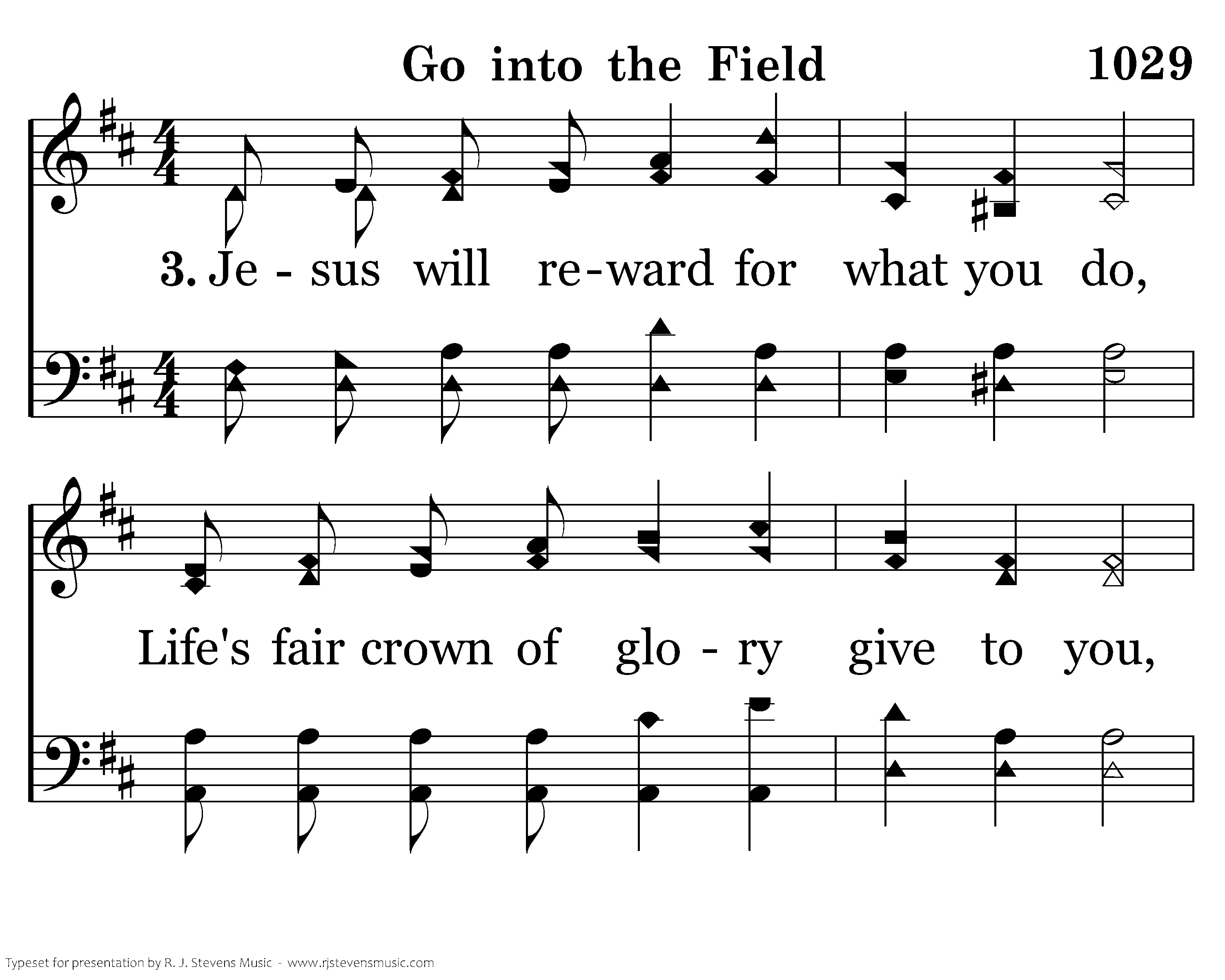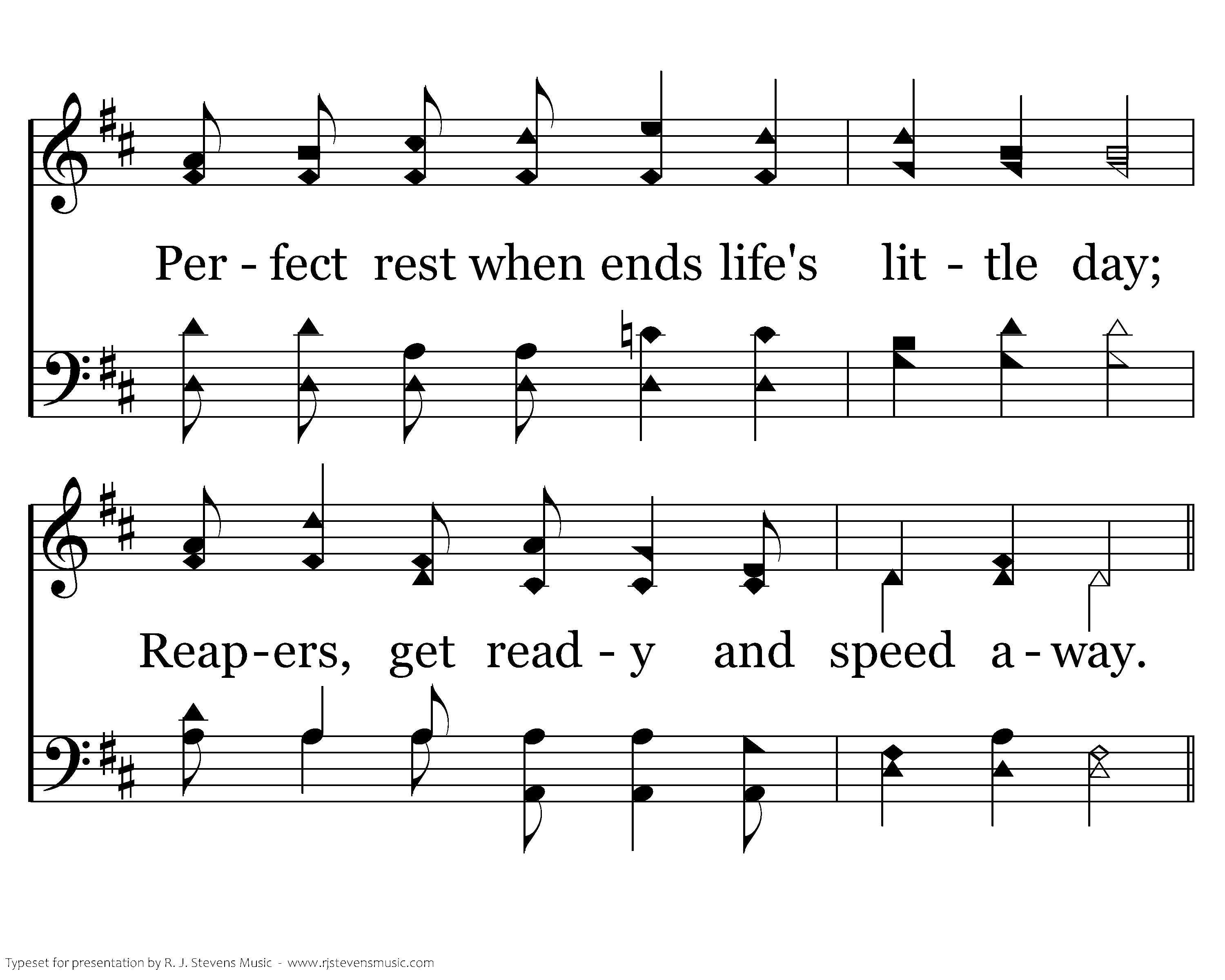 Jesus will reward for what you do, Life's fair crown of glory give to you, Perfect rest when ends life's little day; Reapers, get ready and speed away.