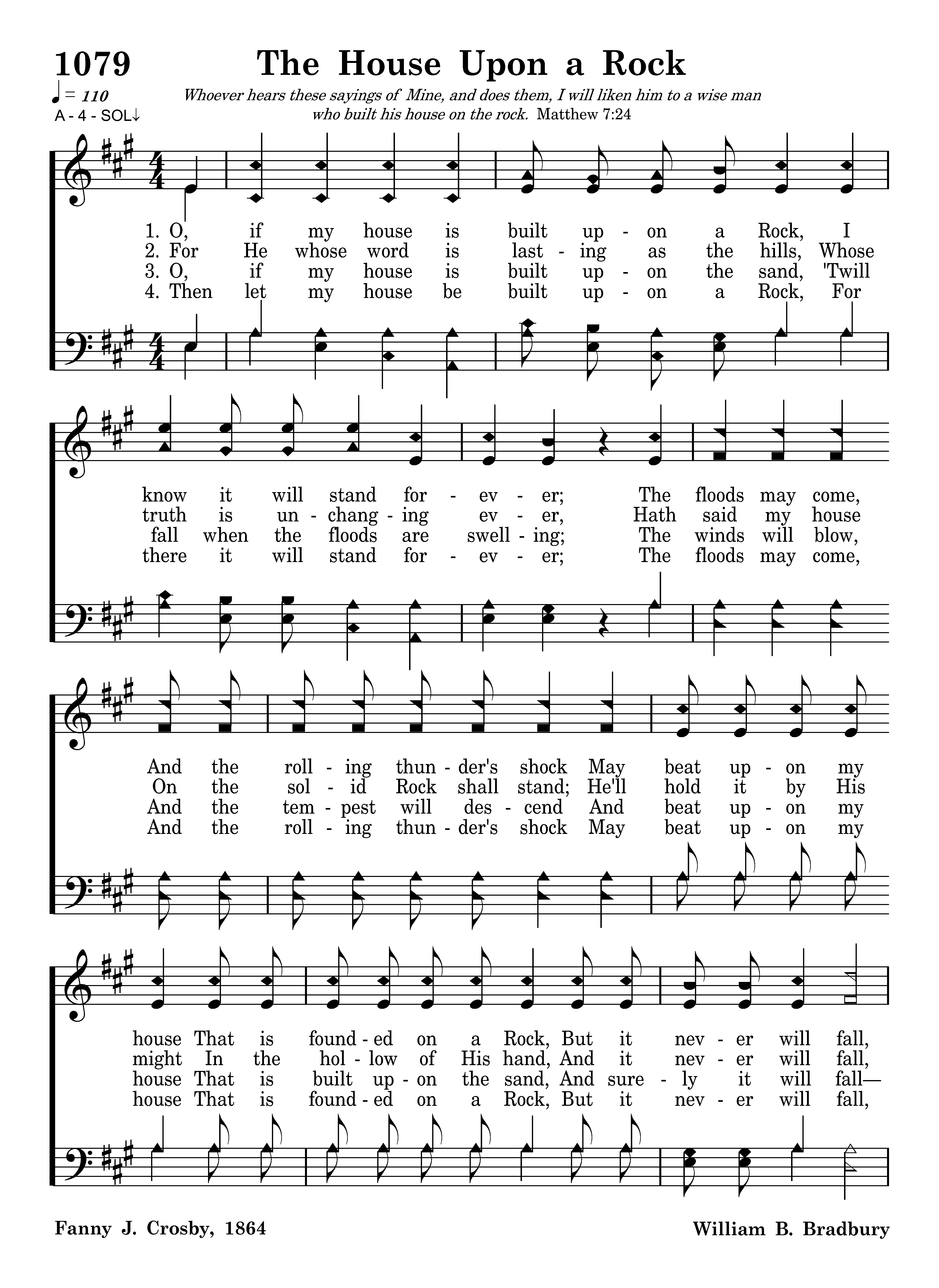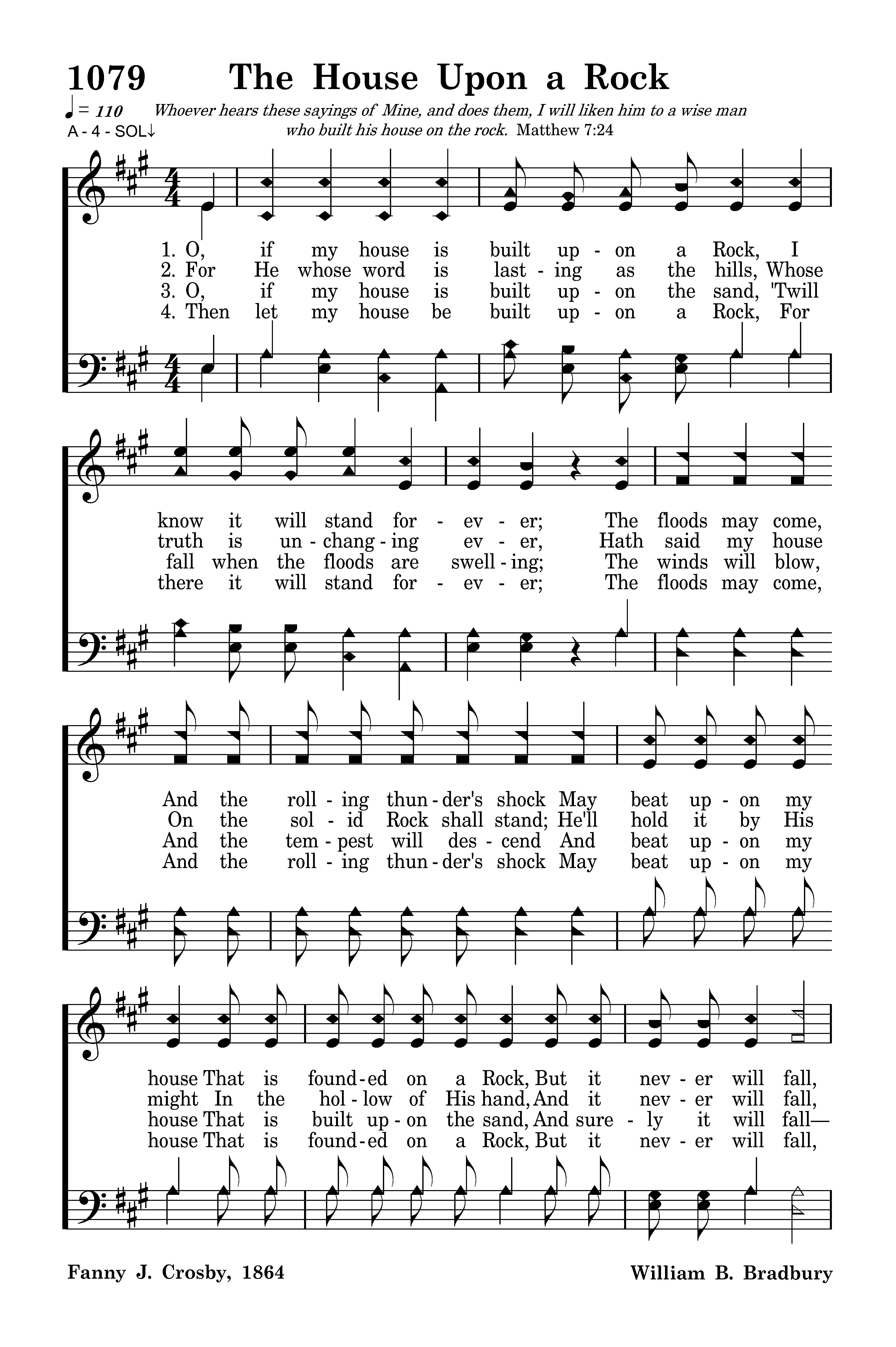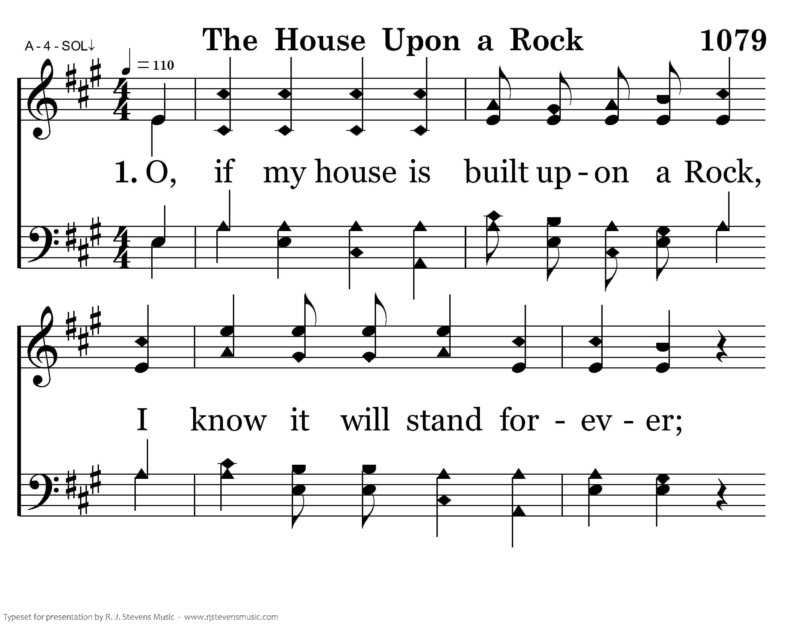 O, if my house is built upon a Rock, I know it will stand forever; The floods may come, And the rolling thunder's shock May beat upon my house That is founded on a Rock, But it never will fall, never will fall, Never, never, never.
