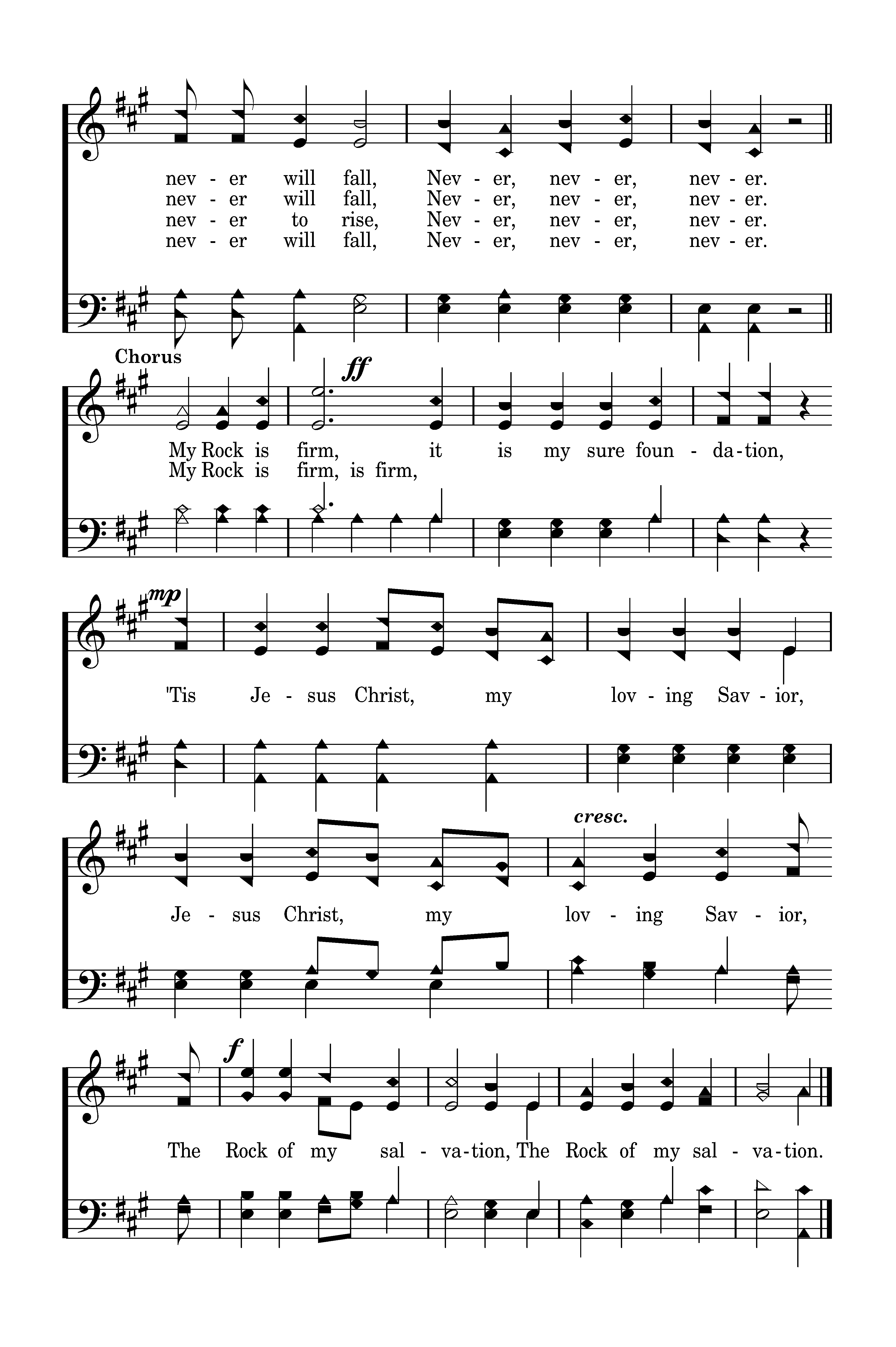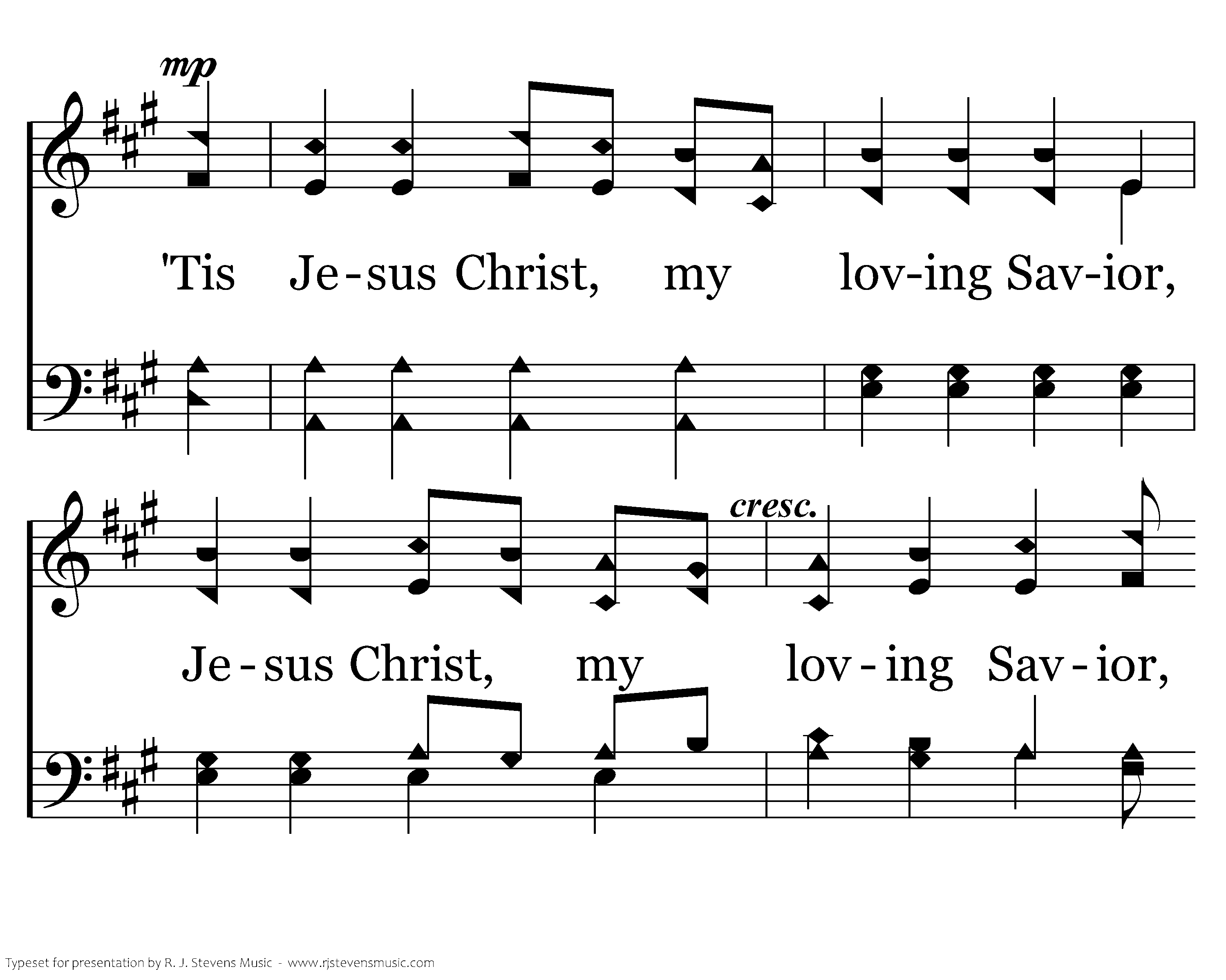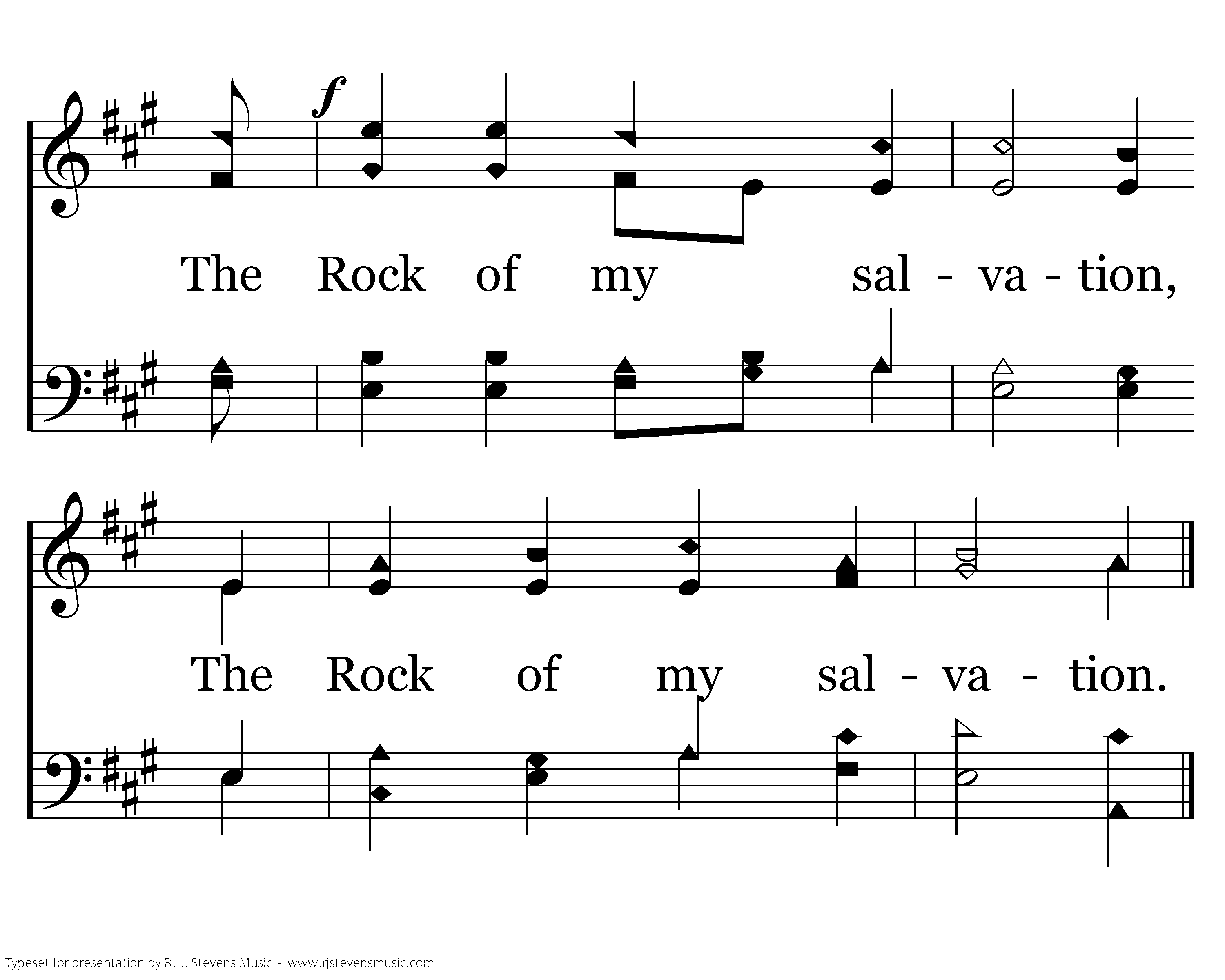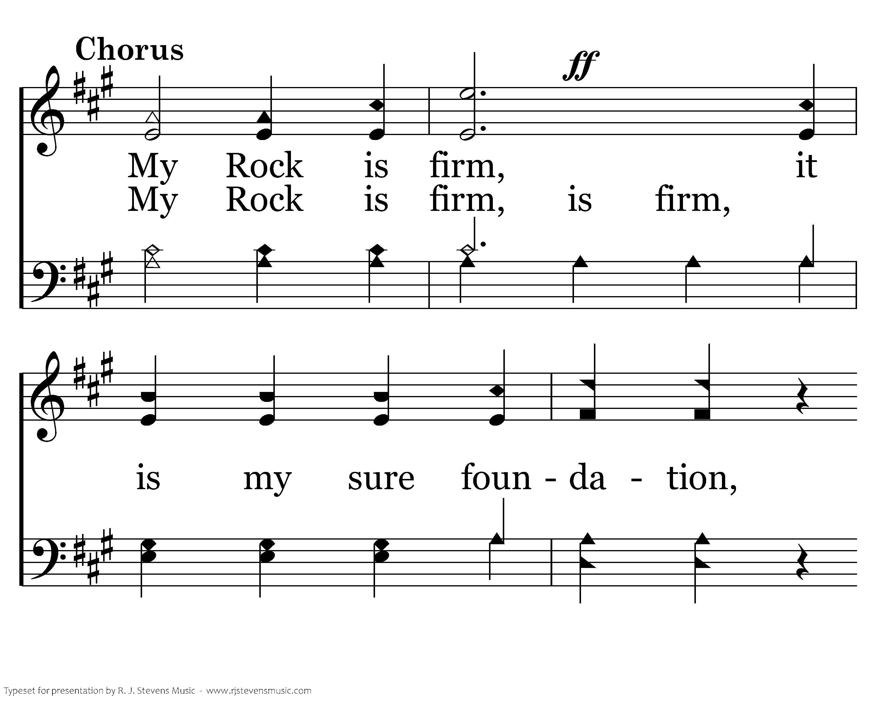 My Rock is firm, it is my sure foundation, 'Tis Jesus Christ, my loving Savior, Jesus Christ, my loving Savior, The Rock of my salvation, The Rock of my salvation.