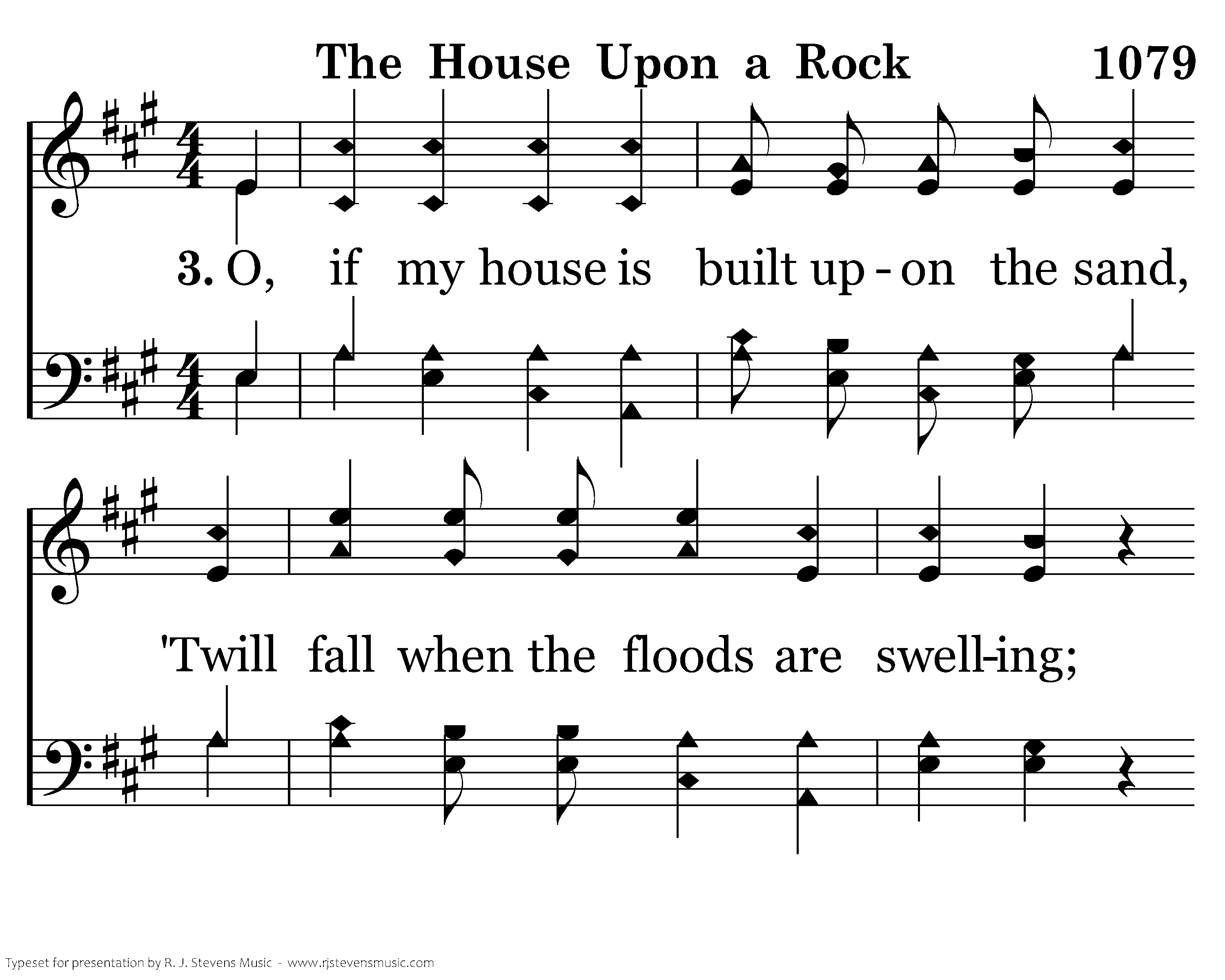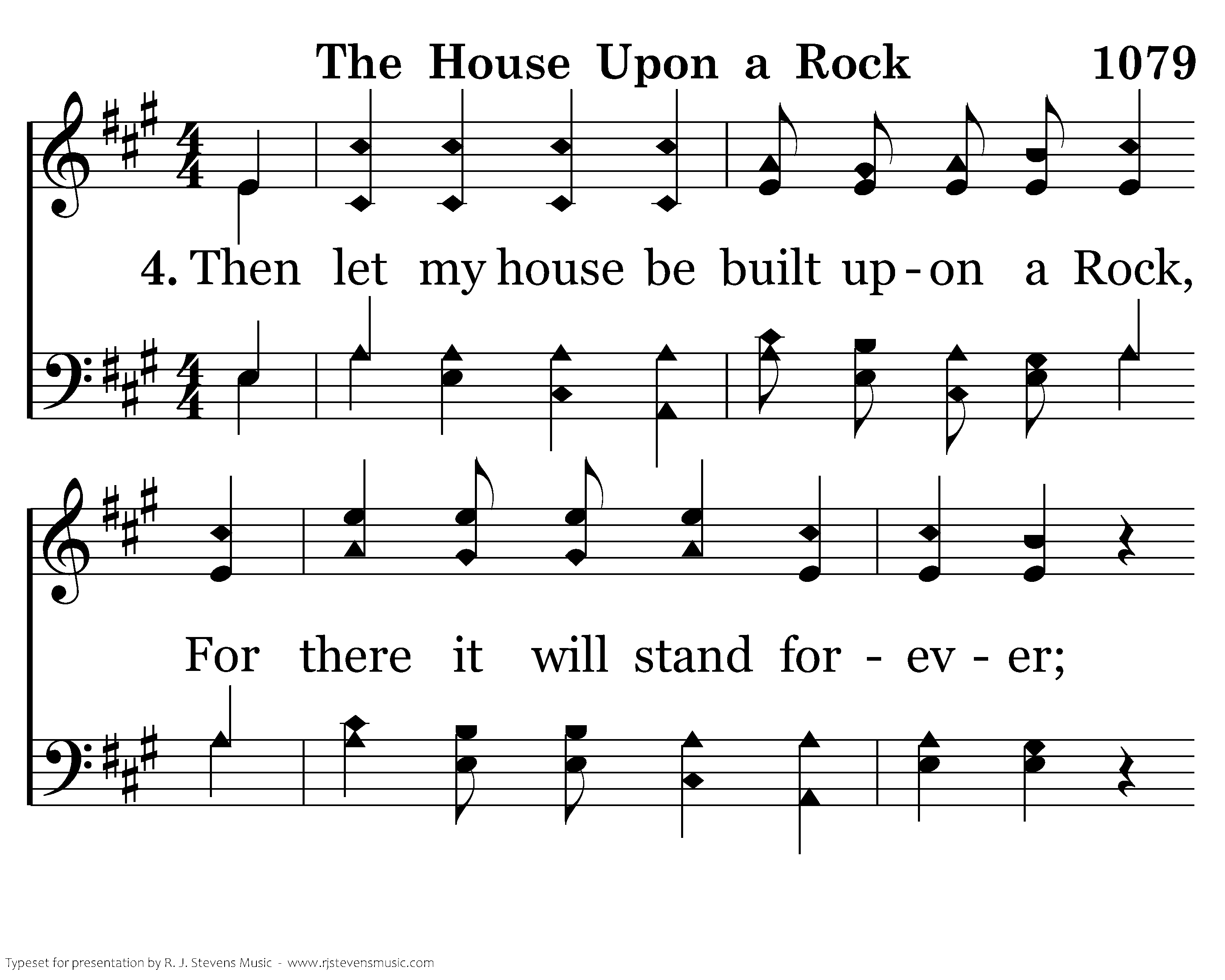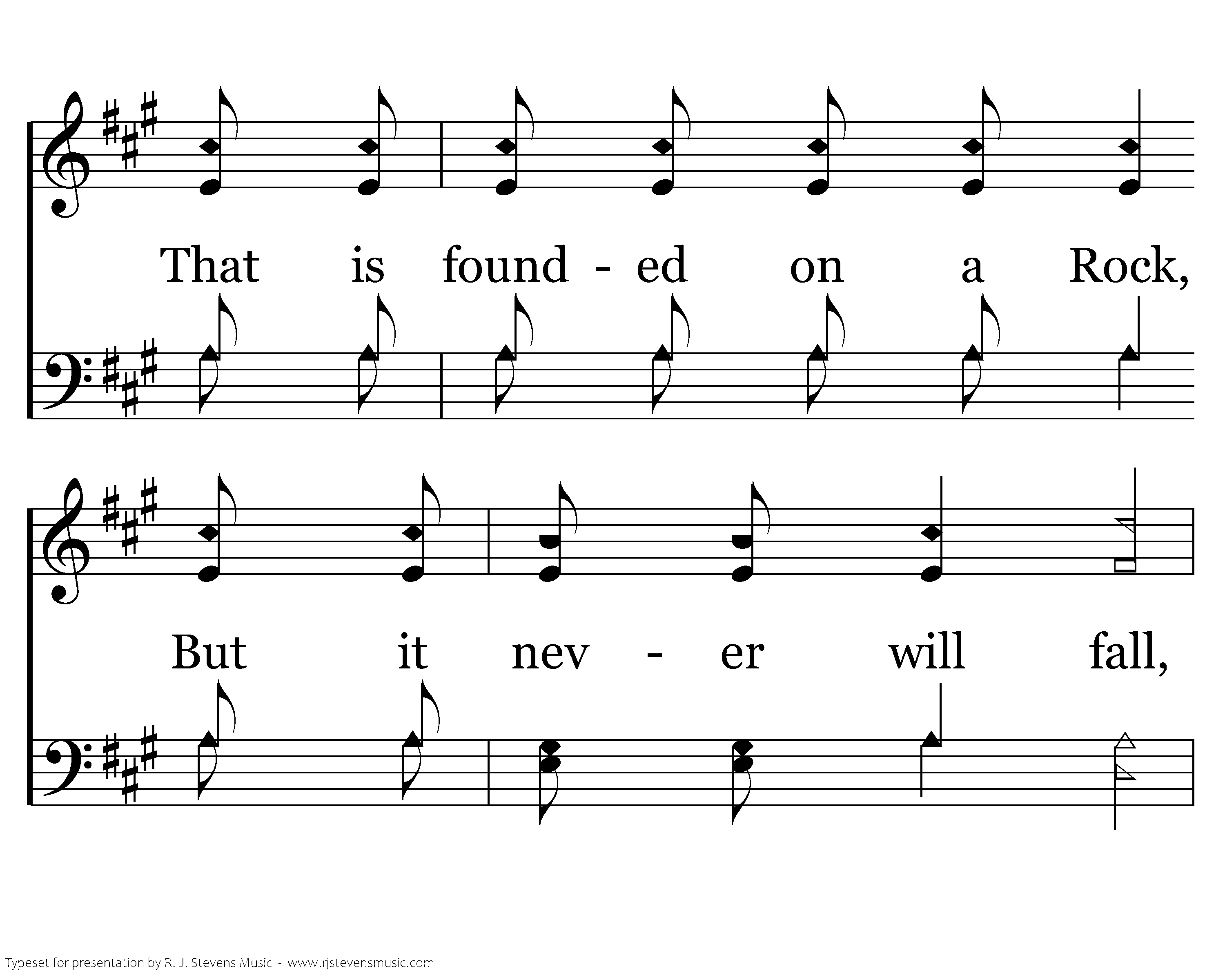 Then let my house be built upon a Rock, For there it will stand forever; The floods may come, And the rolling thunder's shock May beat upon my house That is founded on a Rock, But it never will fall, never will fall, Never, never, never.