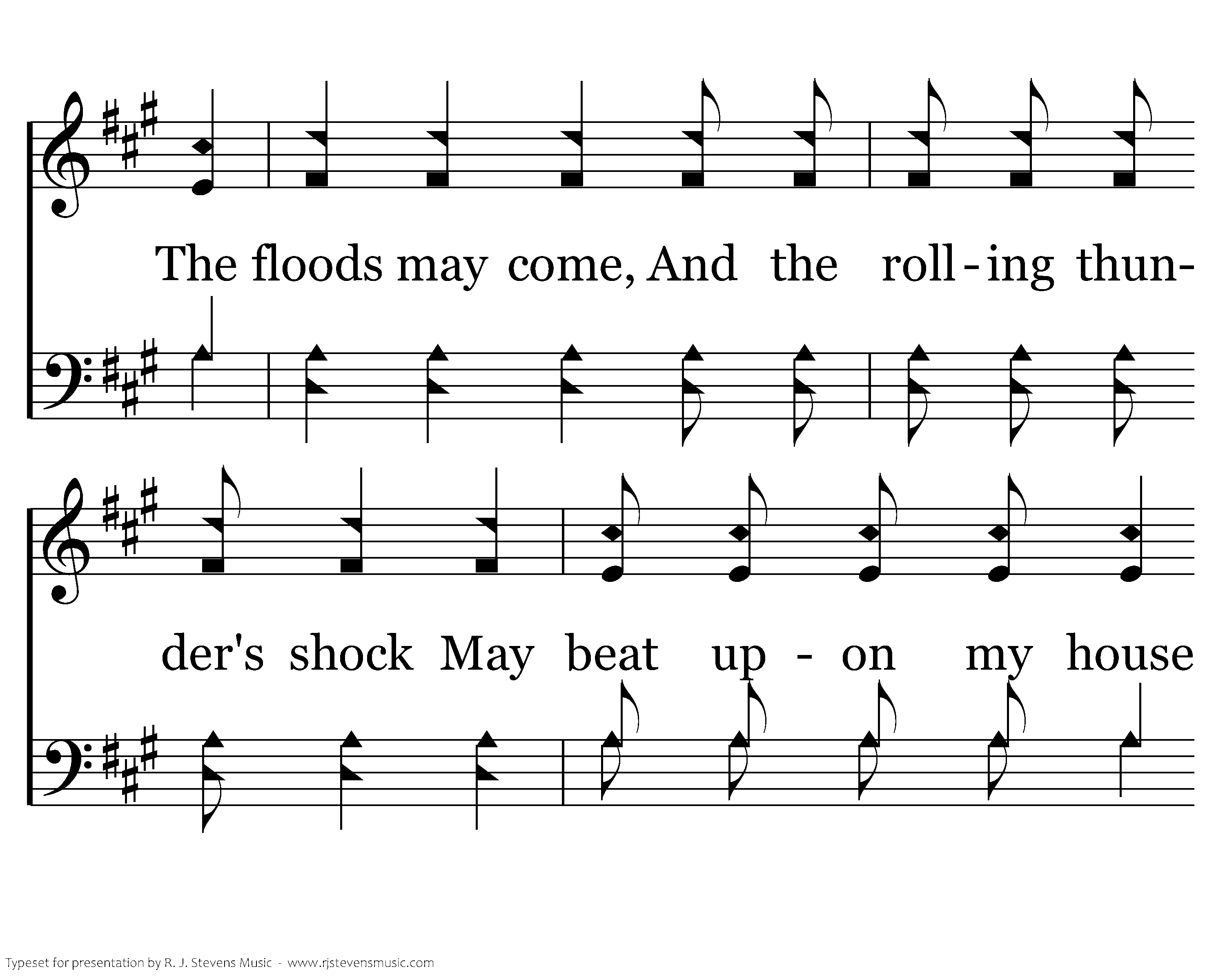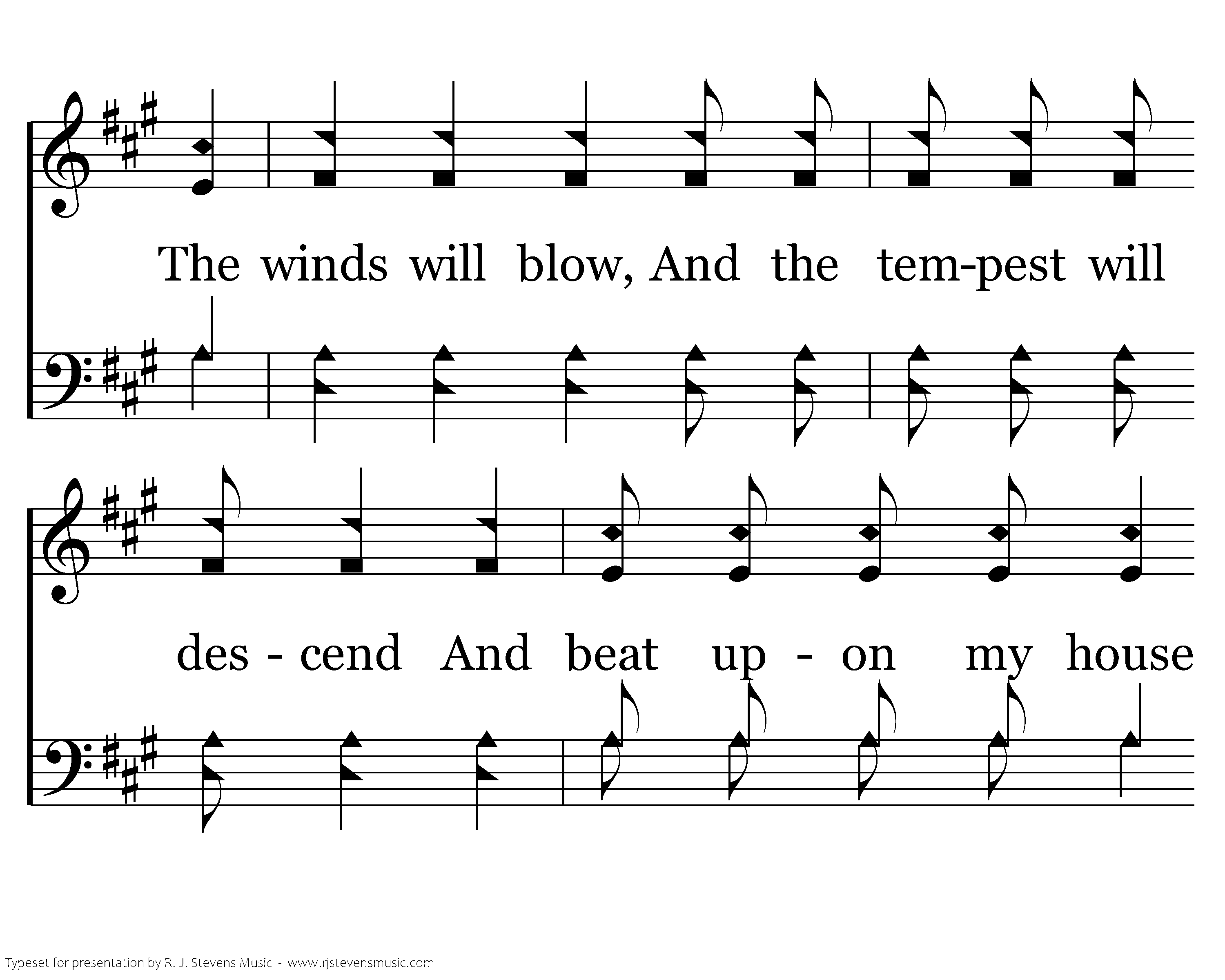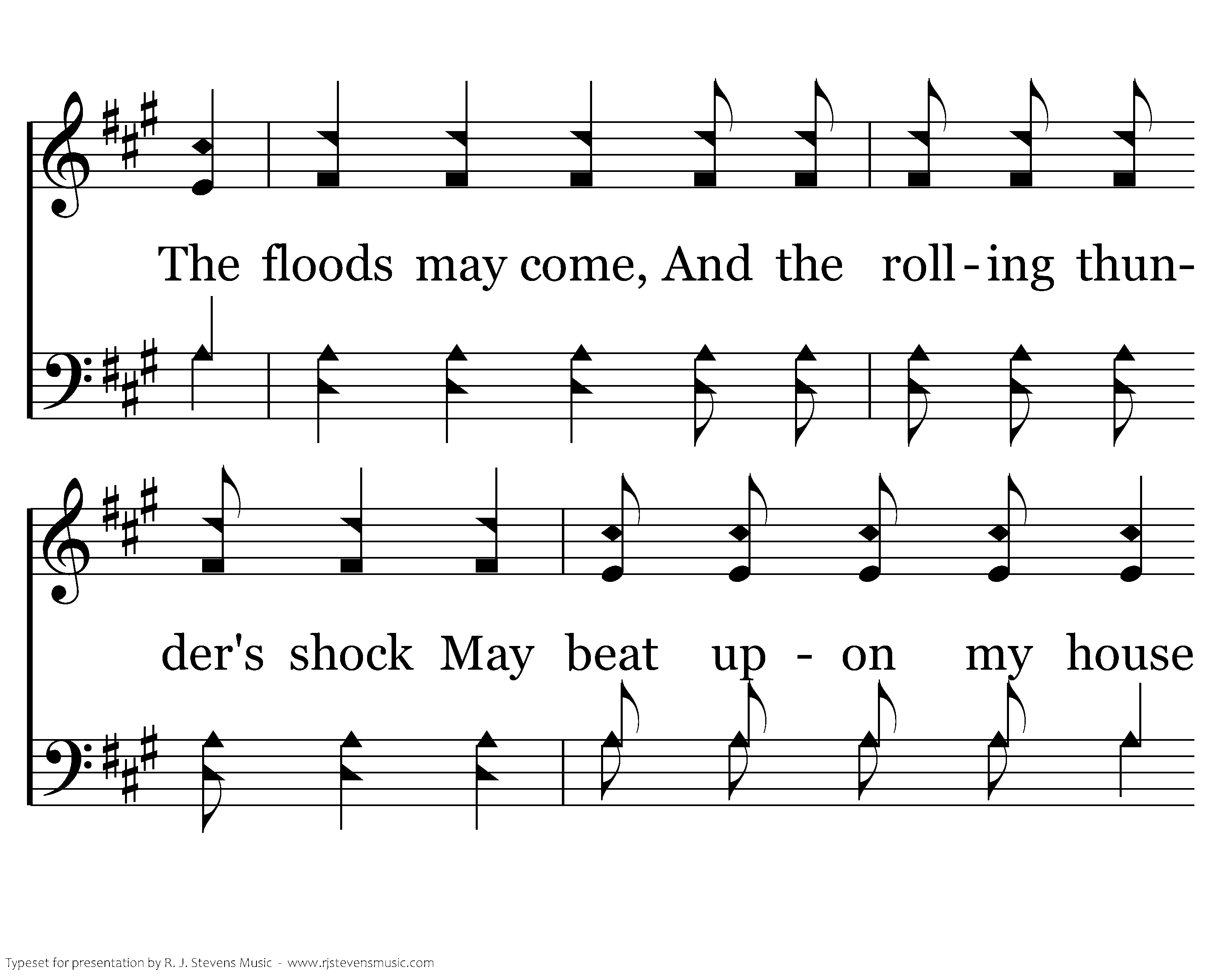 Then let my house be built upon a Rock, For there it will stand forever; The floods may come, And the rolling thunder's shock May beat upon my house That is founded on a Rock, But it never will fall, never will fall, Never, never, never.