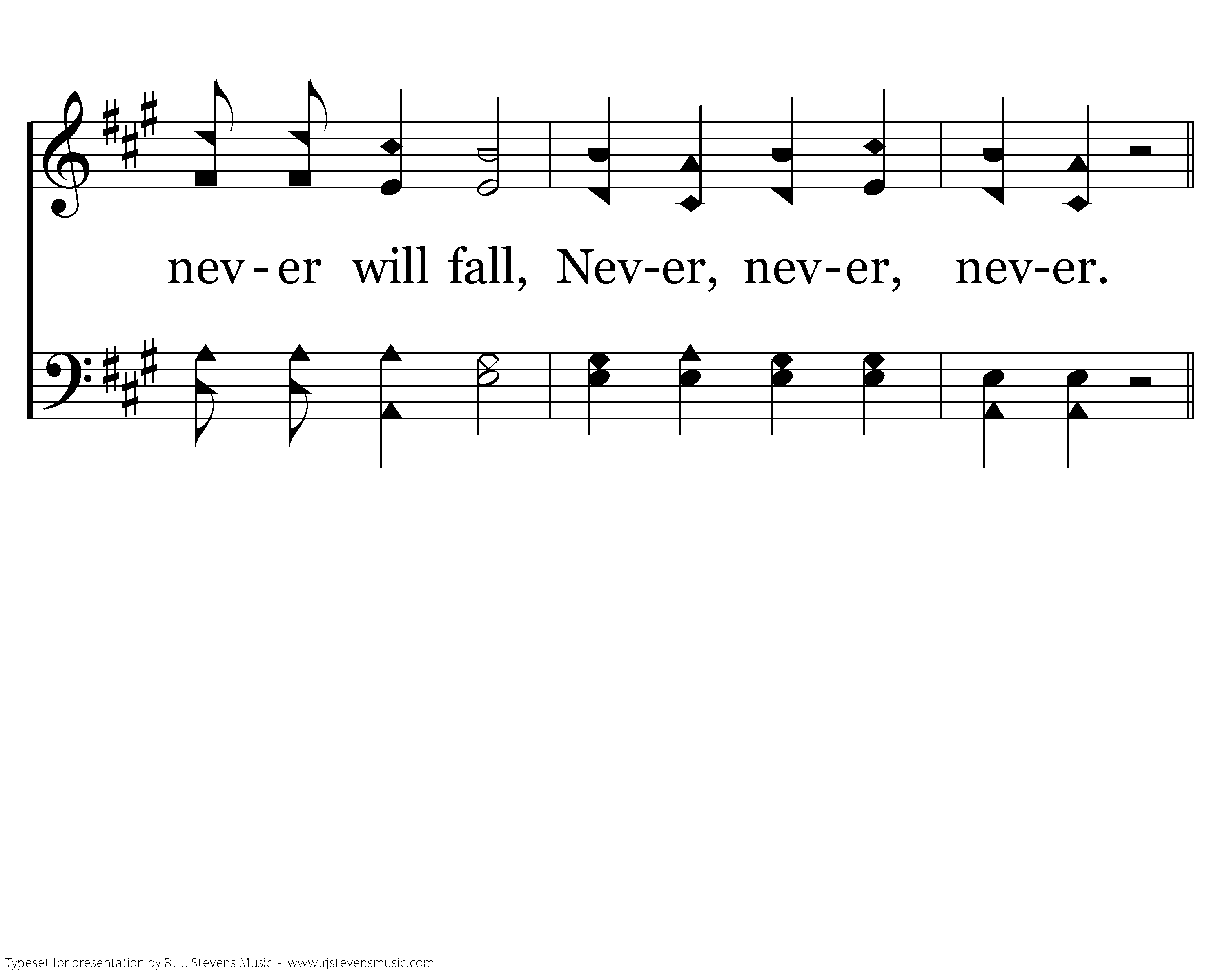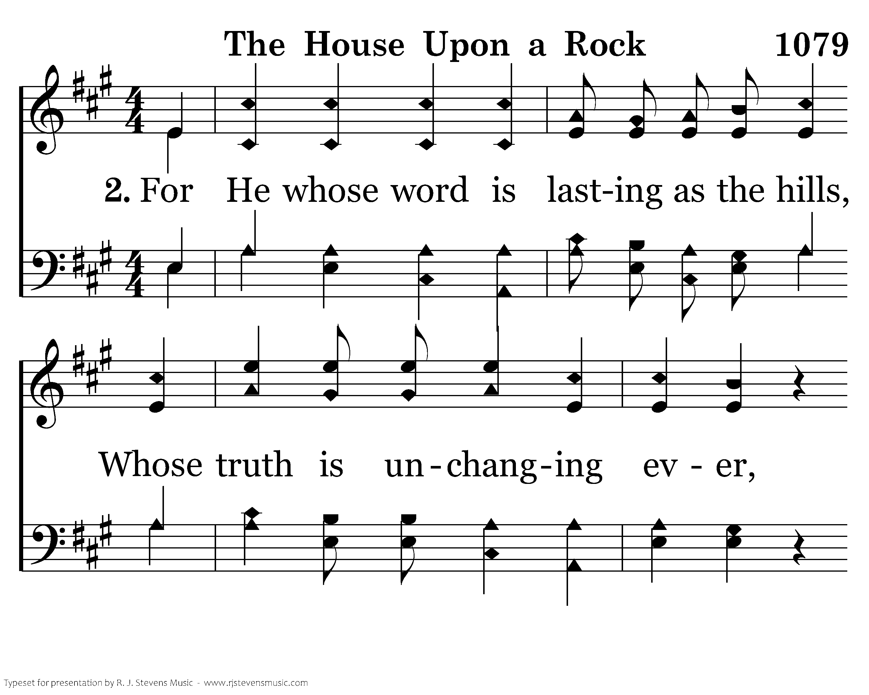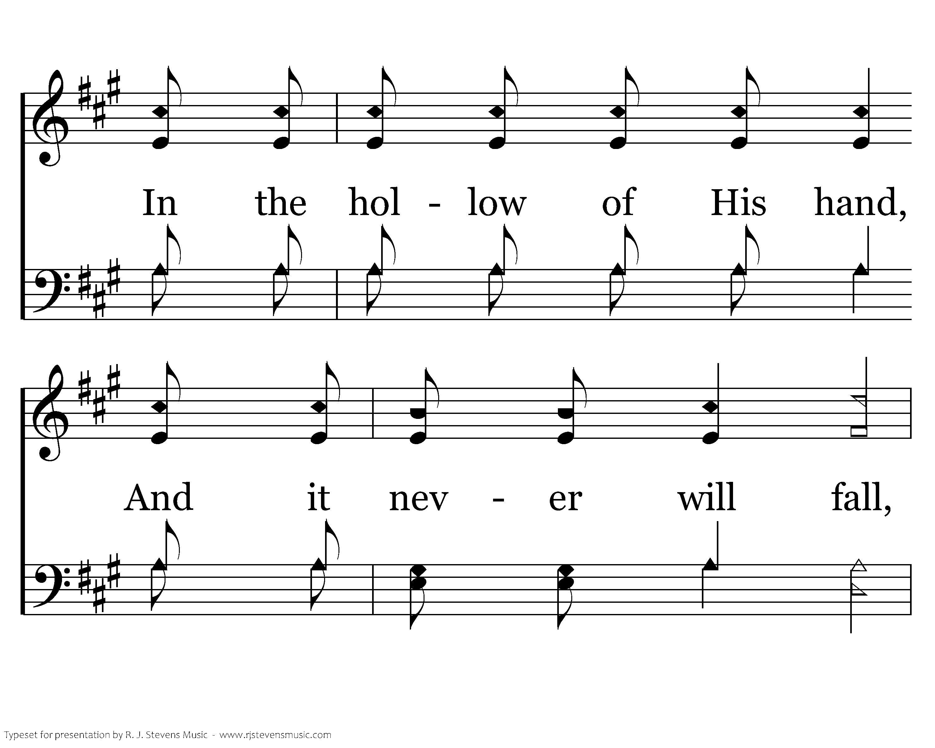 For He whose word is lasting as the hills, Whose truth is unchanging ever, Hath said my house On the solid Rock shall stand; He'll hold it by His might In the hollow of His hand, And it never will fall, never will fall, Never, never, never.