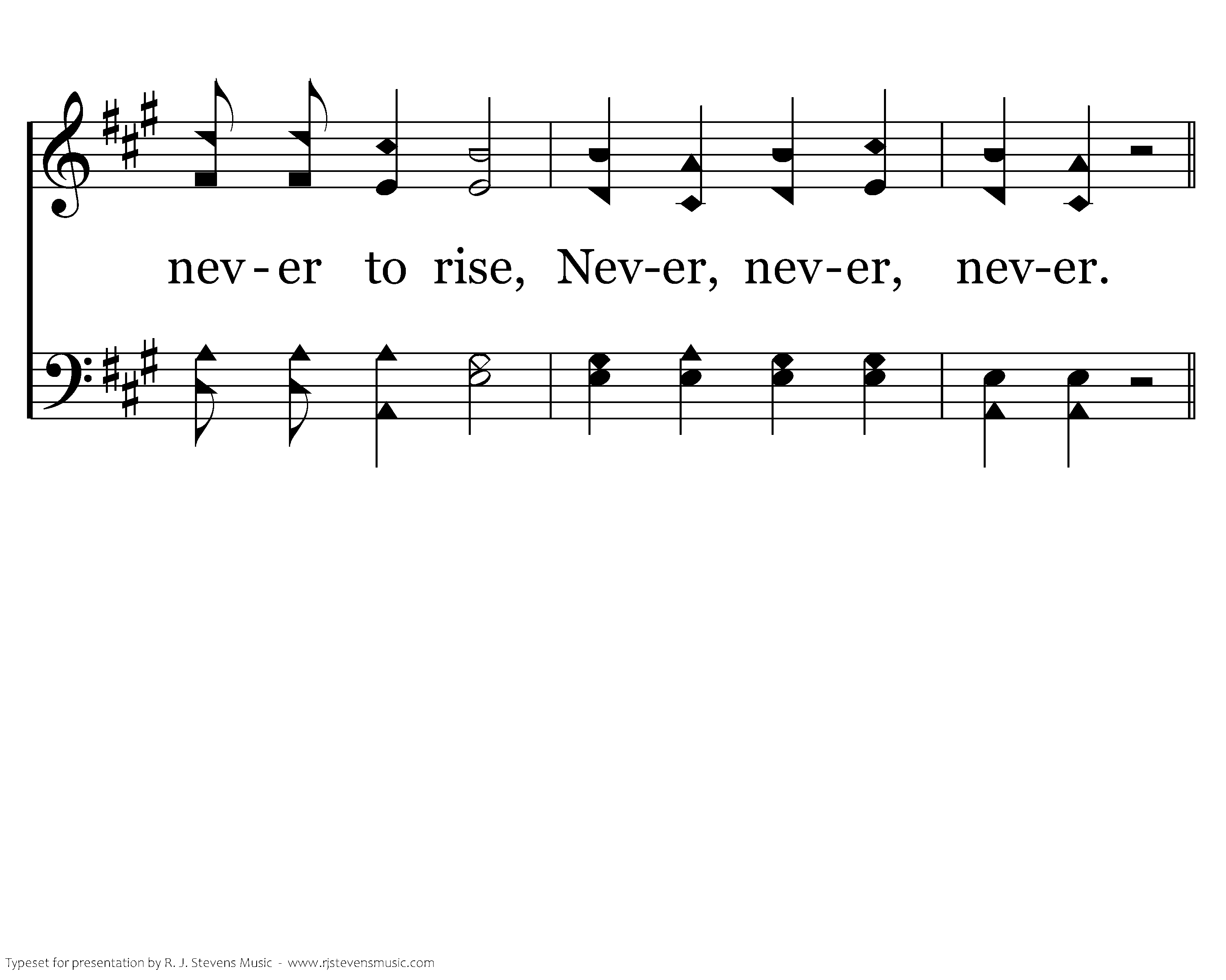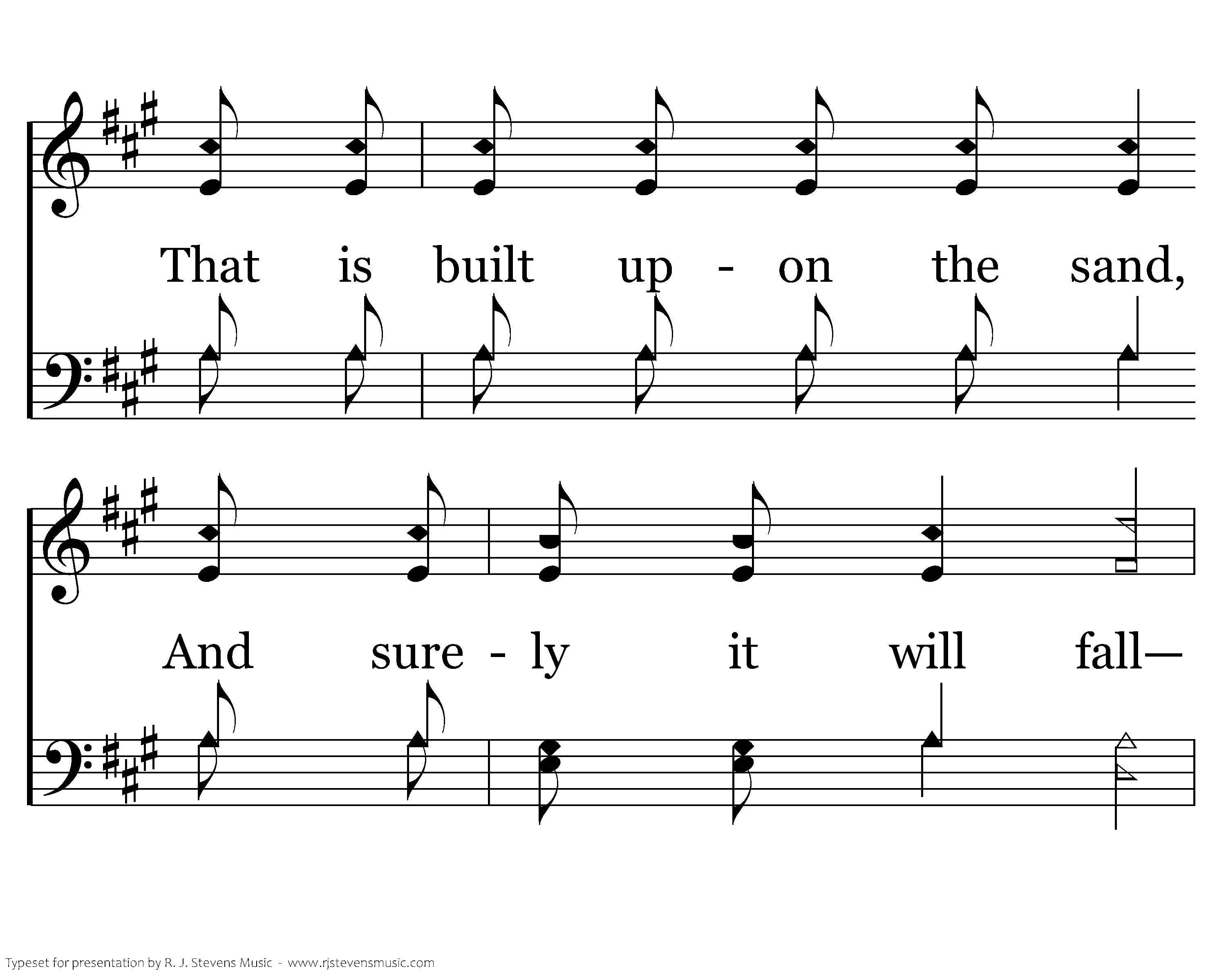 O, if my house is built upon the sand, 'Twill fall when the floods are swelling; The winds will blow, And the tempest will descend And beat upon my house That is built upon the sand, And surely it will fall never to rise, Never, never, never.