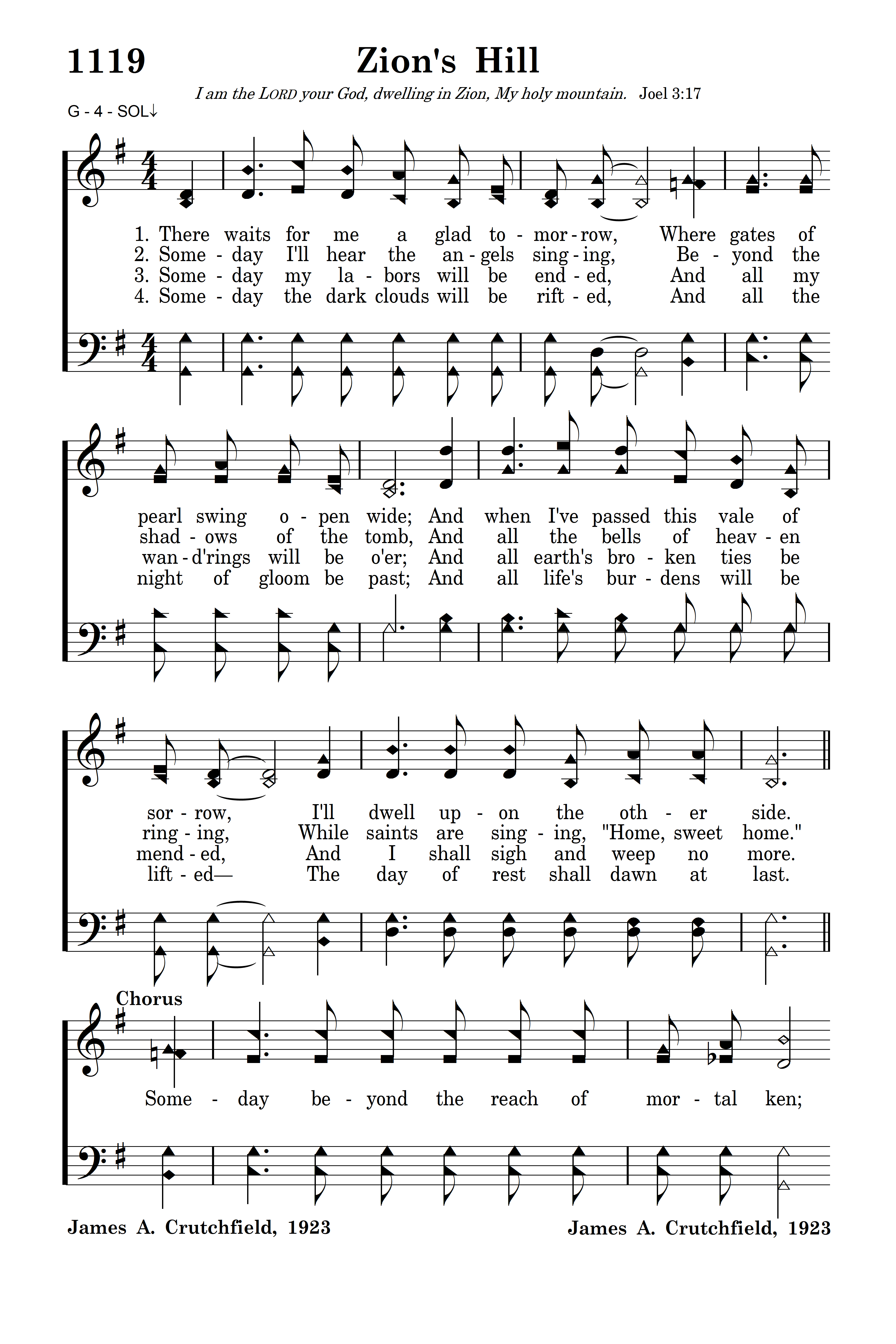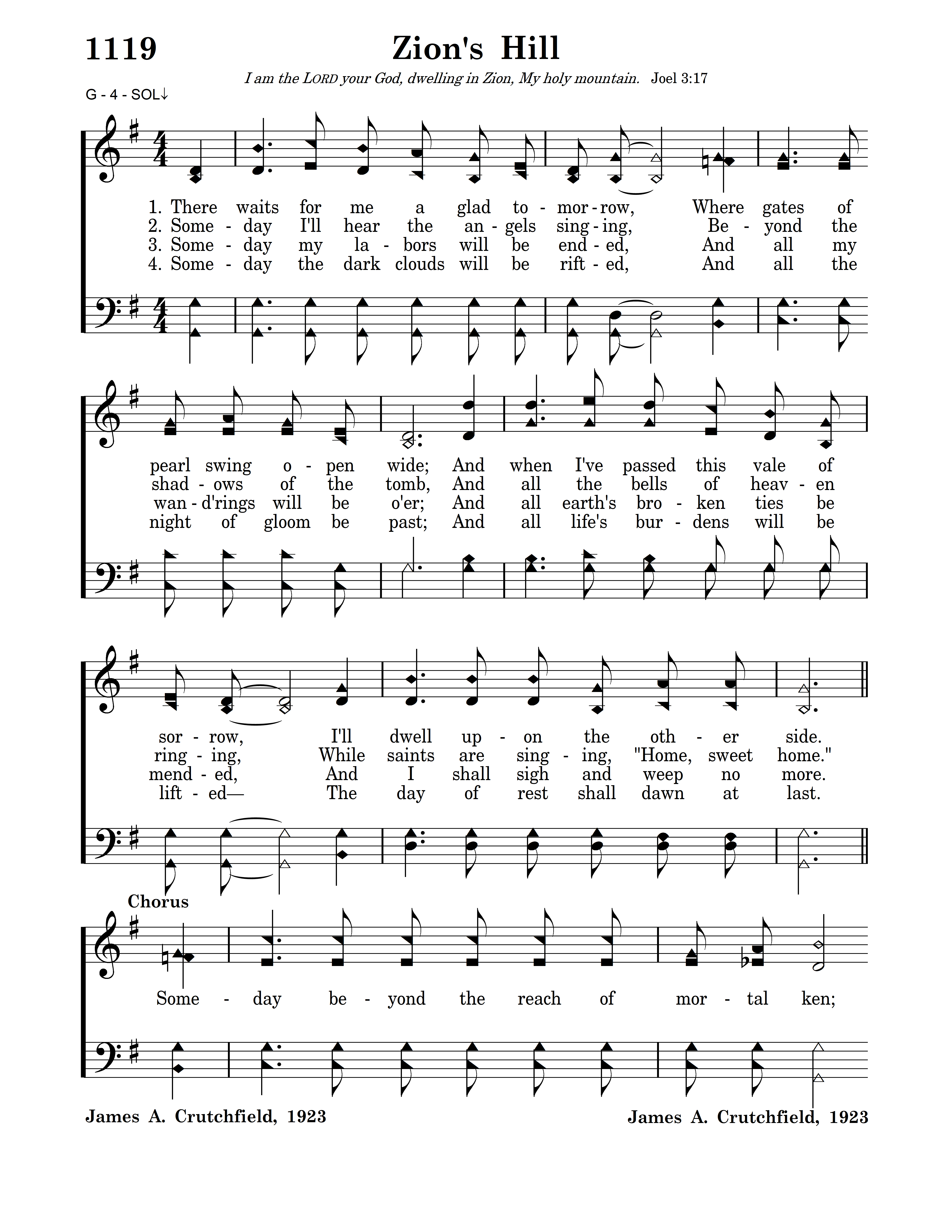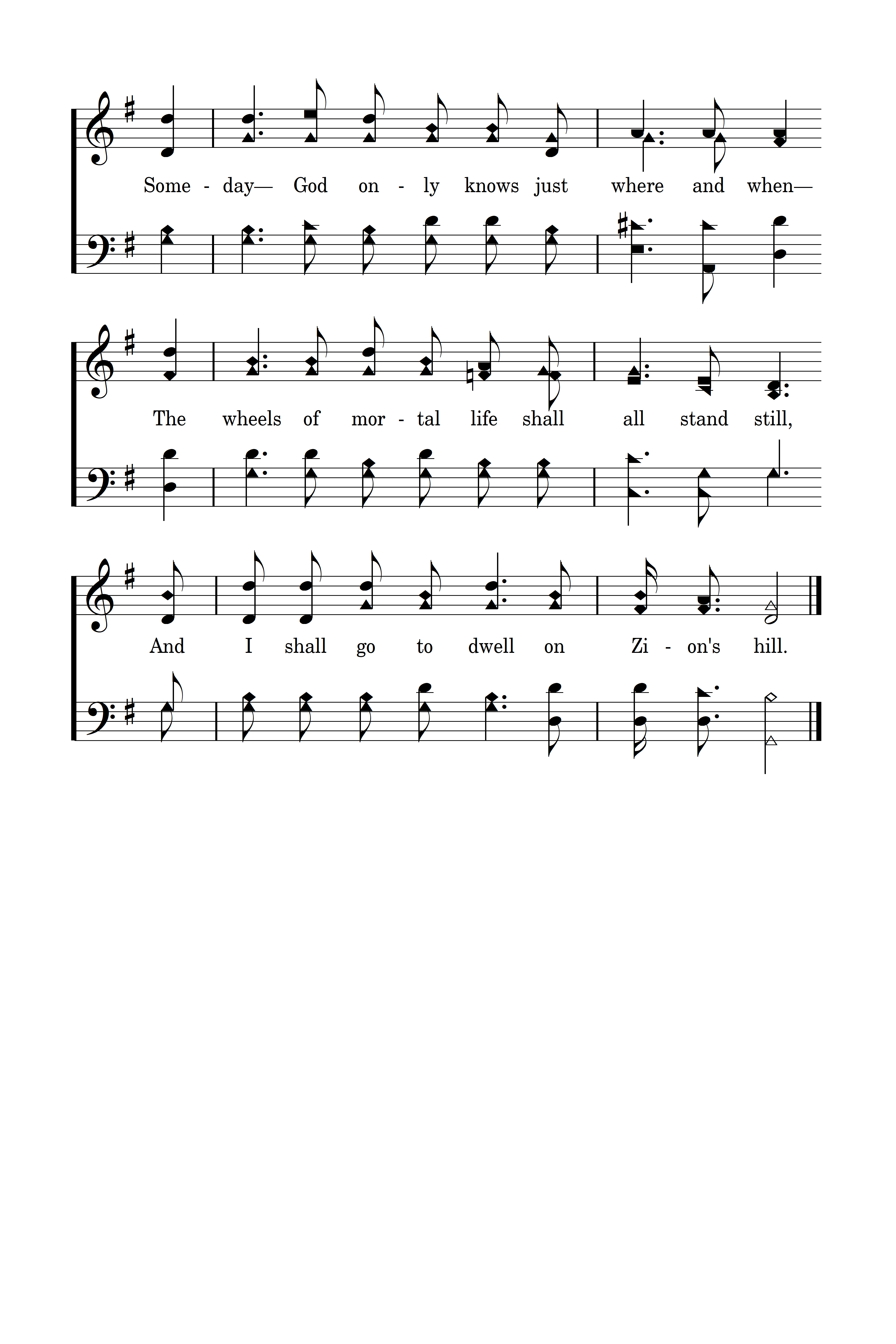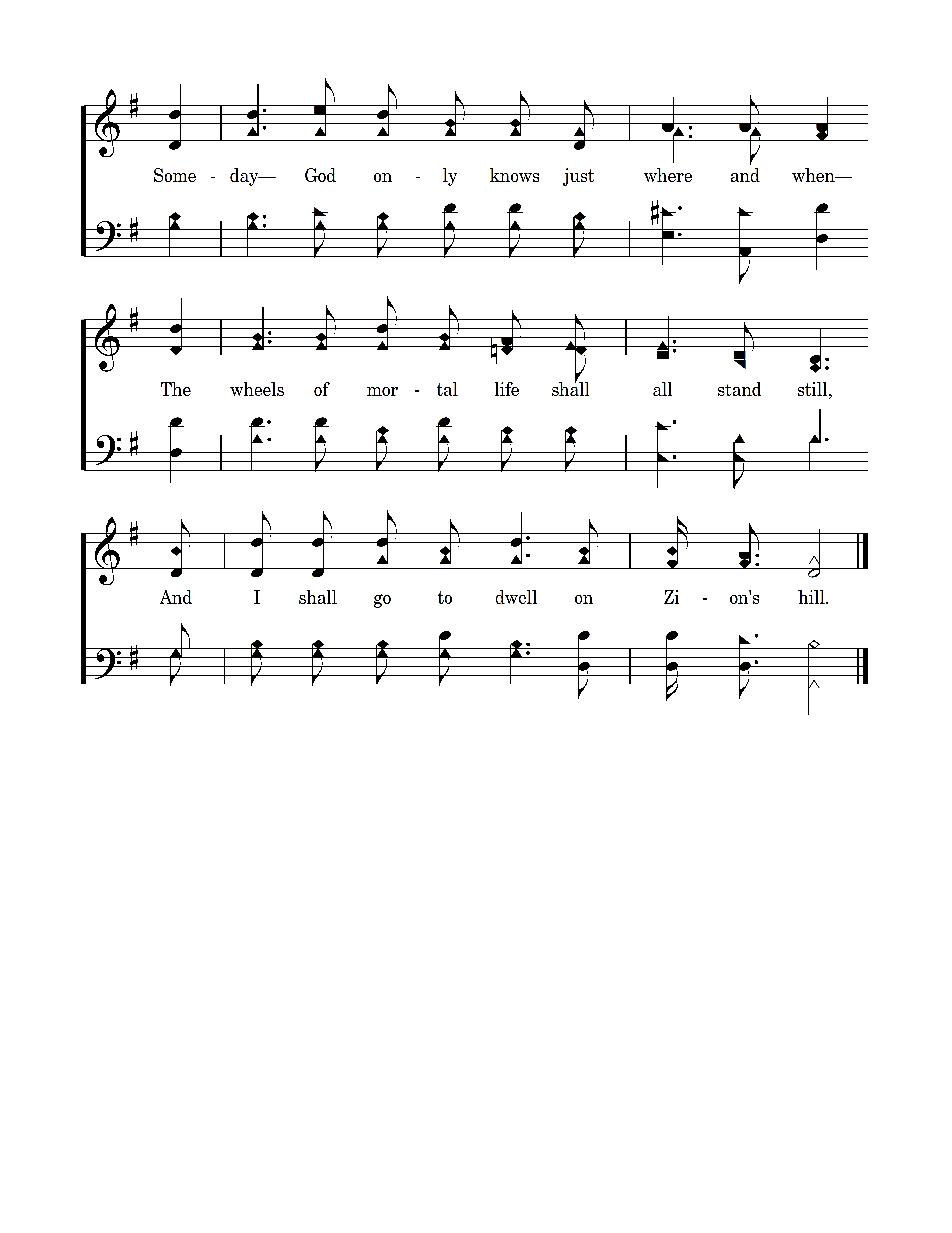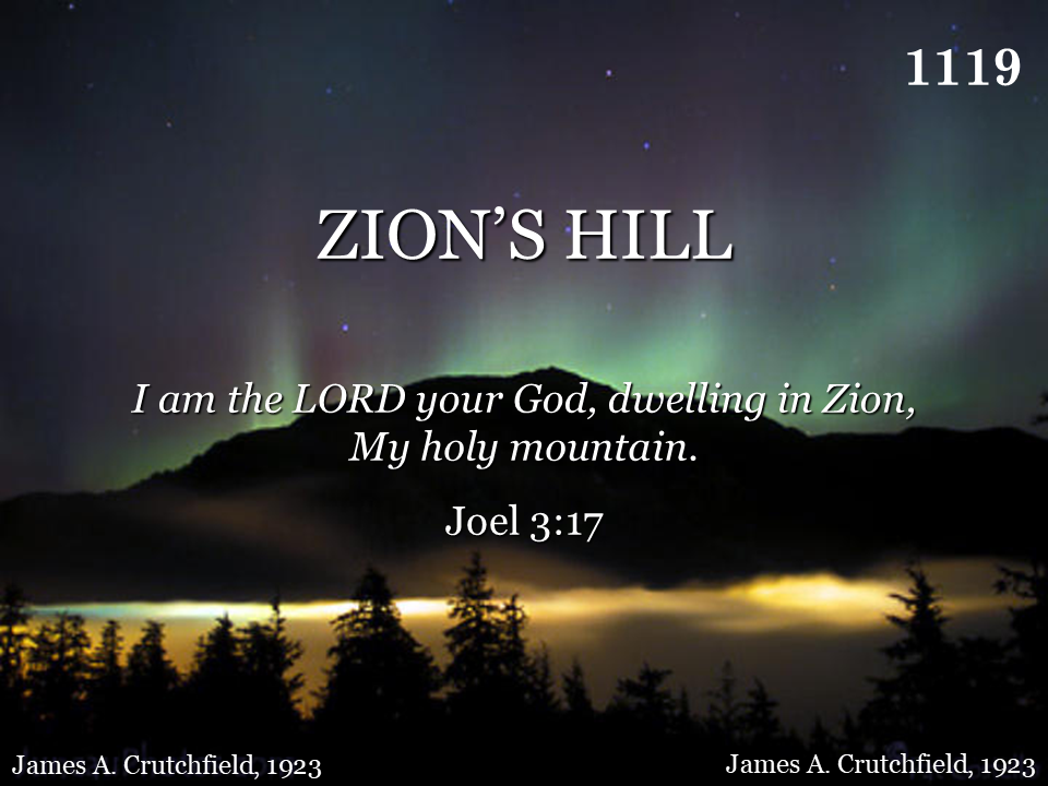 Someday beyond the reach of mortal ken; Someday God only knows just where and when The wheels of mortal life shall all stand still, And I shall go to dwell on Zion's hill.