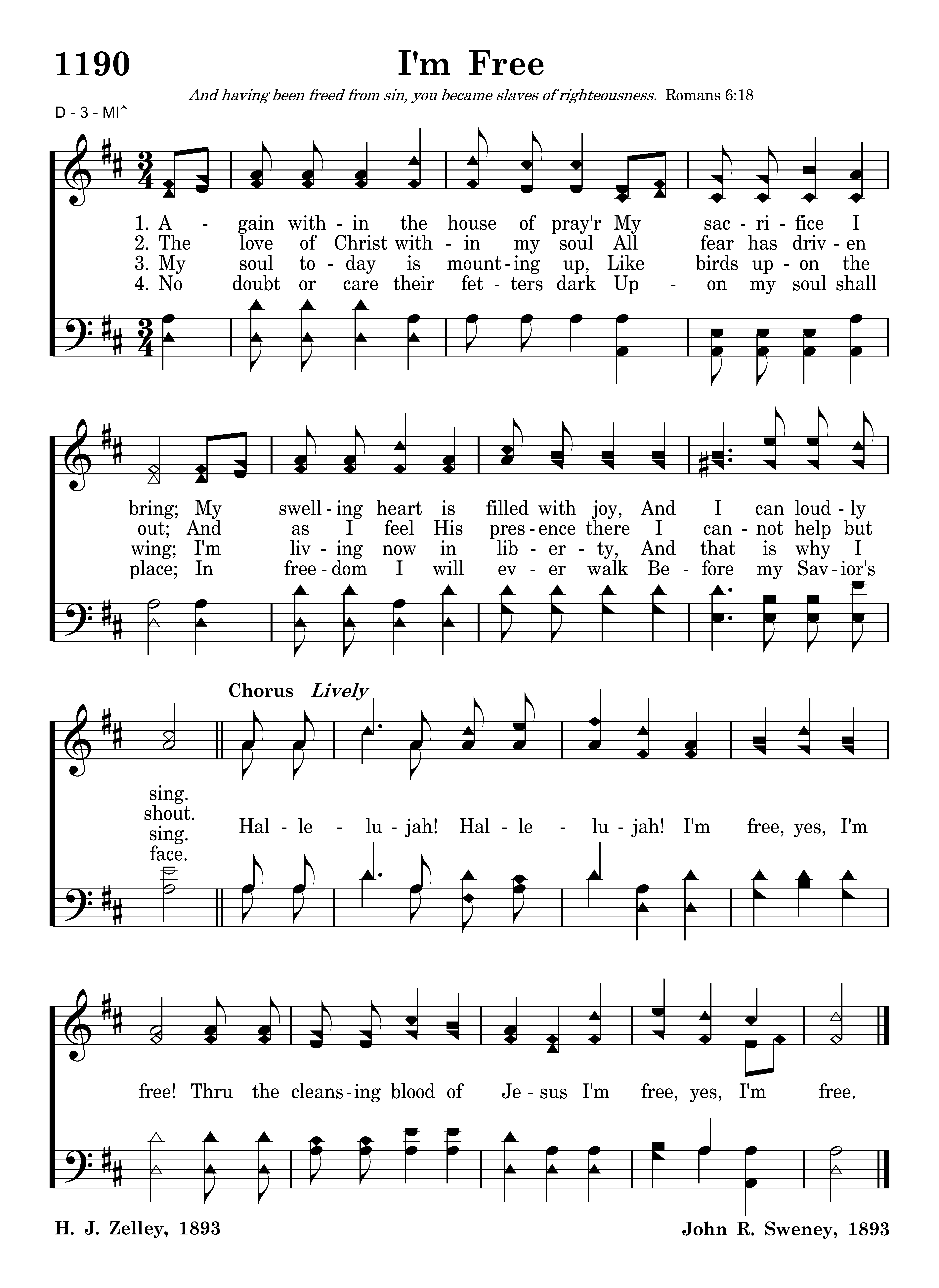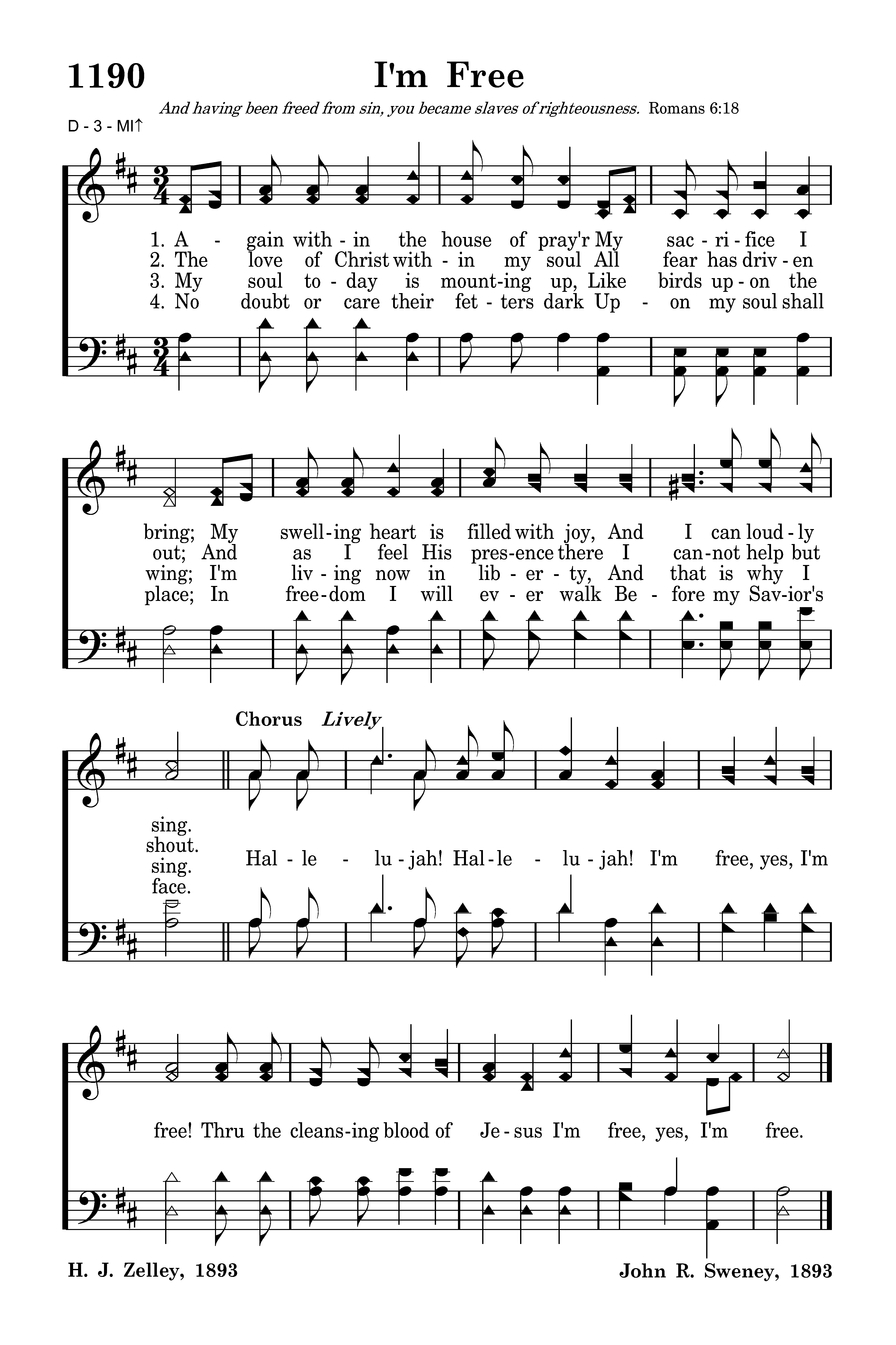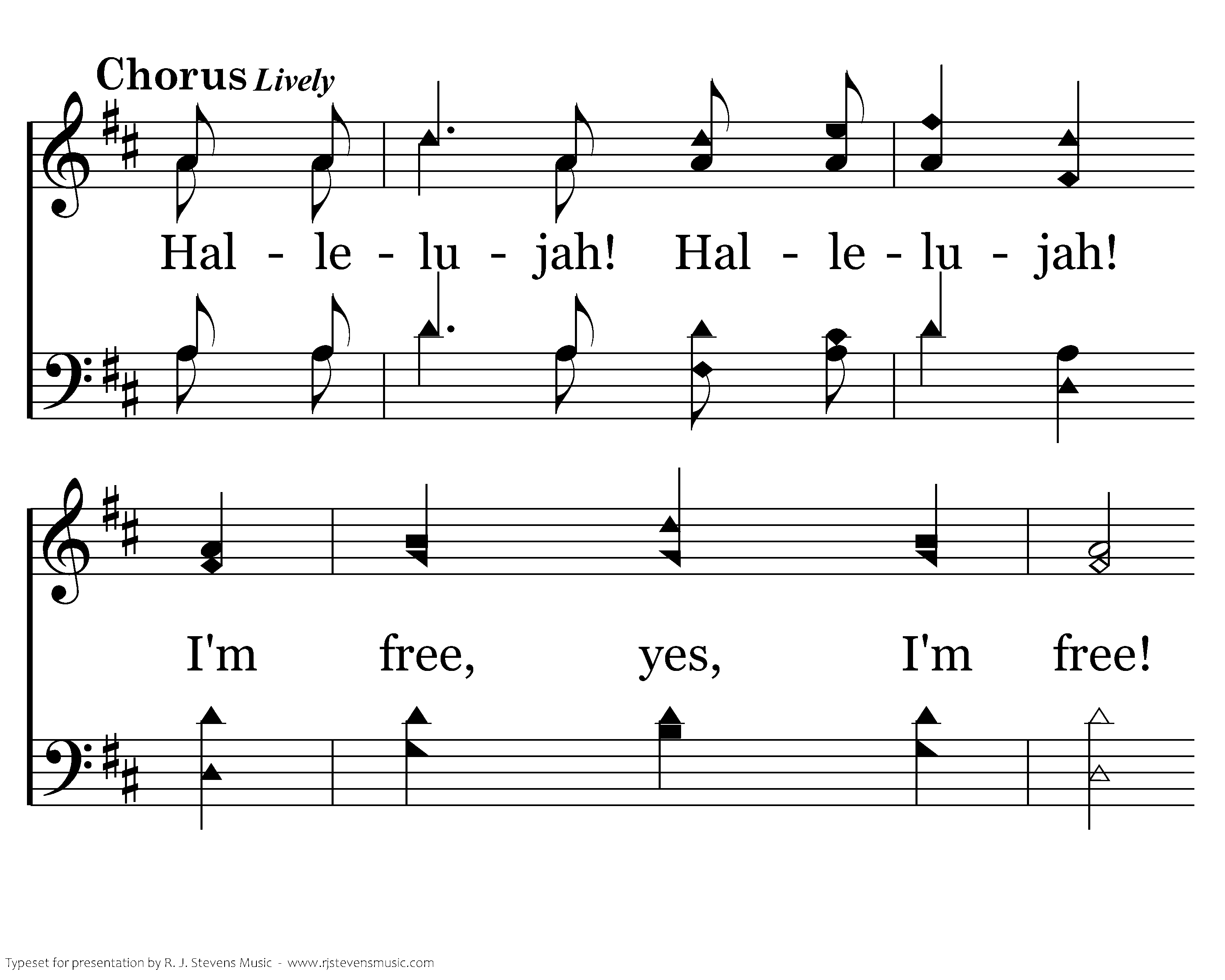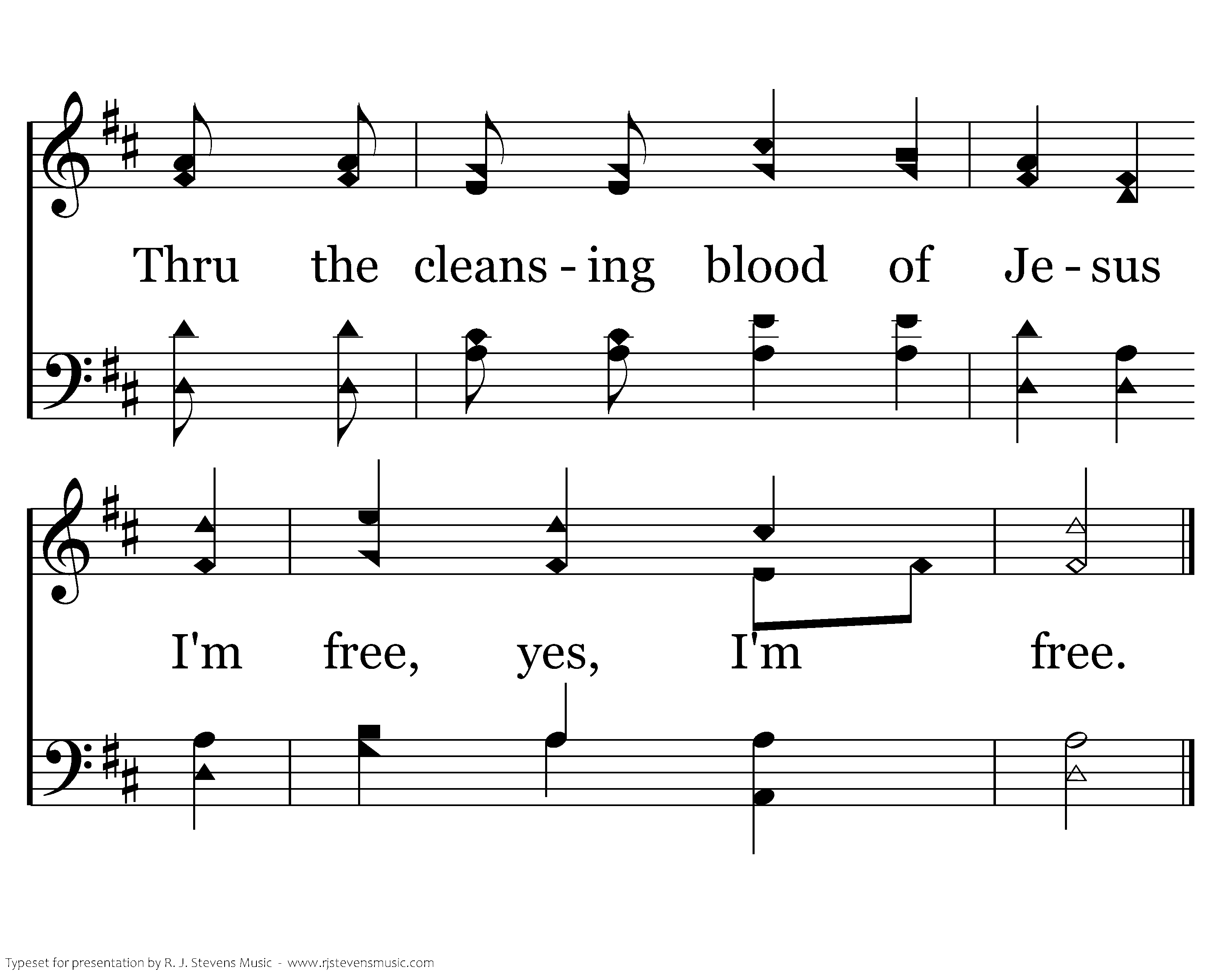 Hallelujah! Hallelujah! I'm free, yes, I'm free! Thru the cleansing blood of Jesus I'm free, yes, I'm free.