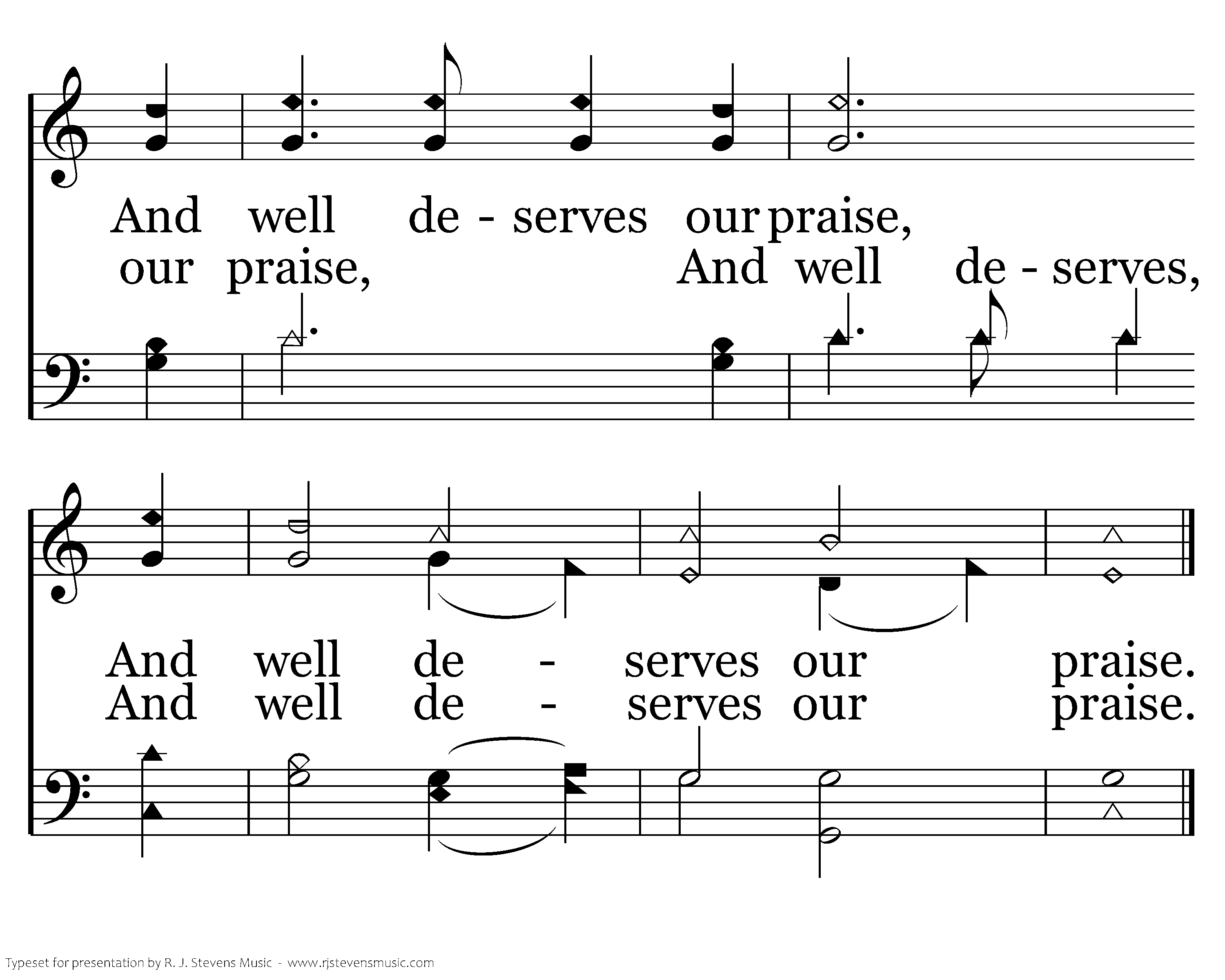 Grace all the work shall crown Thru everlasting days; It lays in heav'n the topmost stone, It lays in heav'n the topmost stone, And well deserves our praise, And well deserves our praise, And well deserves our praise.