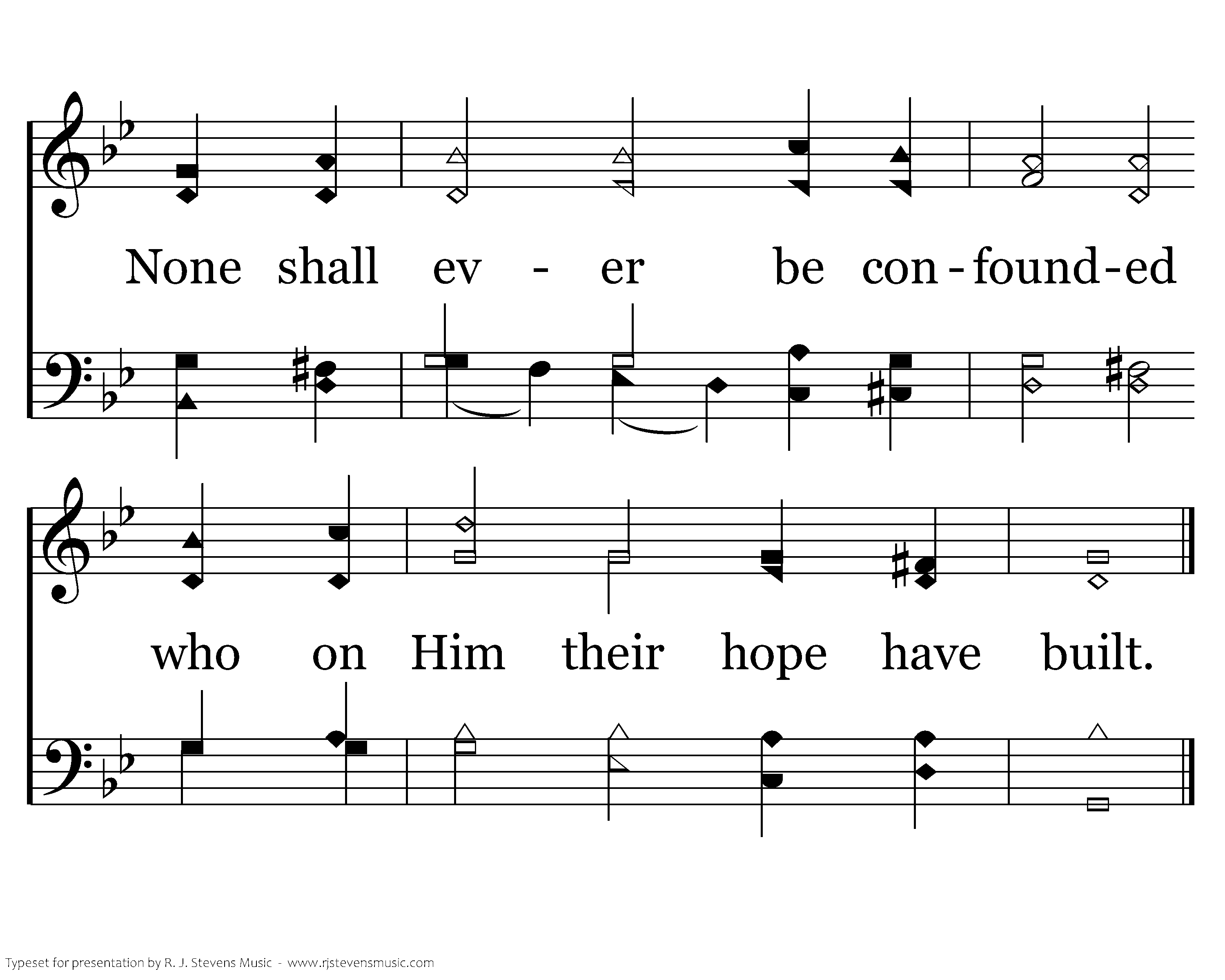 Here we have a firm foundation; here the refuge of the lost; Christ, the Rock of our salvation, His the Name of which we boast. Lamb of God, for sinners wounded, sacrifice to cancel guilt! None shall ever be confounded who on Him their hope have built.