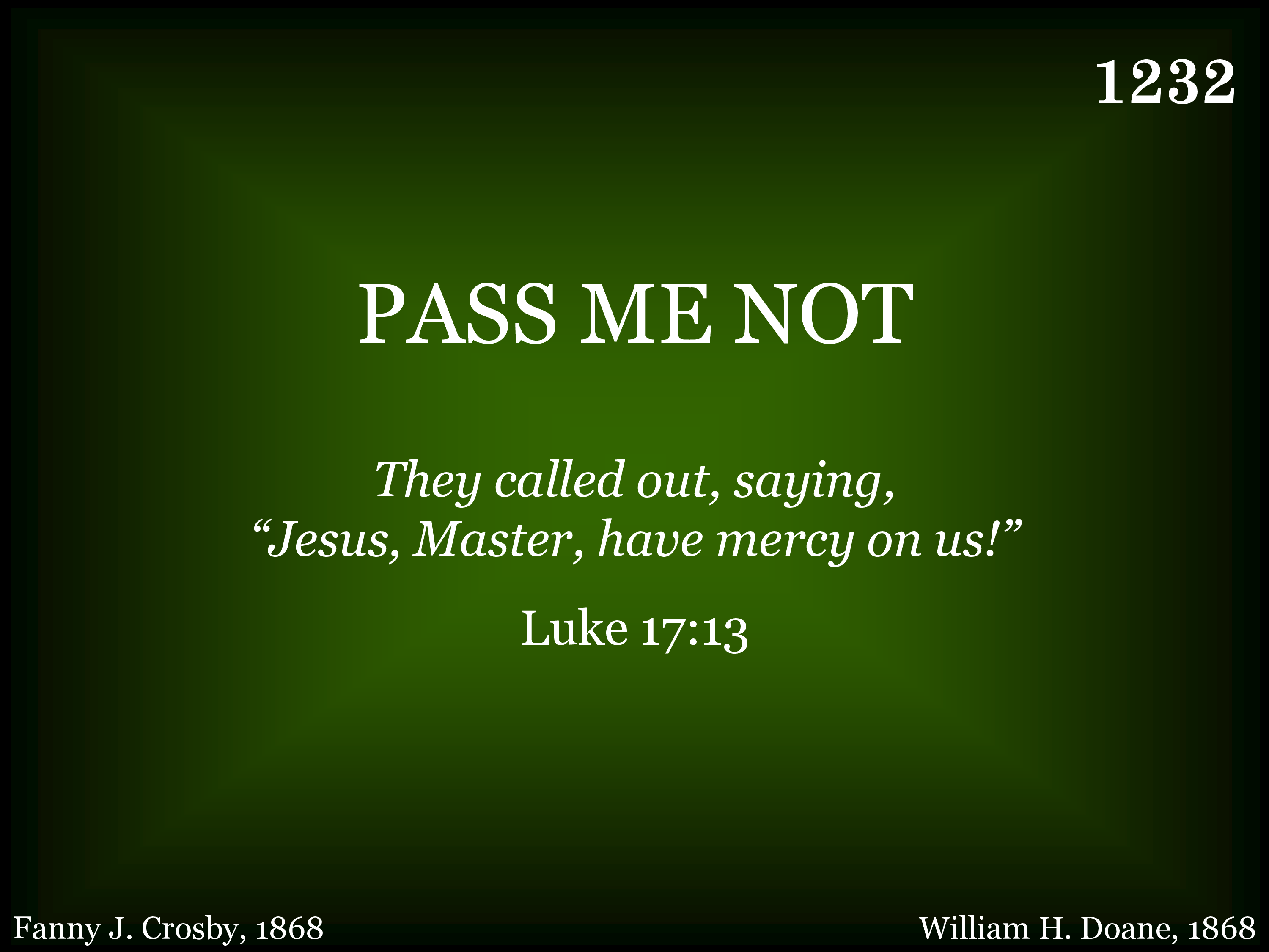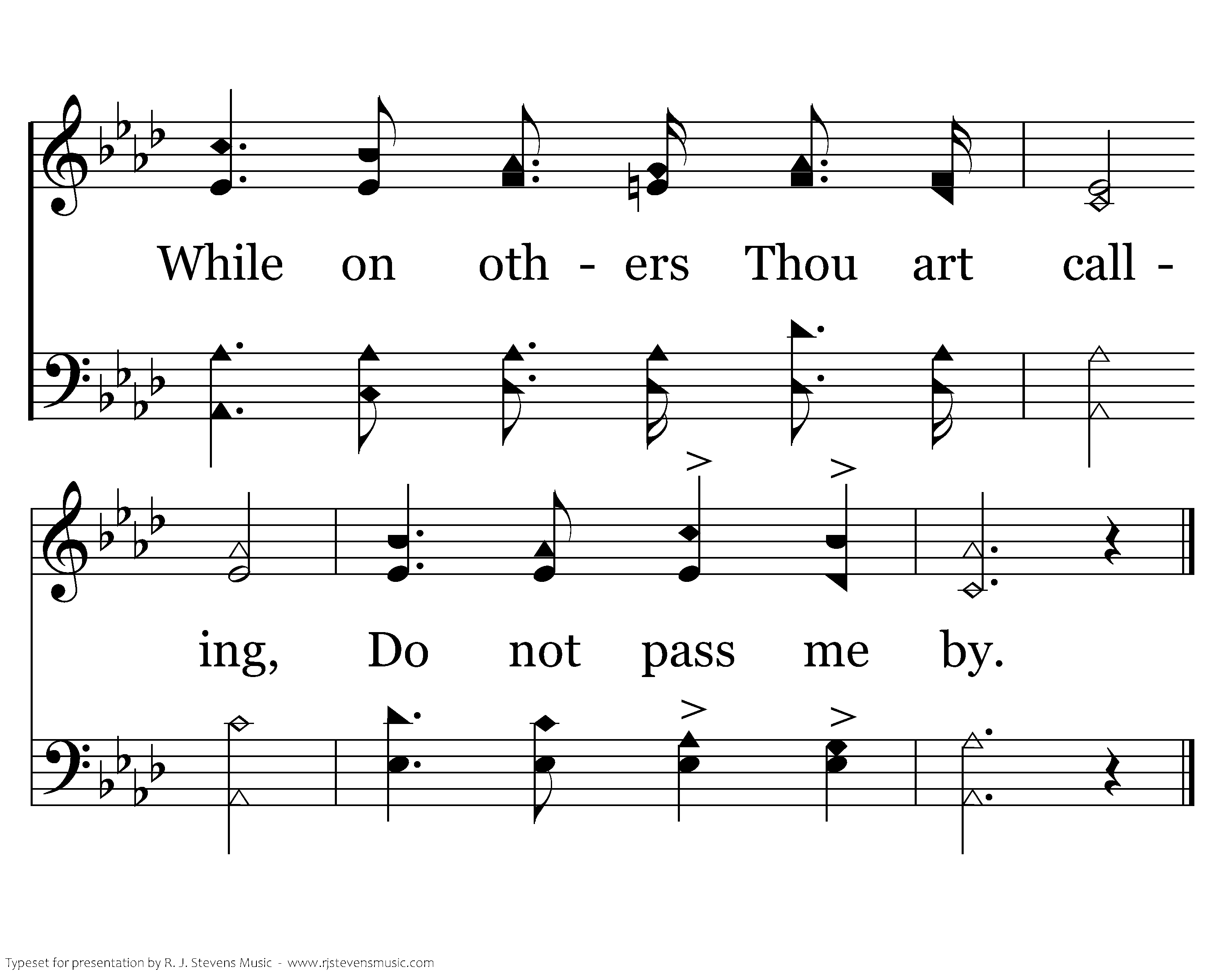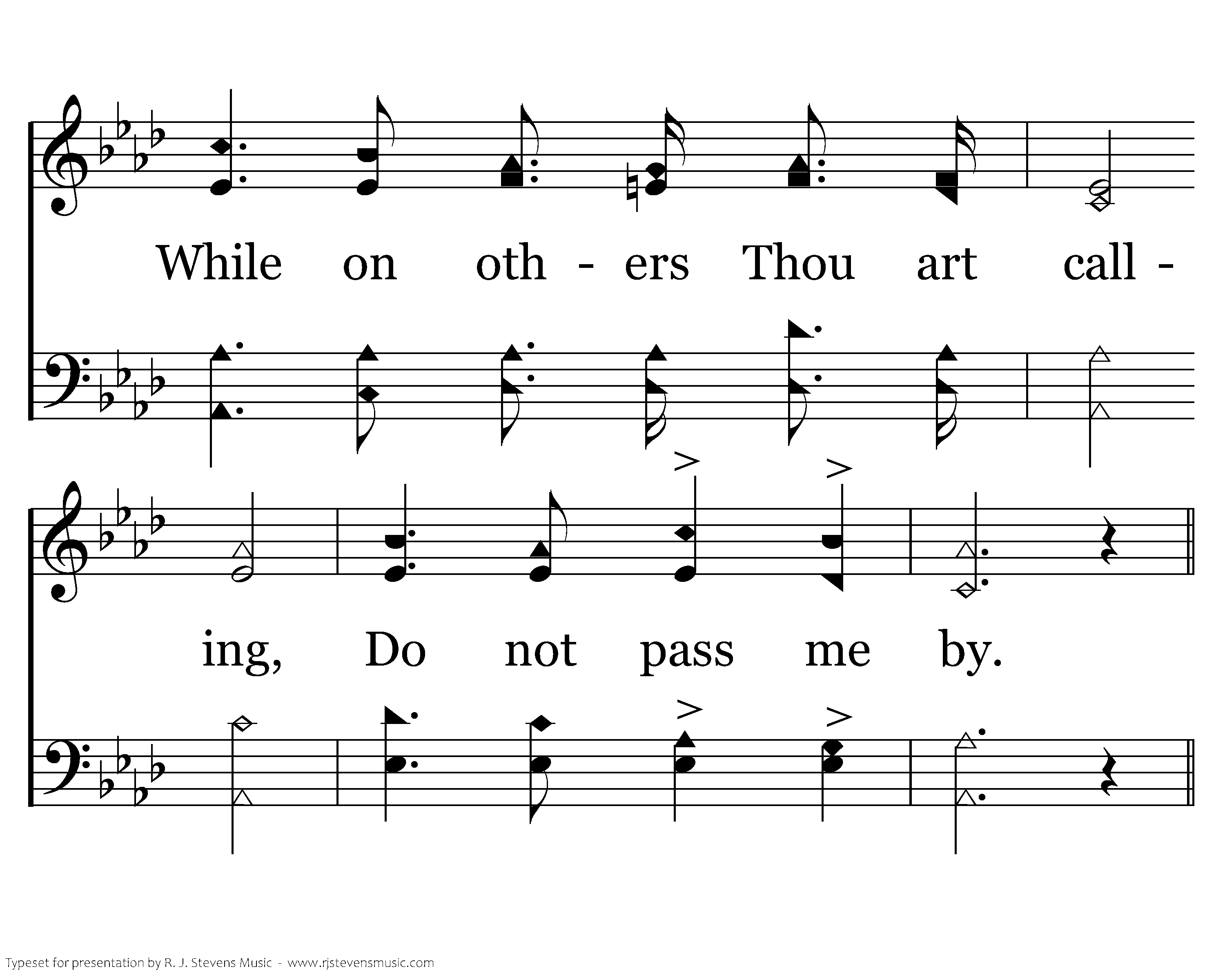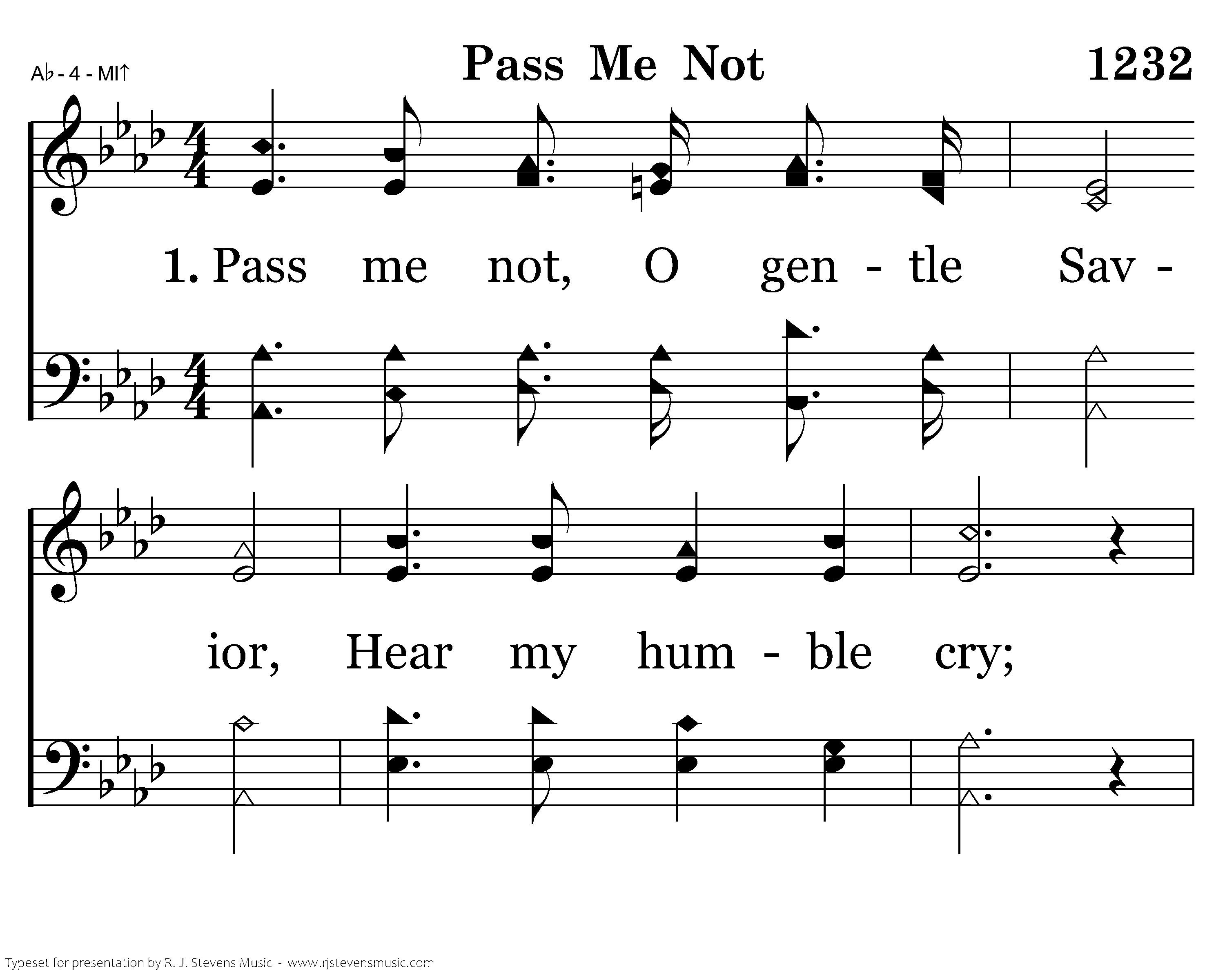 Pass me not, O gentle Savior, Hear my humble cry; While on others Thou art calling, Do not pass me by.