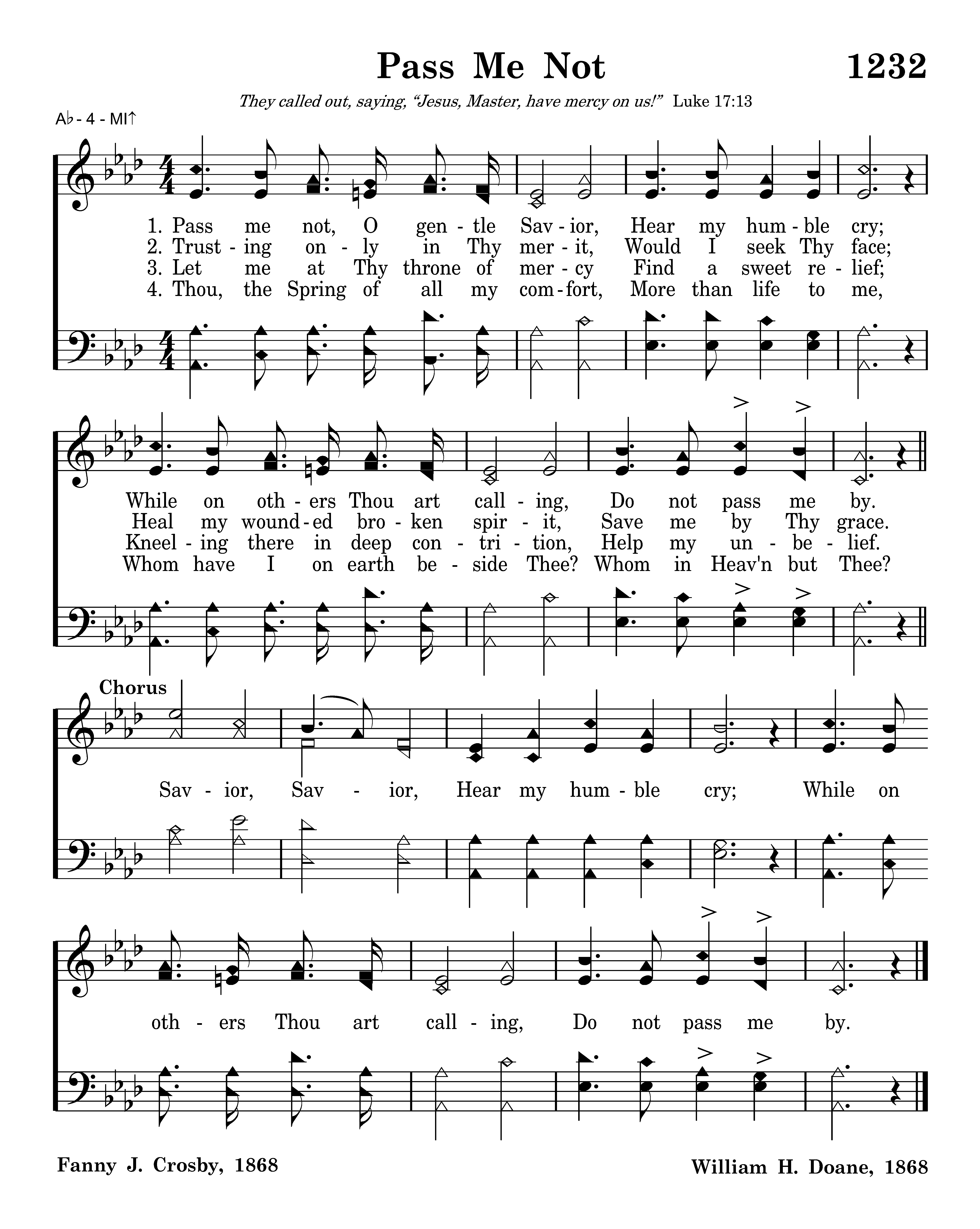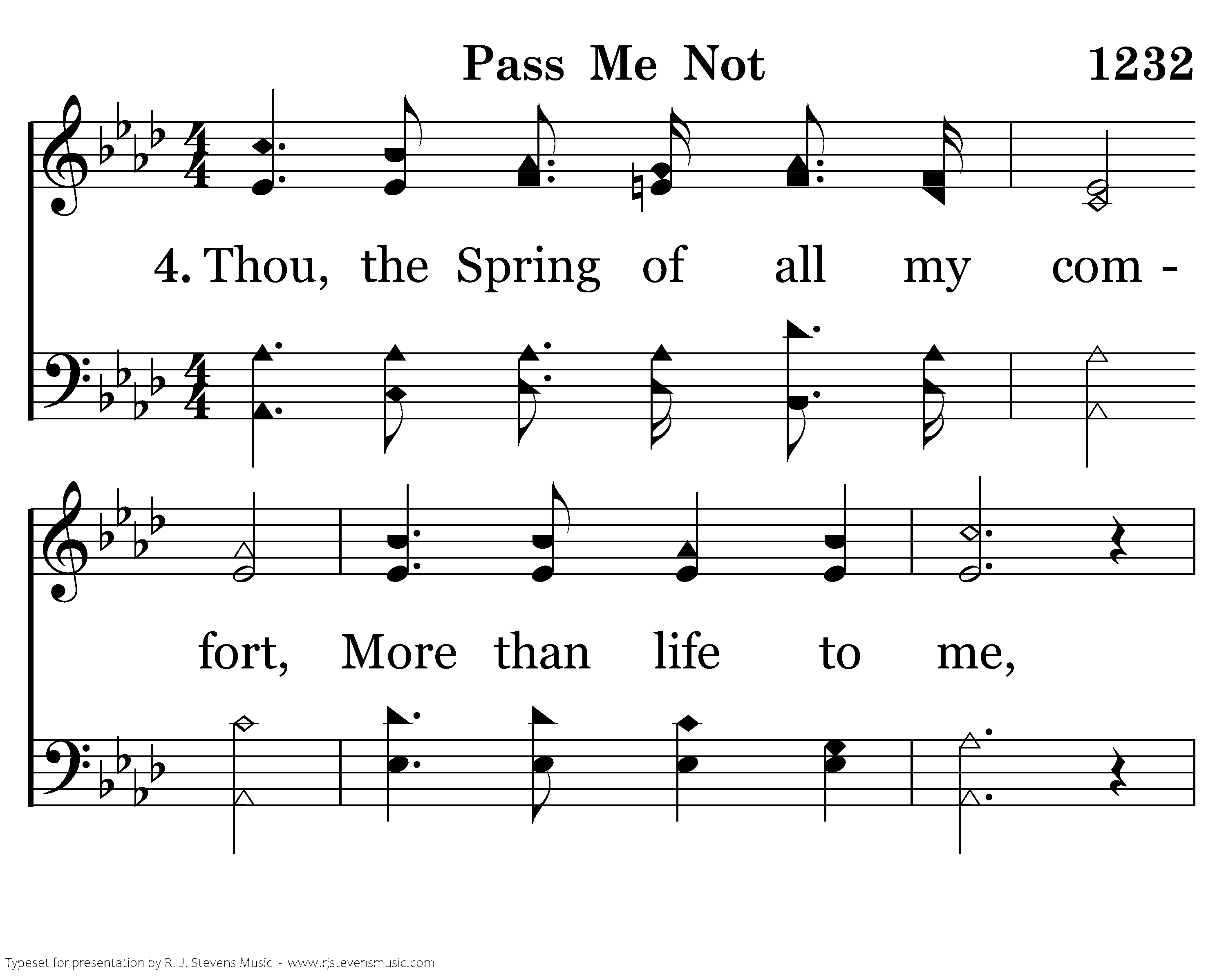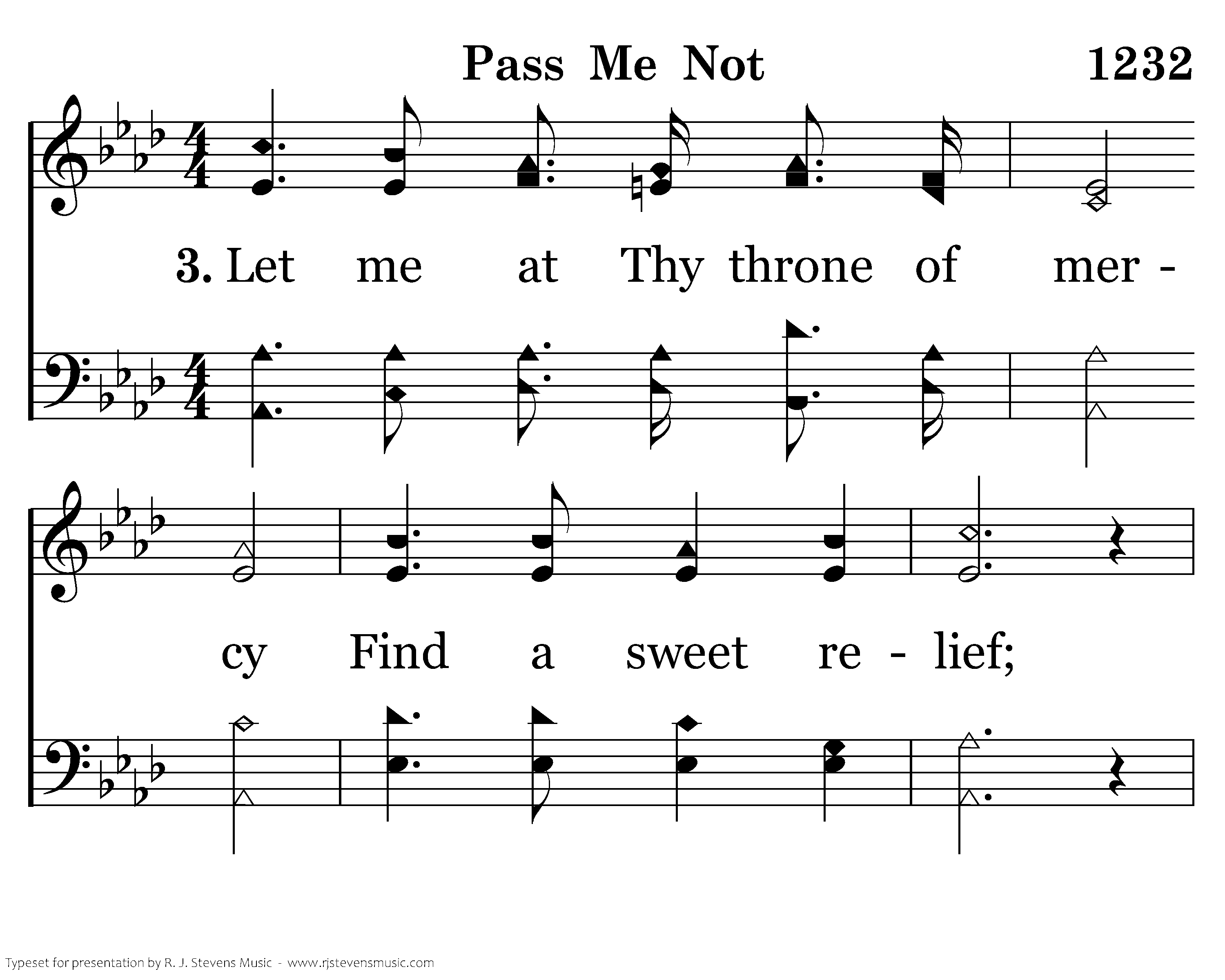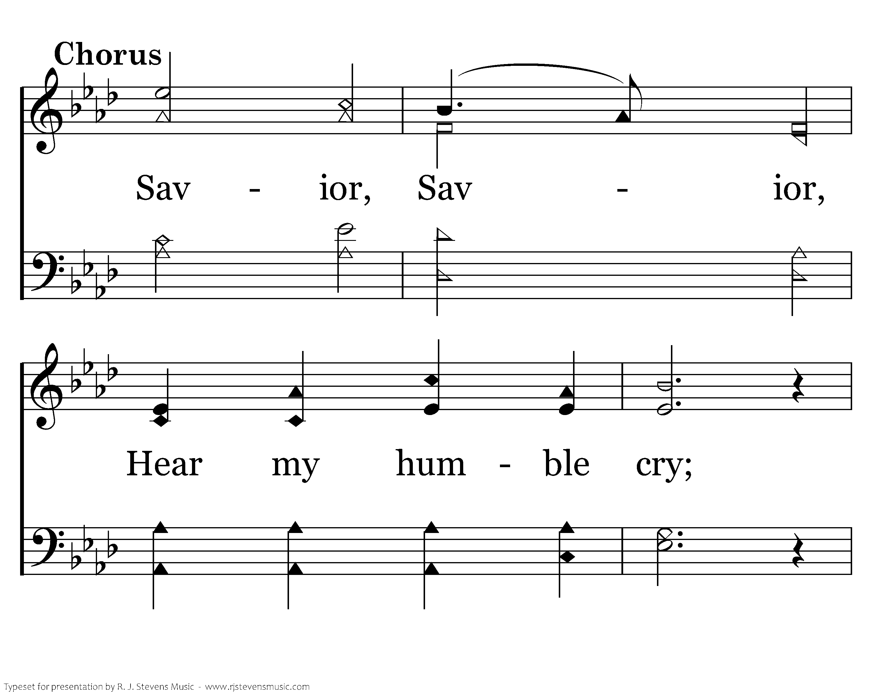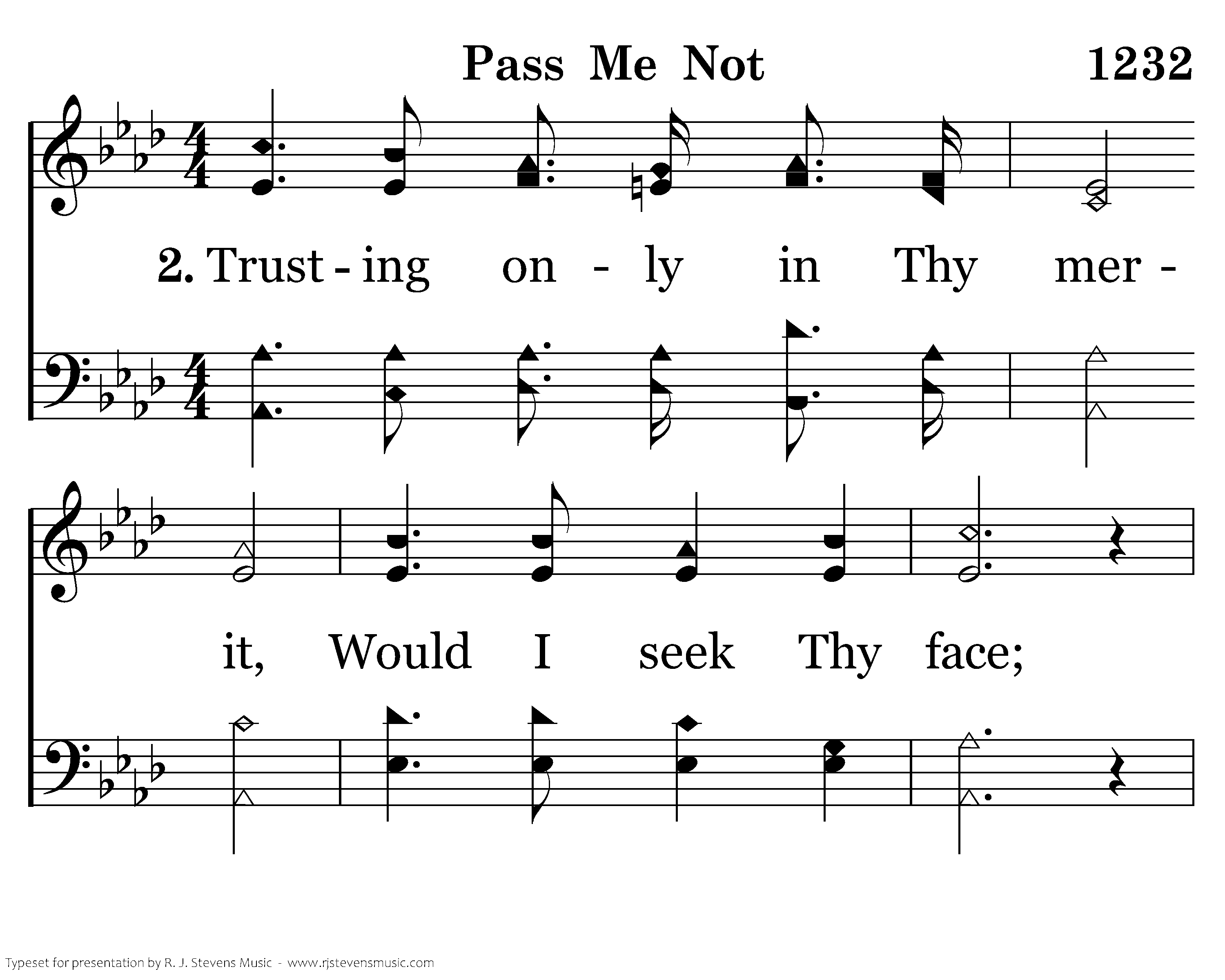 Pass me not, O gentle Savior, Hear my humble cry; While on others Thou art calling, Do not pass me by.