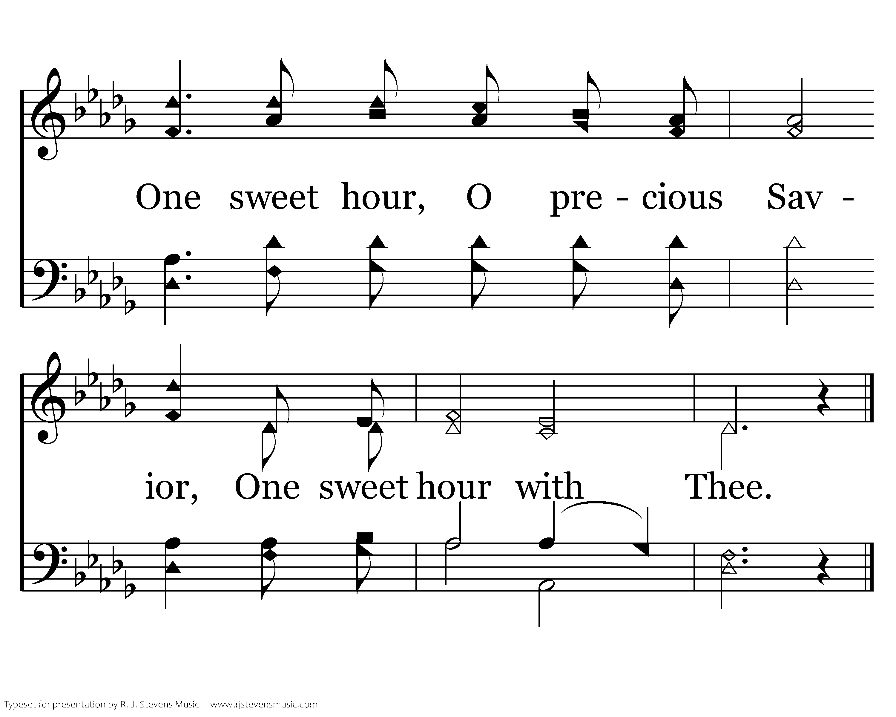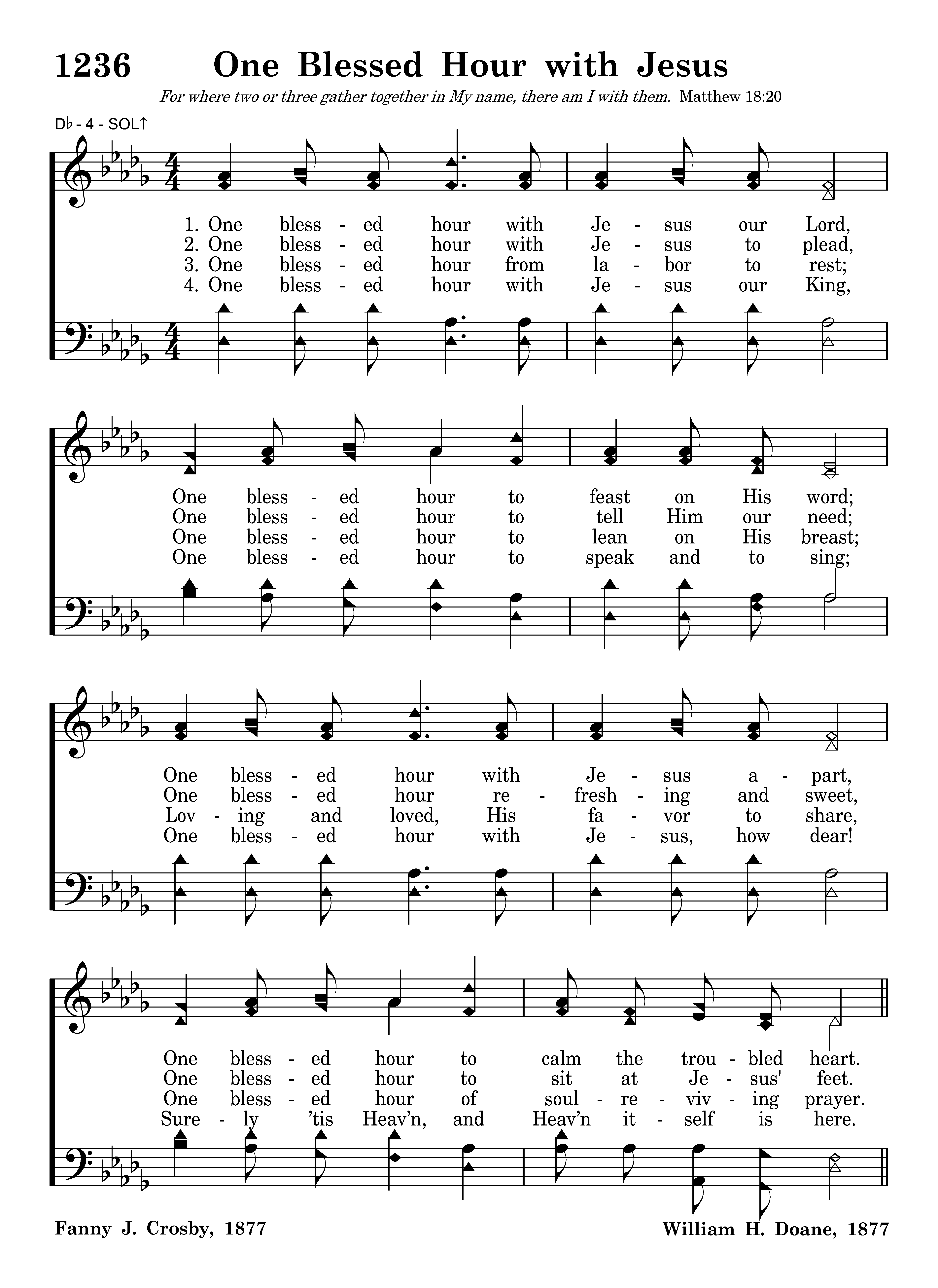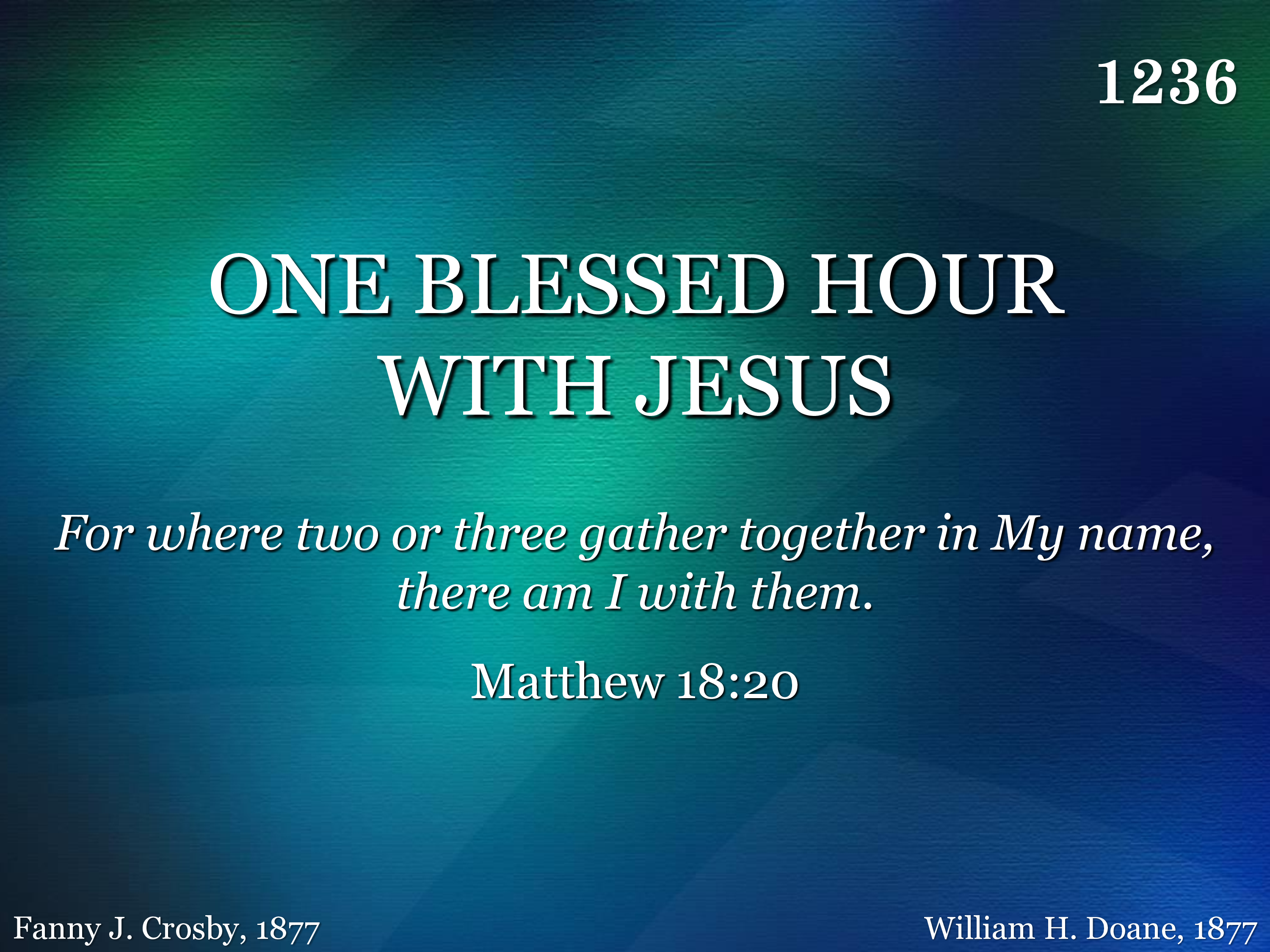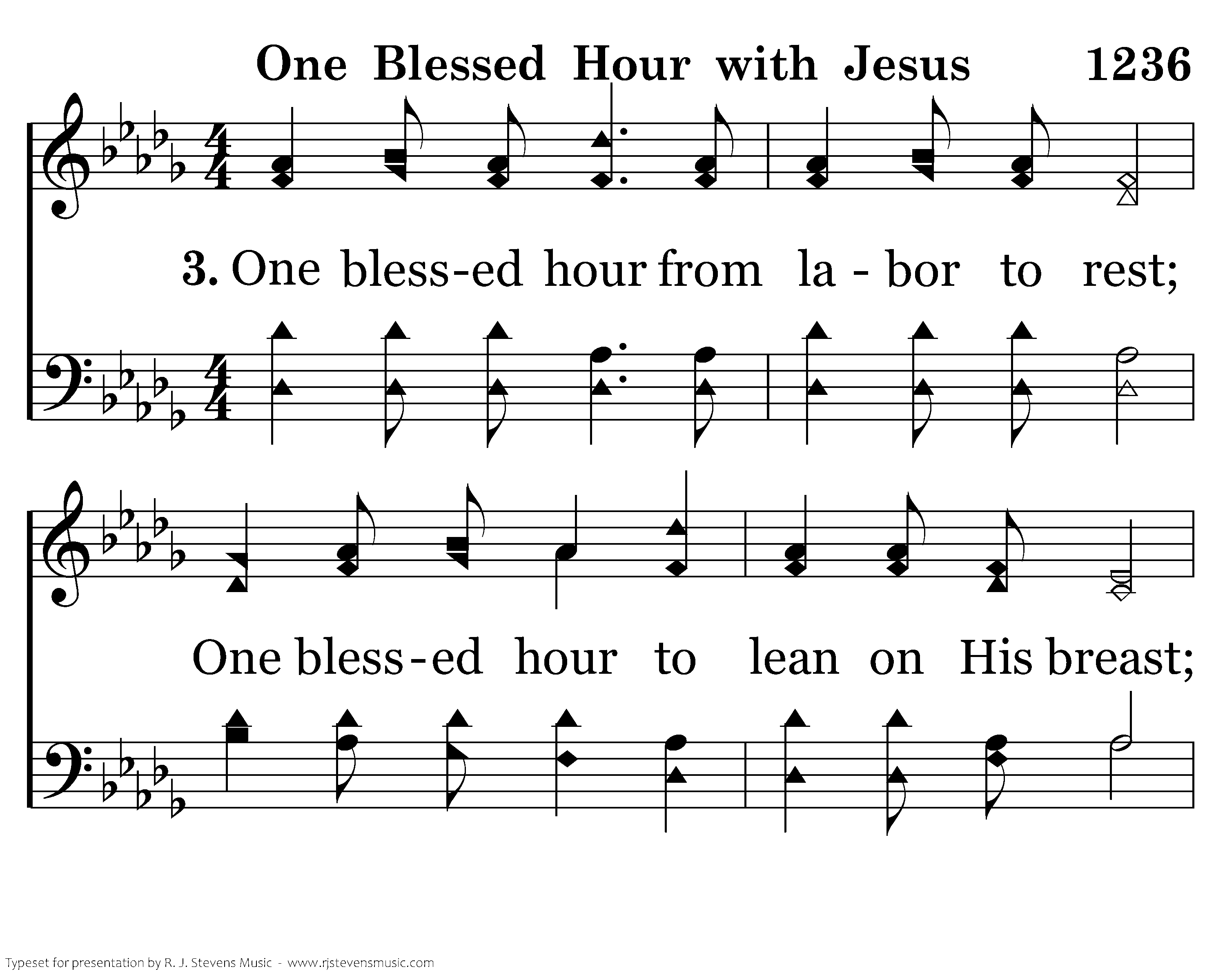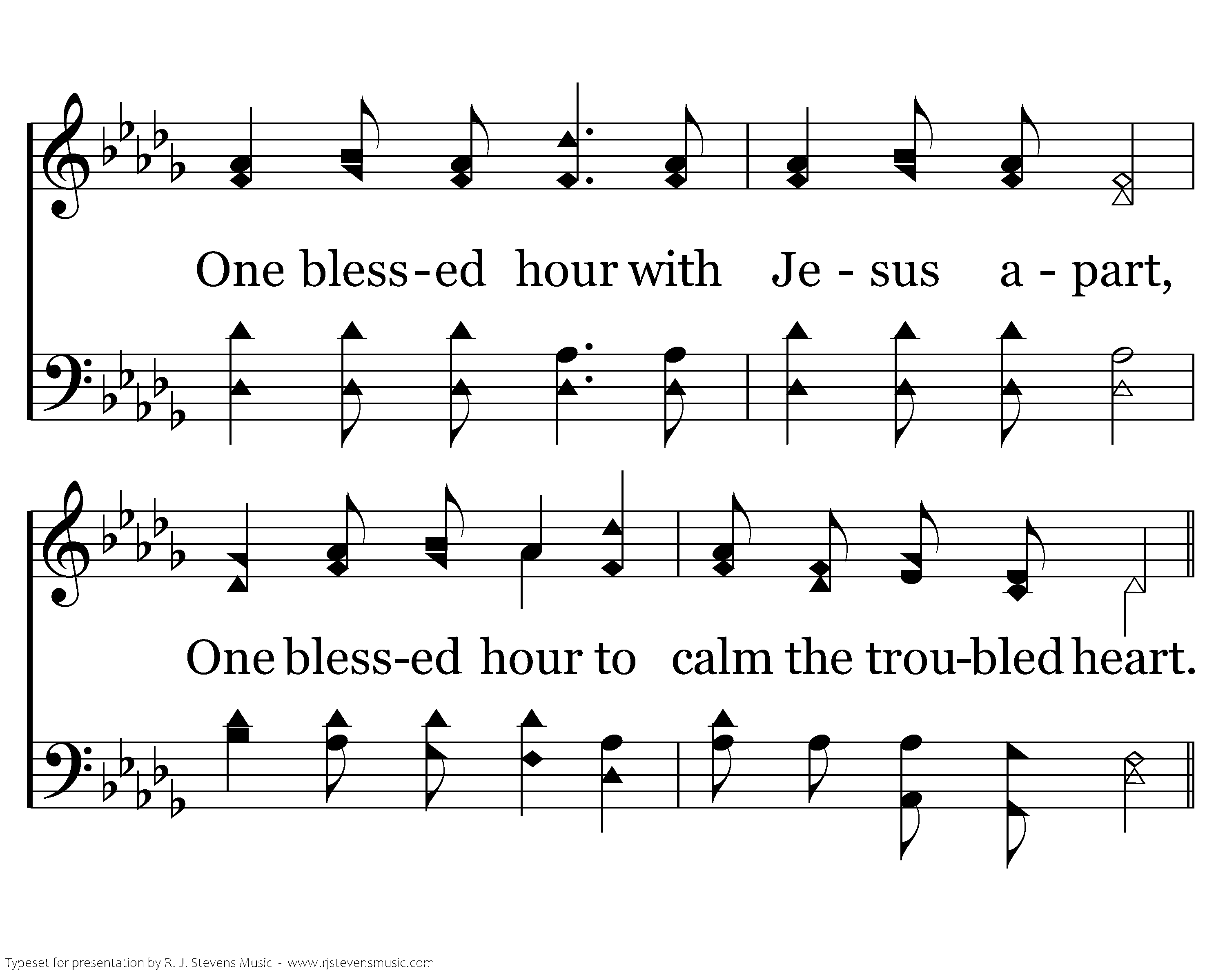 One blessed hour with Jesus our Lord, One blessed hour to feast on His word; One blessed hour with Jesus apart, One blessed hour to calm the troubled heart.