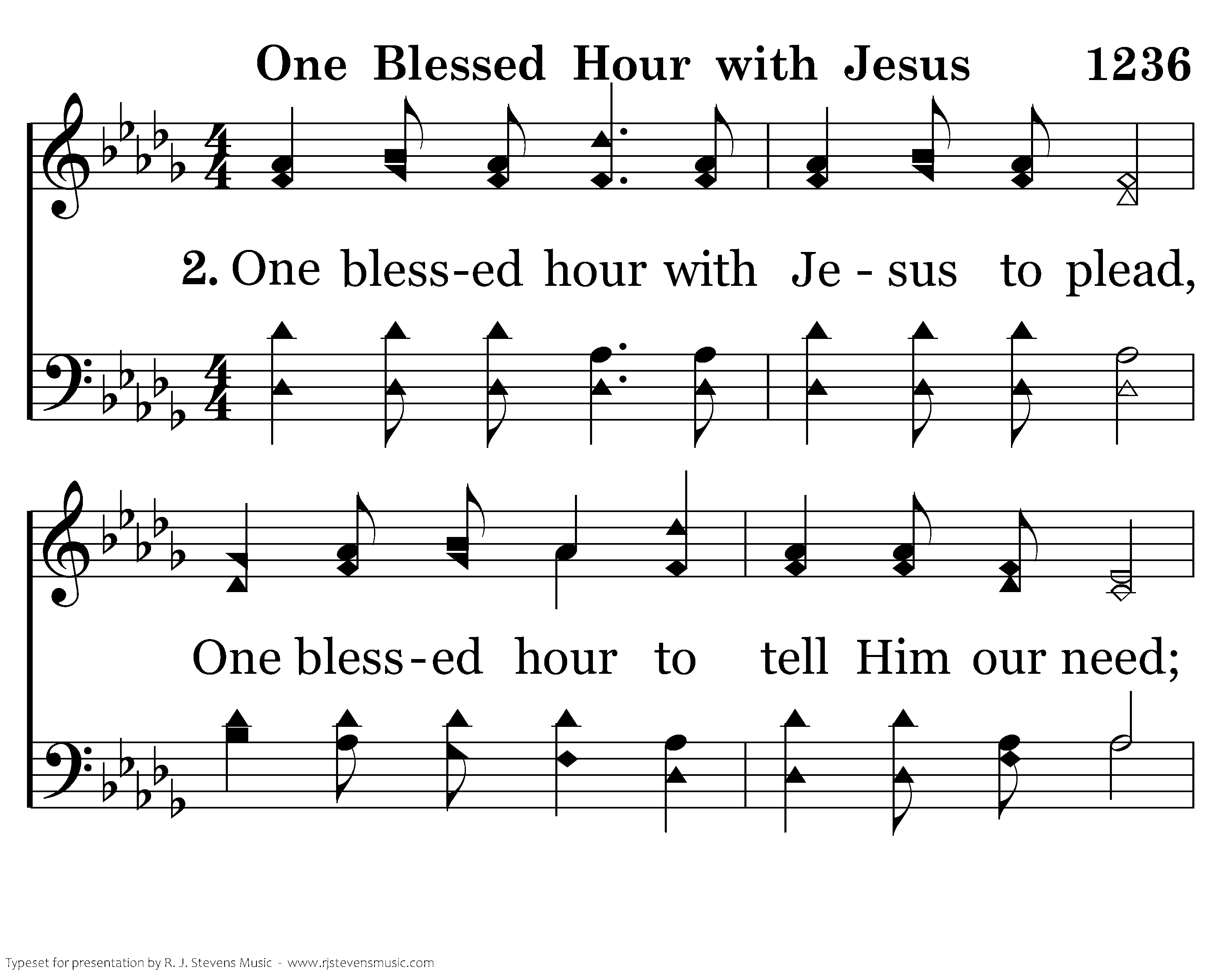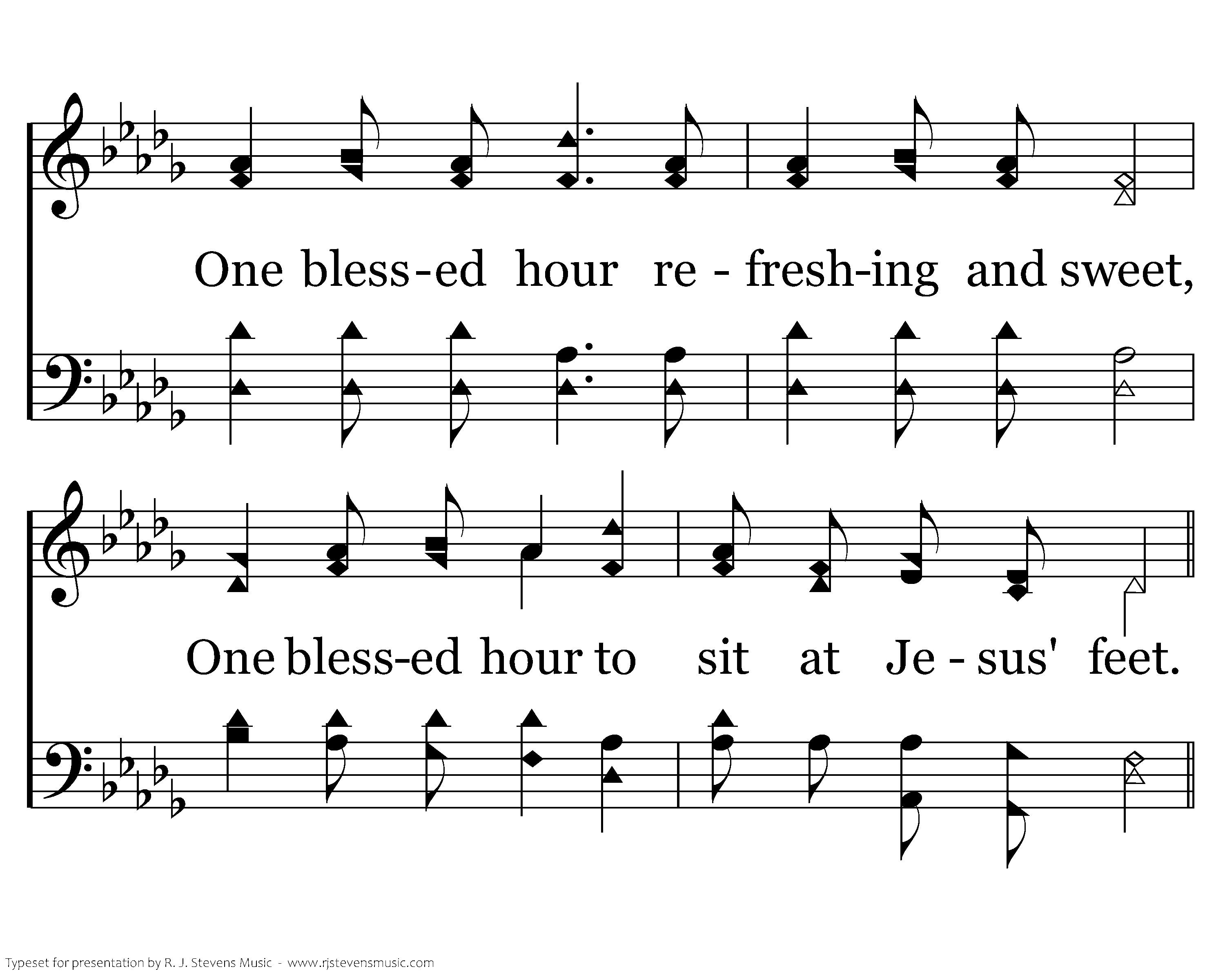 One blessed hour with Jesus to plead, One blessed hour to tell Him our need; One blessed hour refreshing and sweet, One blessed hour to sit at Jesus' feet.
