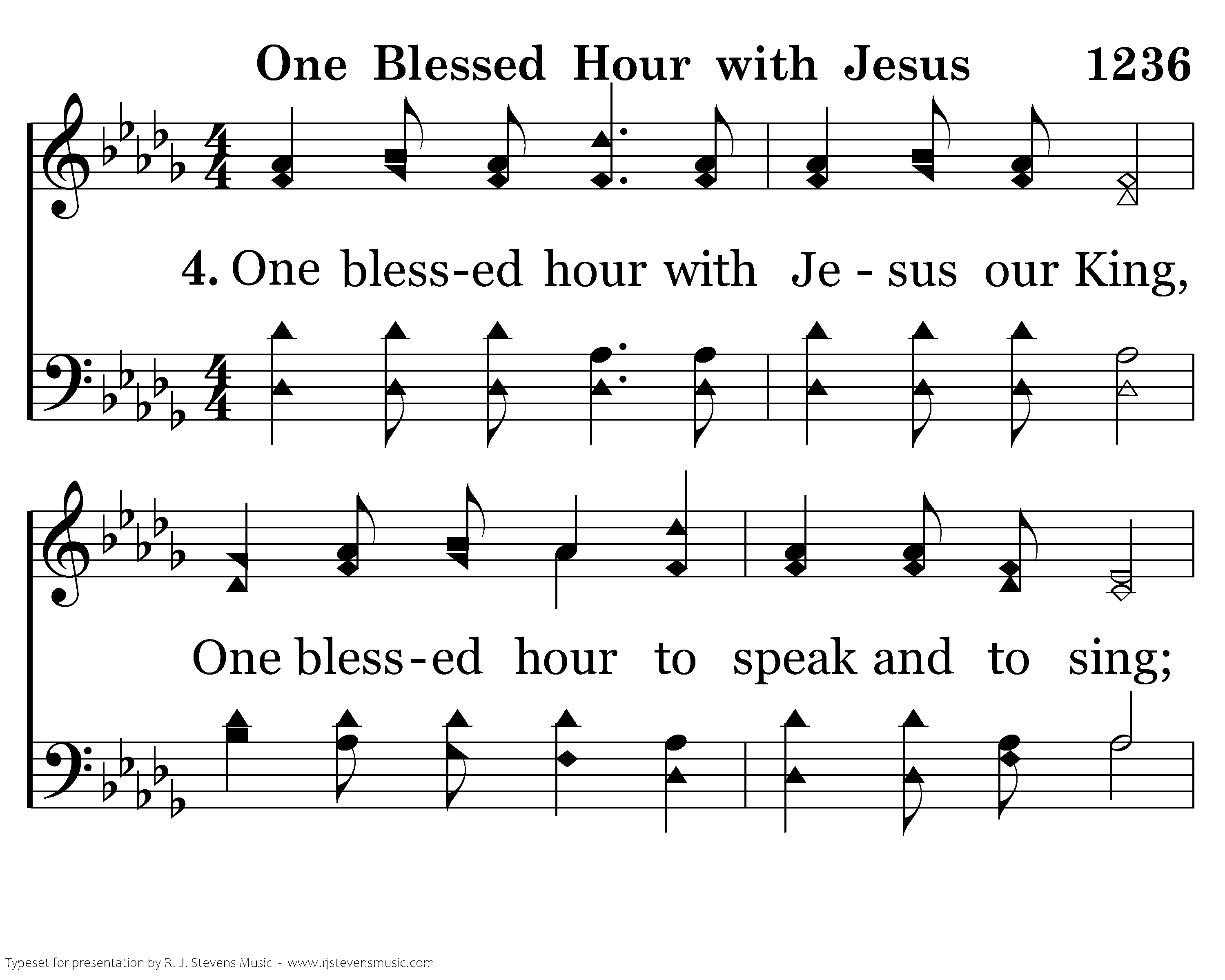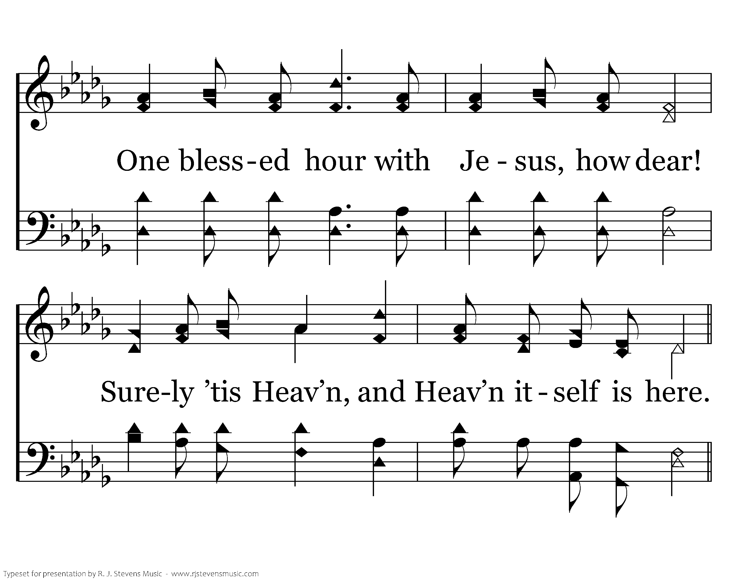 One blessed hour with Jesus our King, One blessed hour to speak and to sing; One blessed hour with Jesus, how dear! Surely ’tis Heav’n, and Heav’n itself is here.