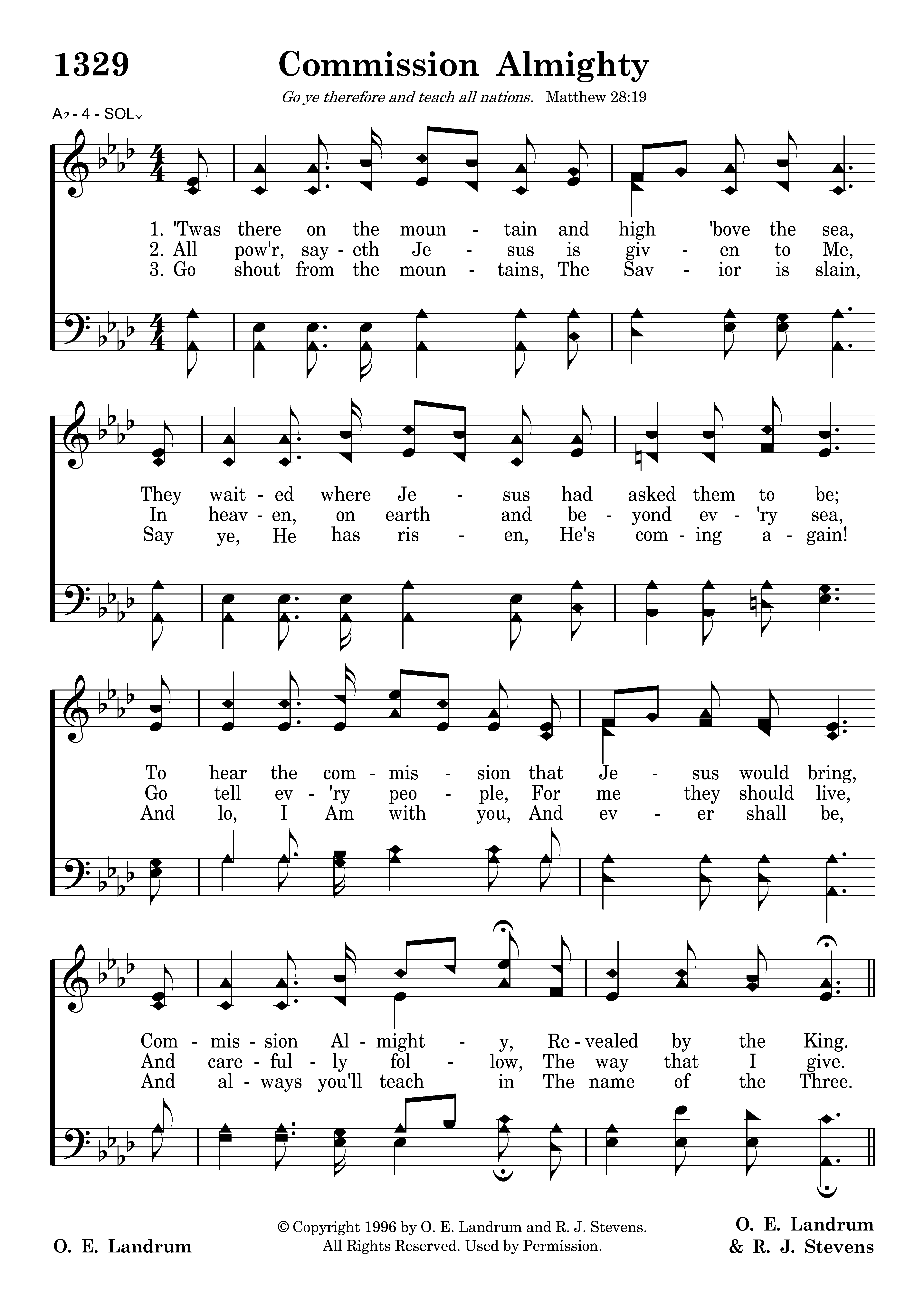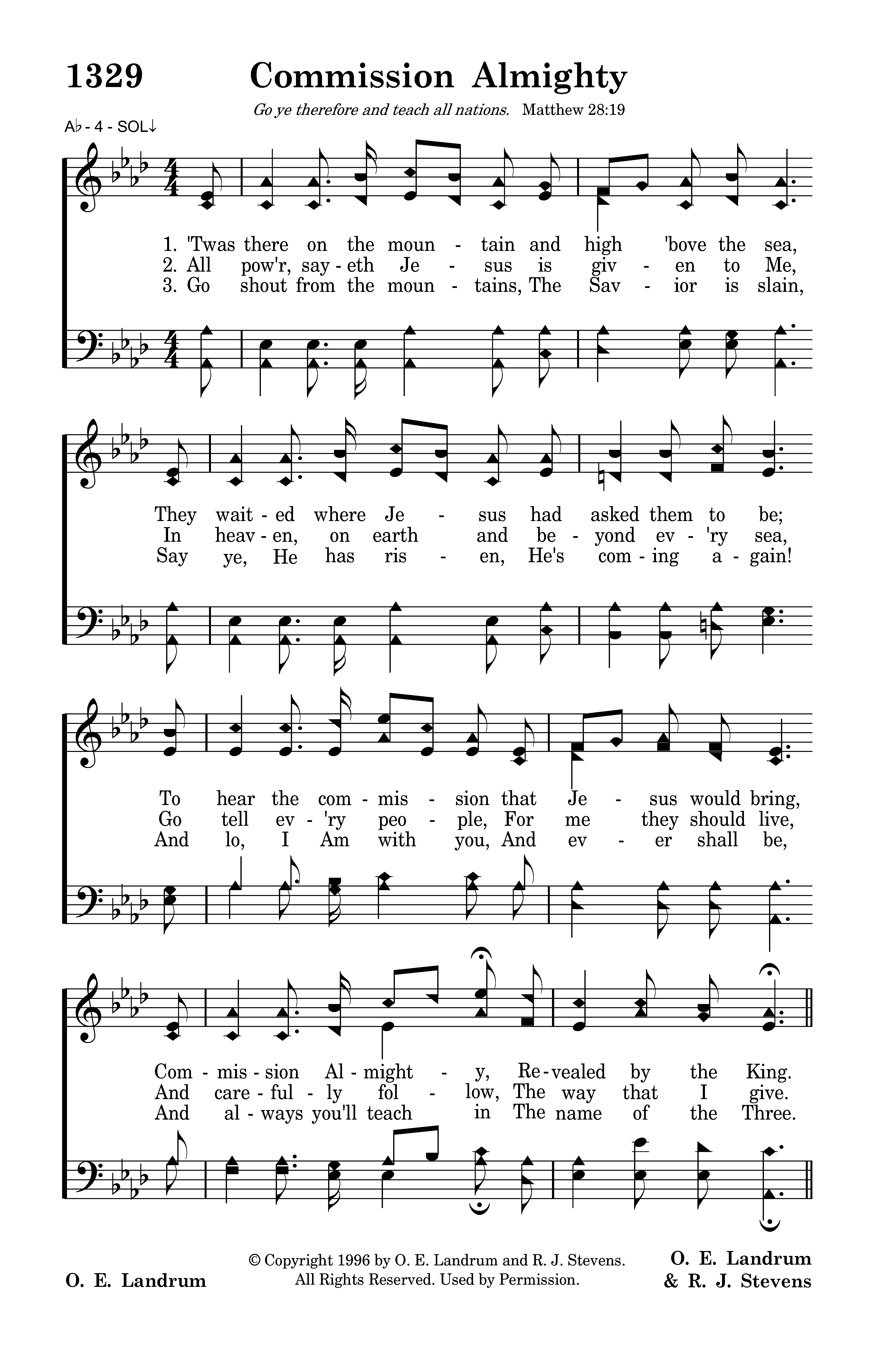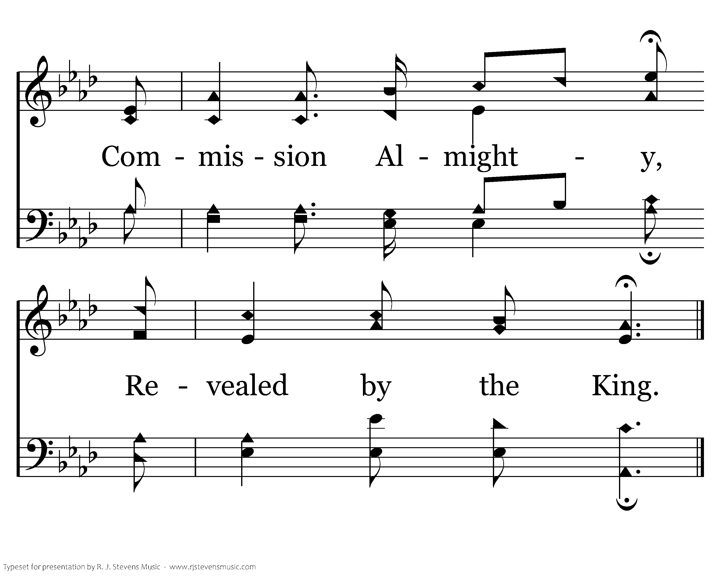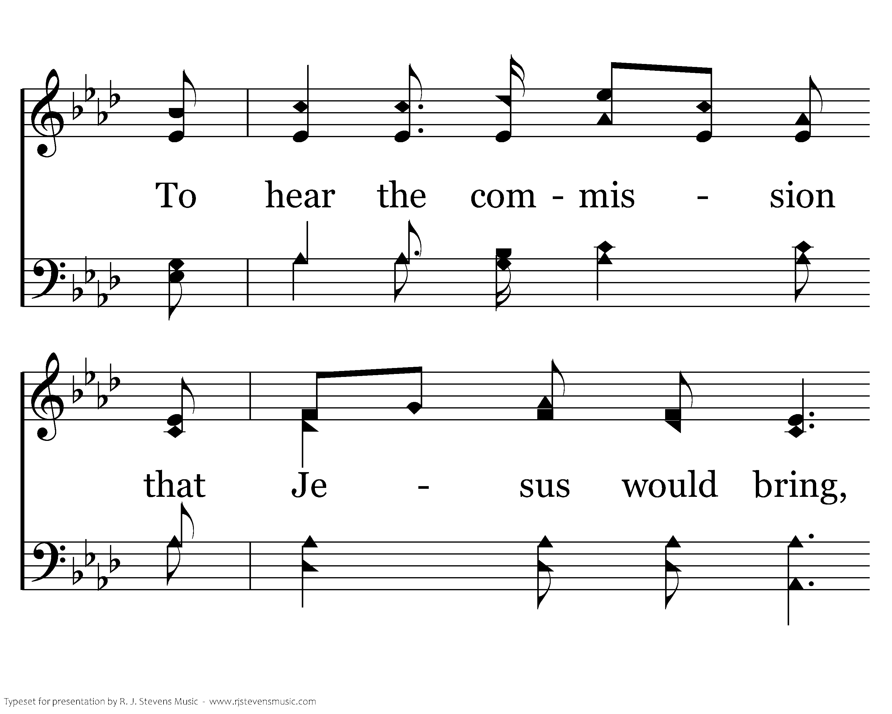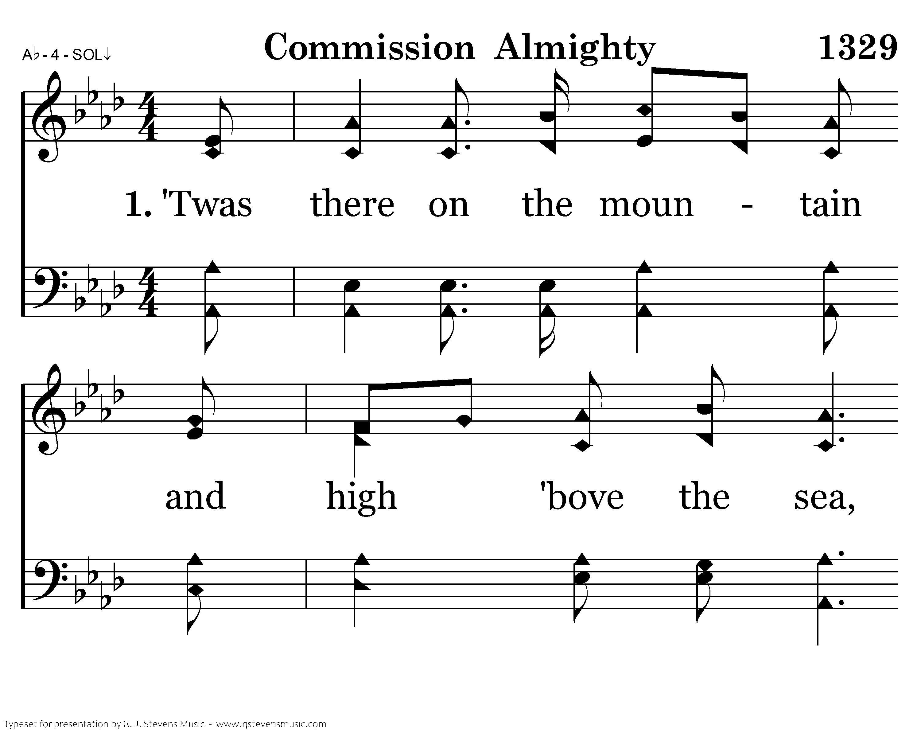 Twas there on the mountain and high 'bove the sea, They waited where Je-sus had asked them to be; To hear the commission that Jesus would bring, Commission Almighty, Revealed by the King.