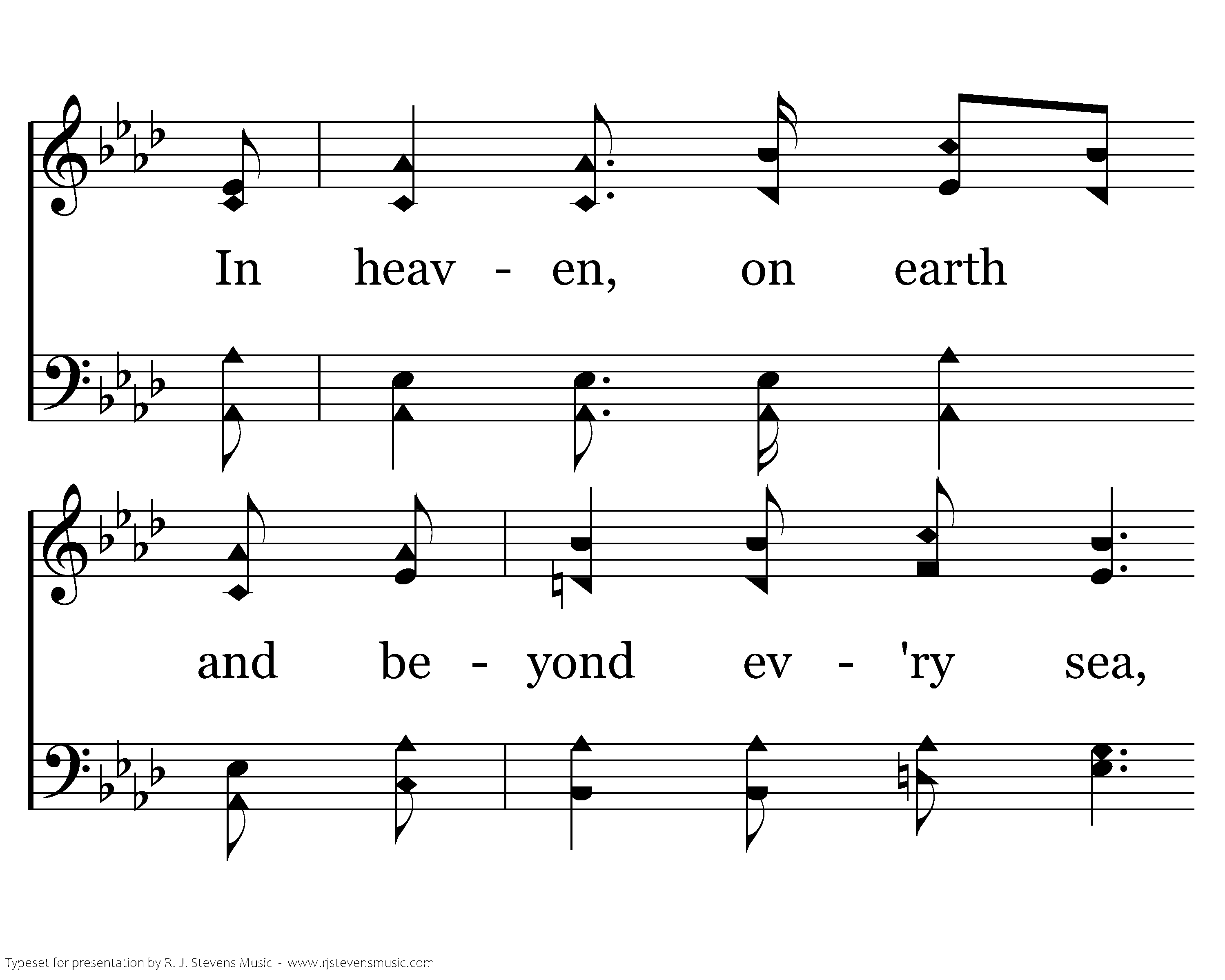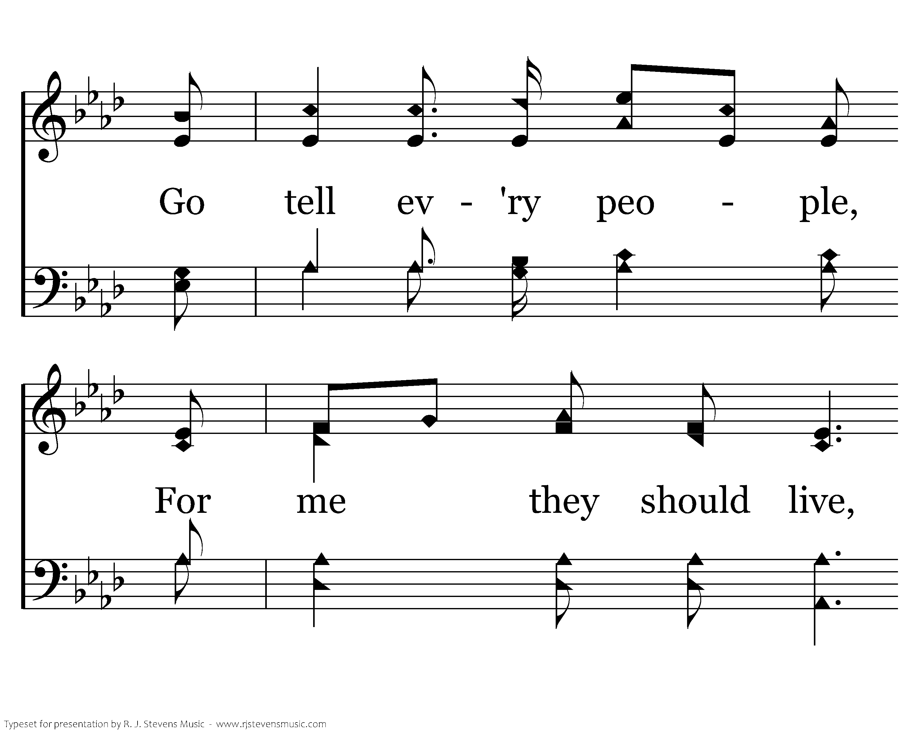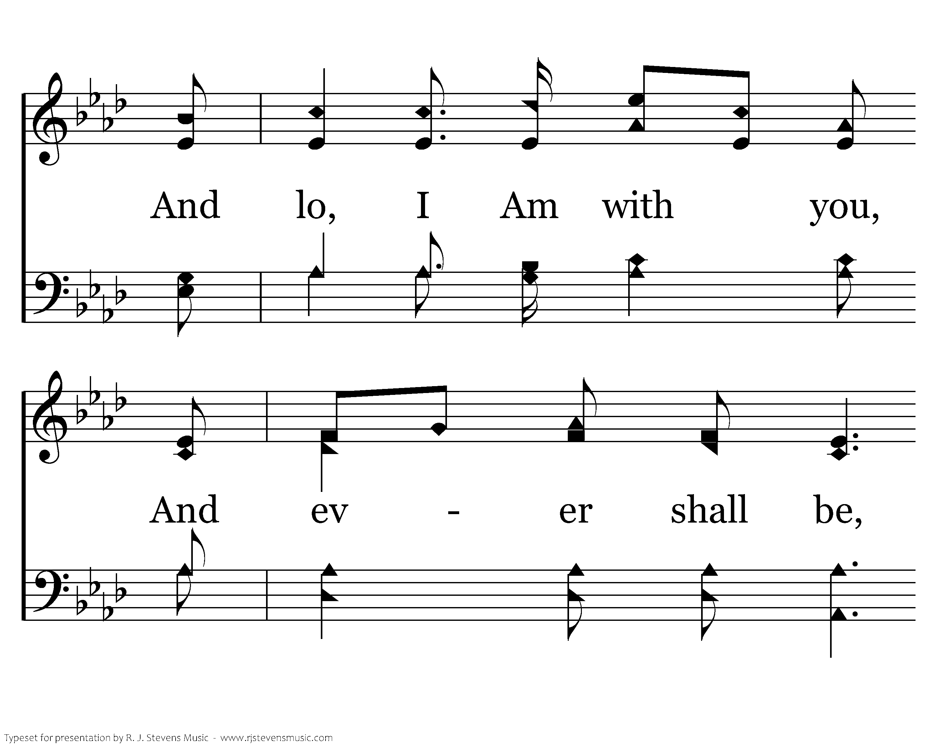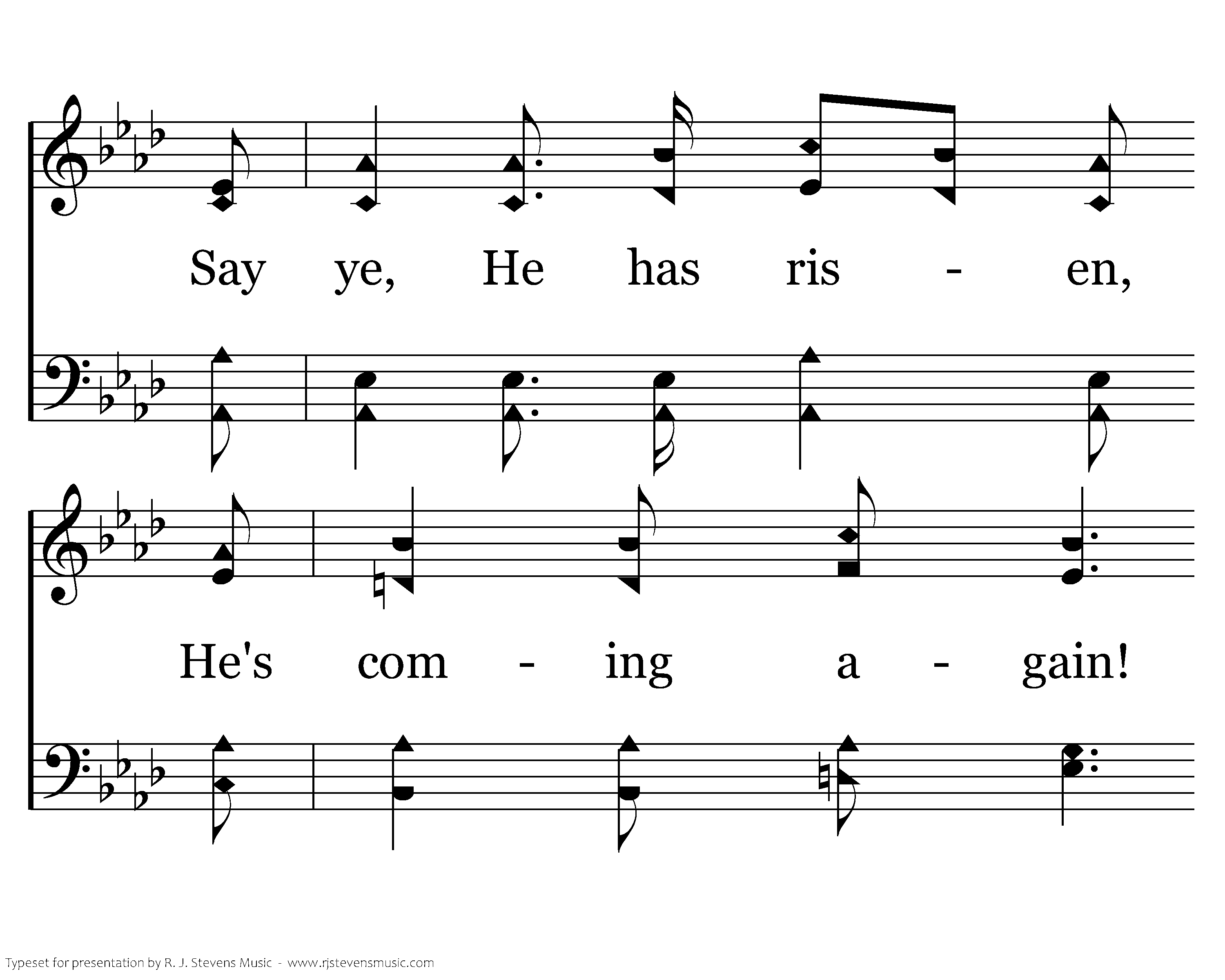 Go shout from the mountains, The Savior is slain, Say ye, He has risen, He's coming again! And lo, I Am with you, And ever shall be, And always you'll teach in The name of the Three.