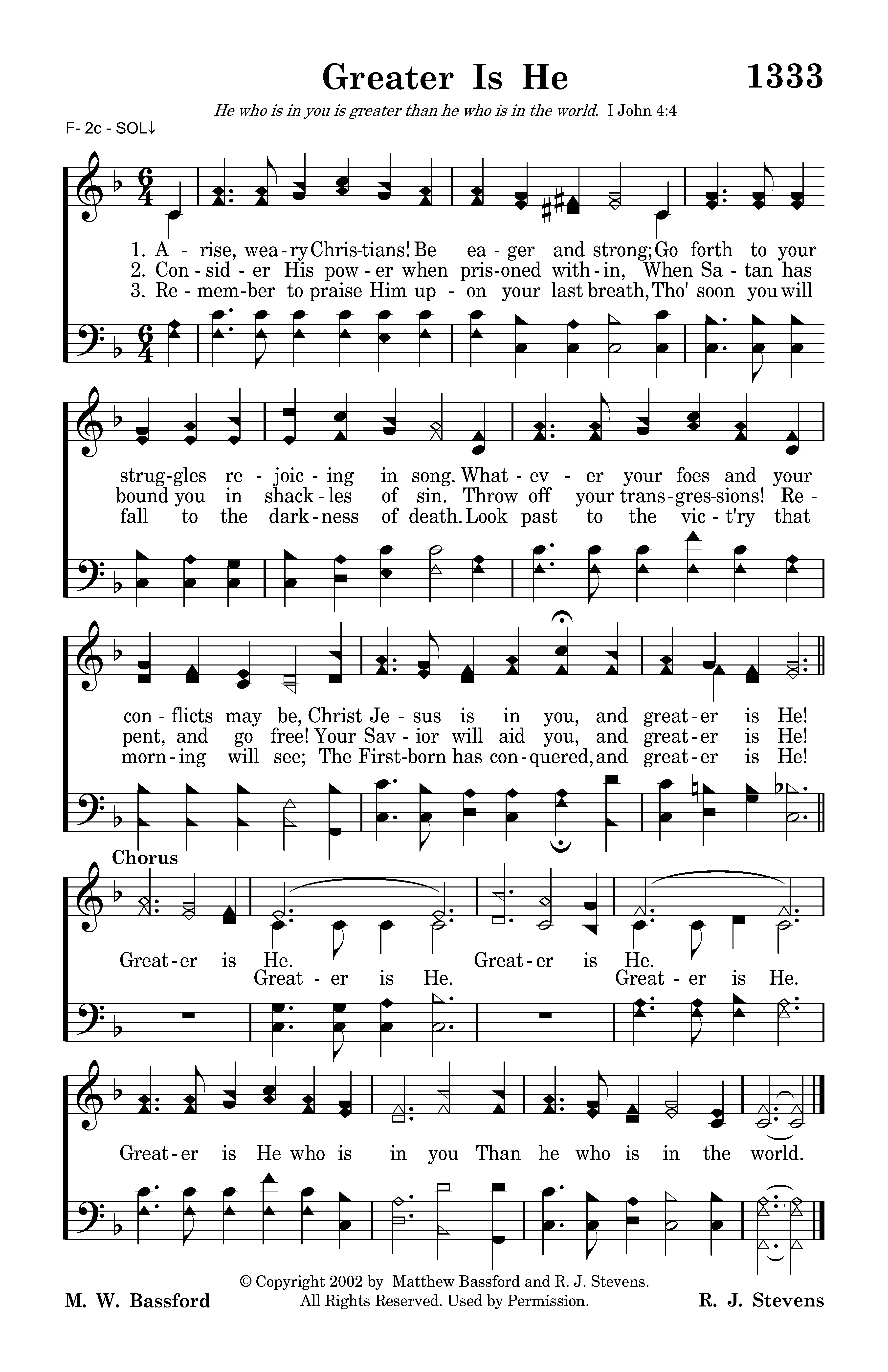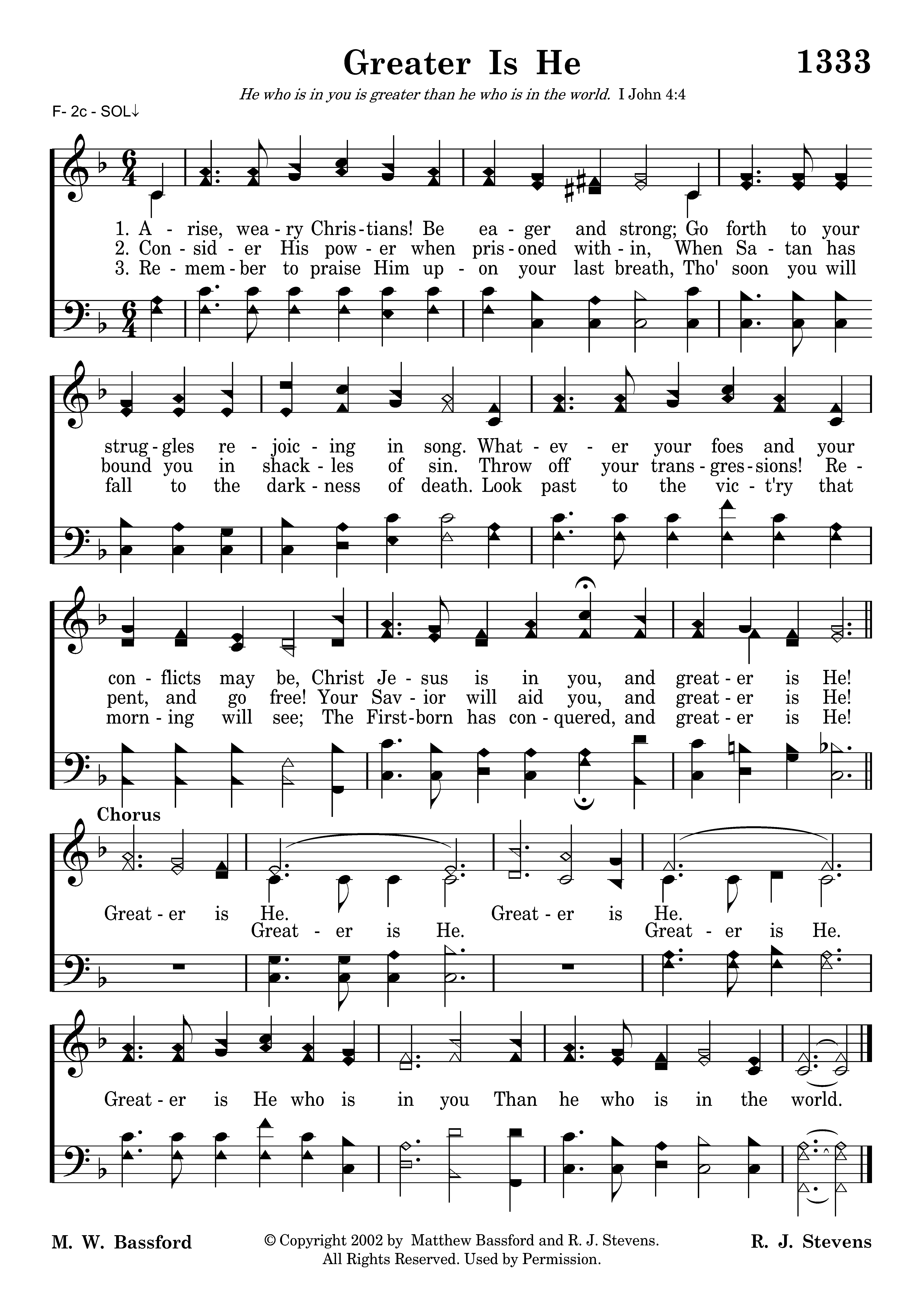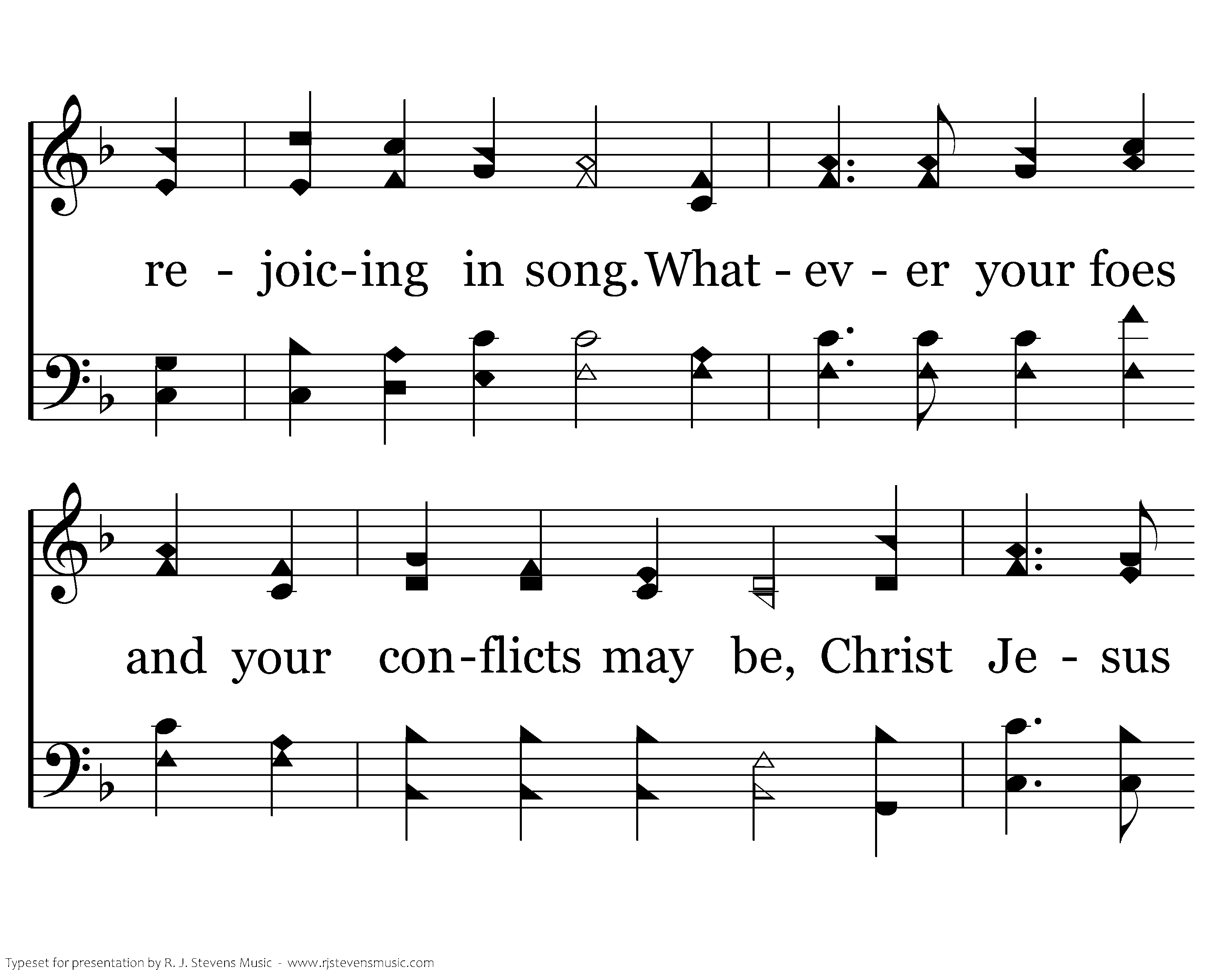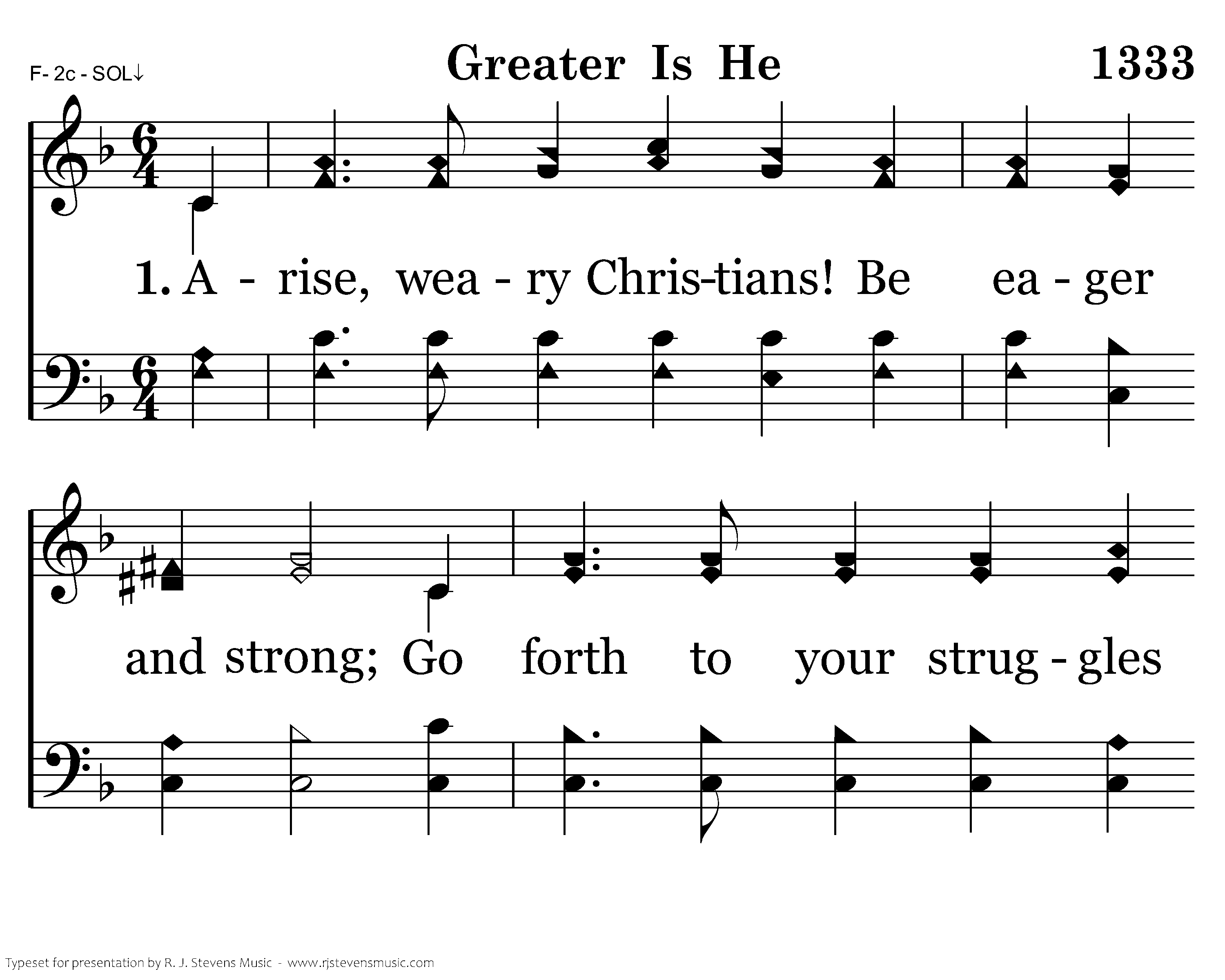 Arise, weary Christians! Be eager and strong; Go forth to your struggles rejoicing in song. Whatever your foes and your conflicts may be, Christ Jesus is in you, and greater is He!