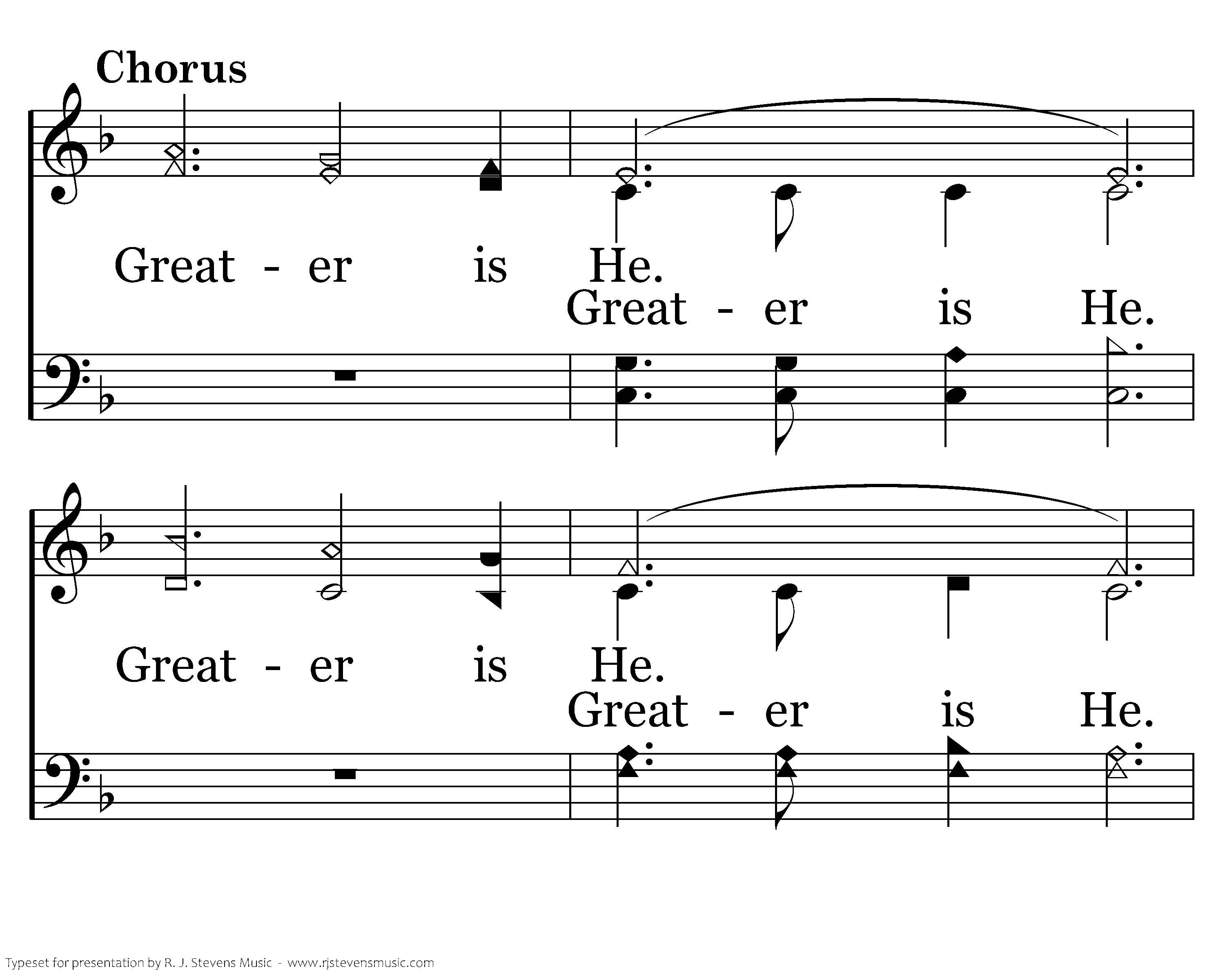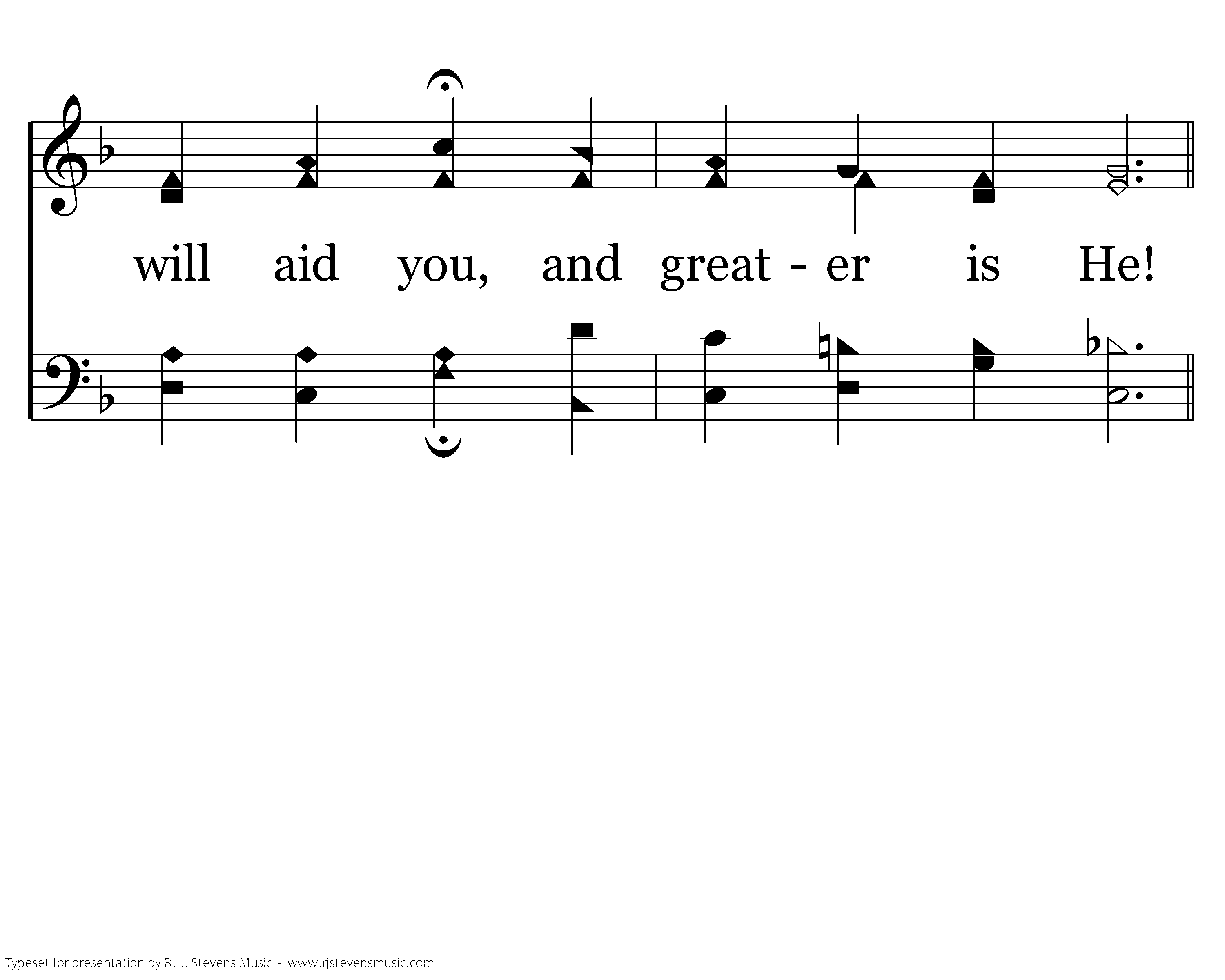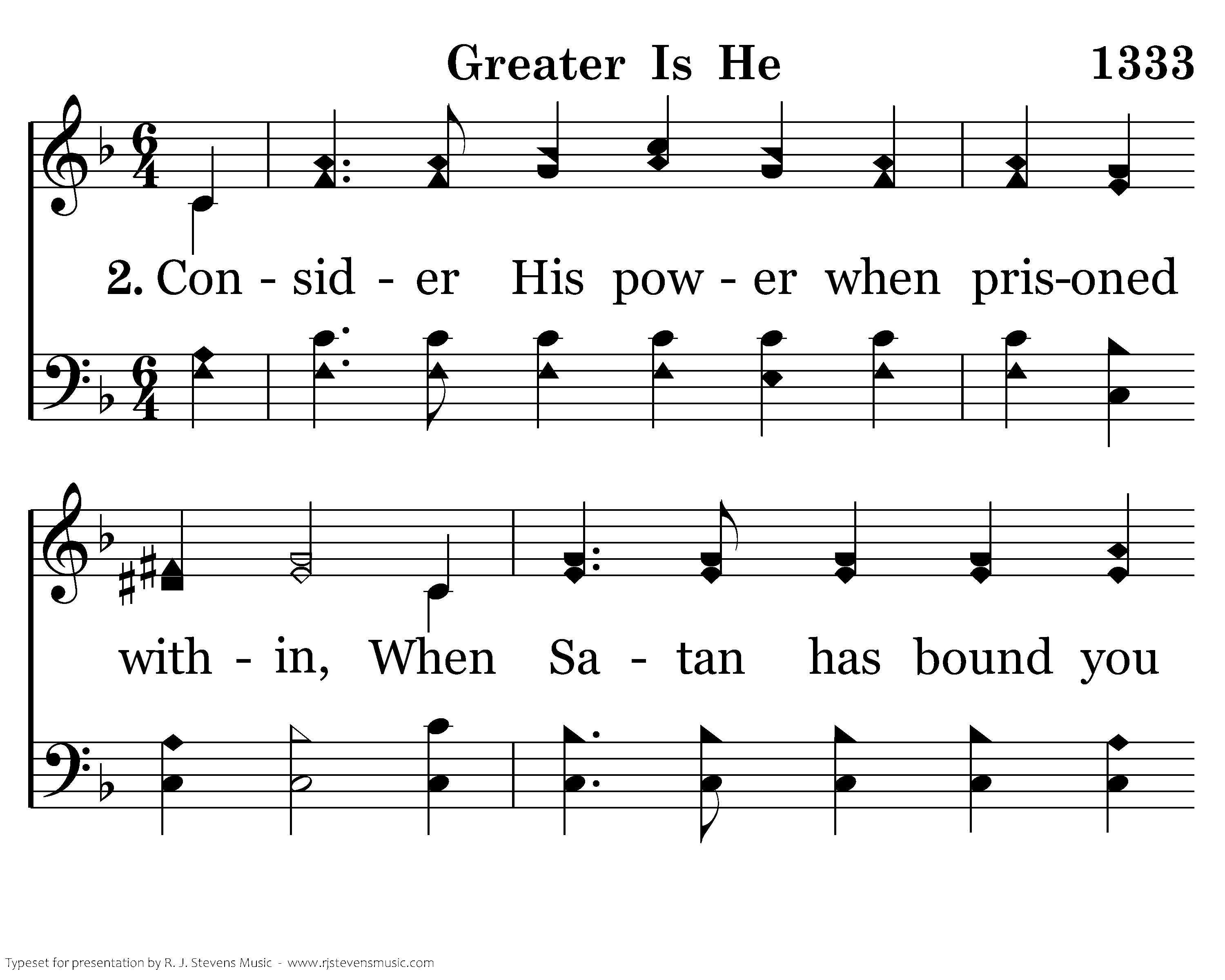 Consider His power when prisoned within, When Satan has bound you in shackles of sin. Throw off your transgressions! Repent, and go free! Your Savior will aid you, and greater is He!