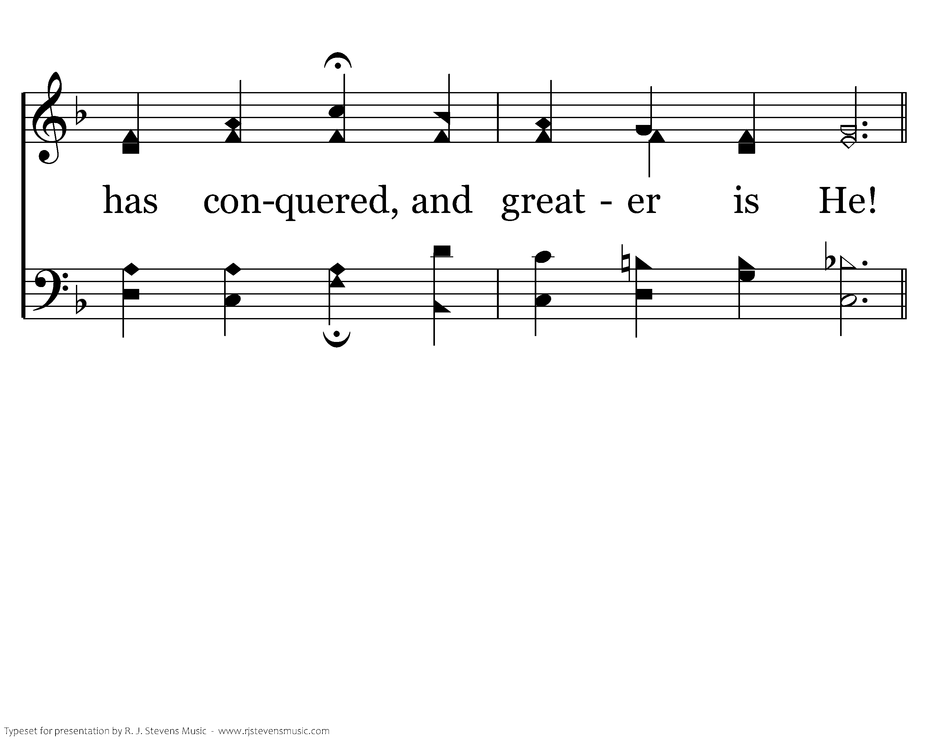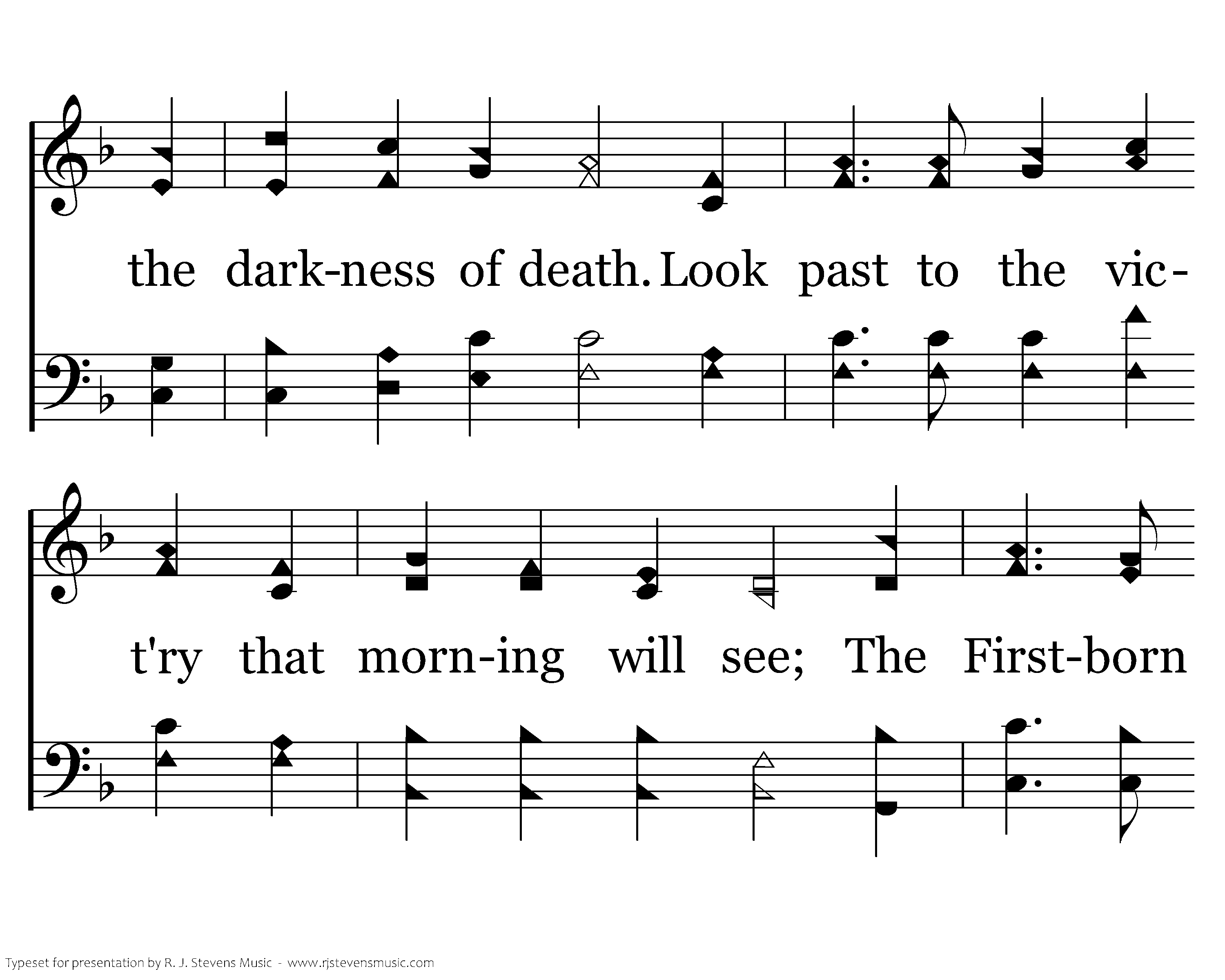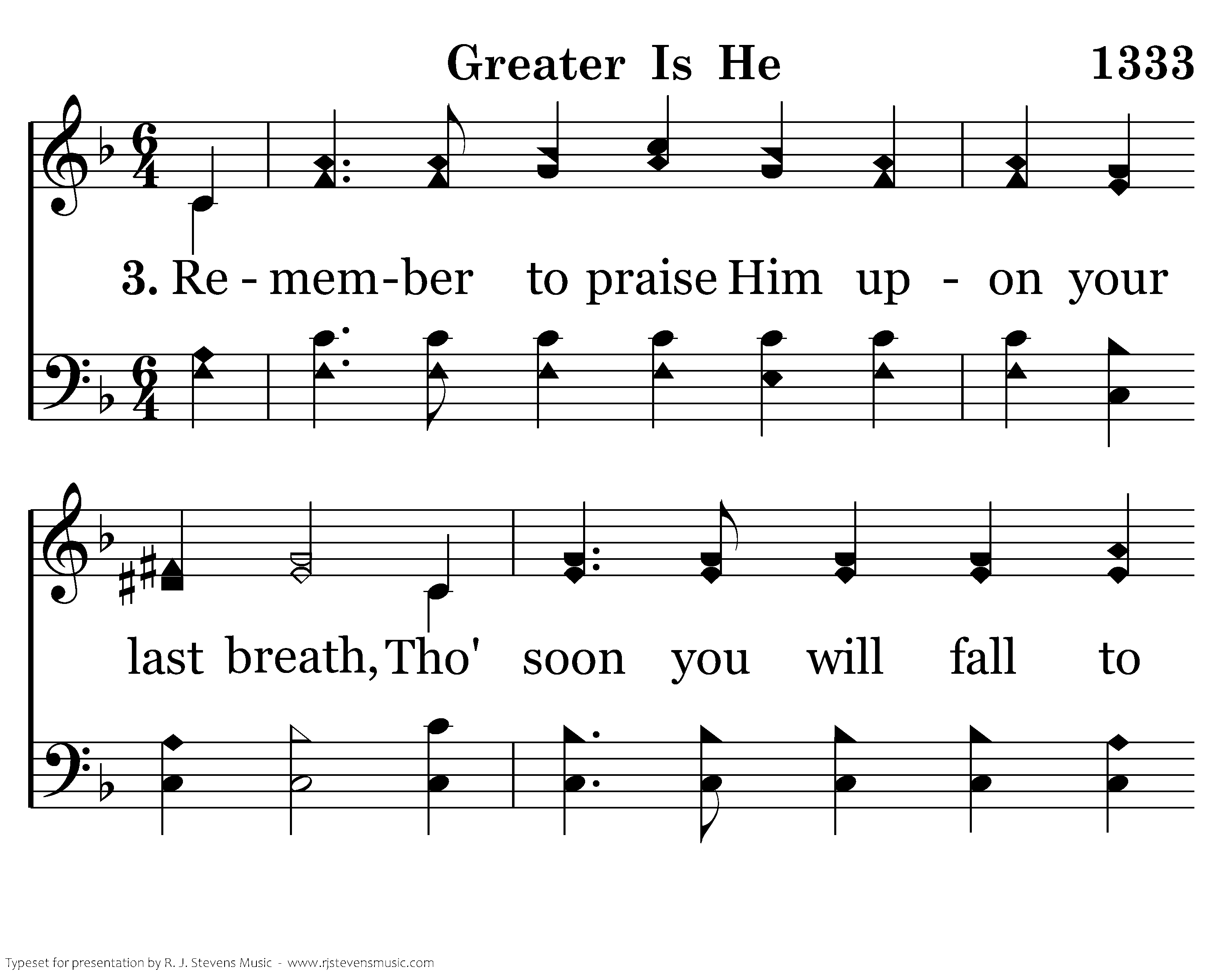 Remember to praise Him upon your last breath, Tho' soon you will fall to the darkness of death. Look past to the vict'ry that morning will see; The Firstborn has conquered, and greater is He!