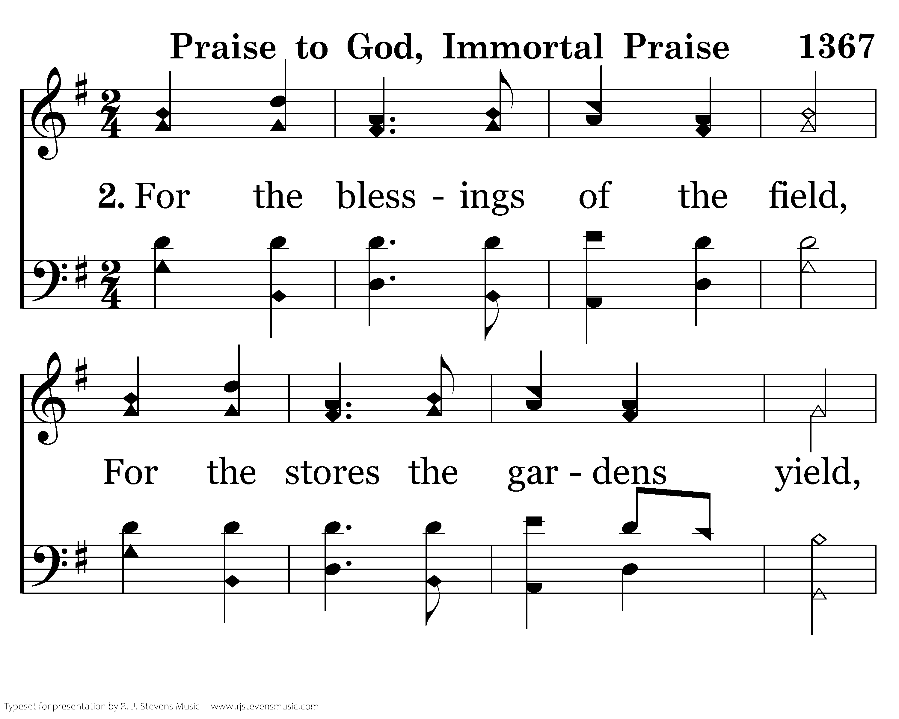 For the blessings of the field, For the stores the gardens yield, For the joy which harvests bring, Grateful praises now we sing.