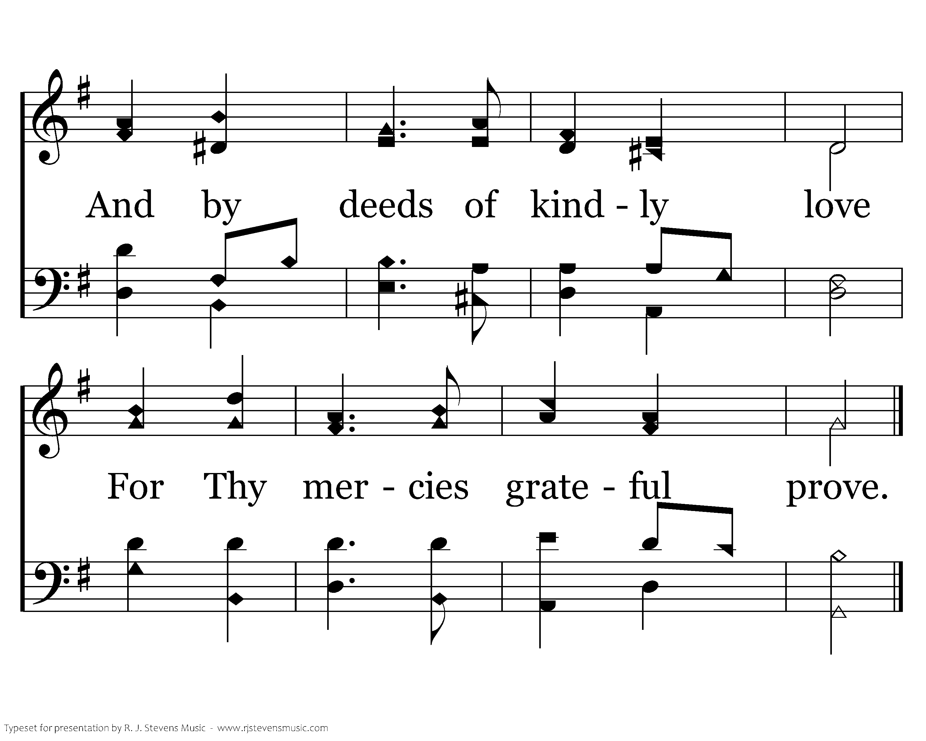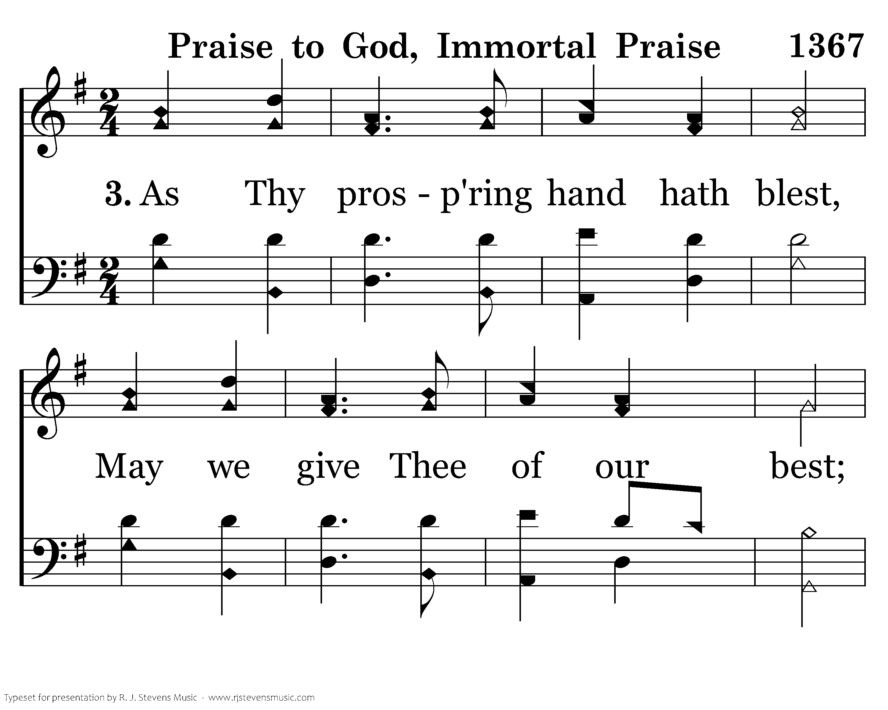 As Thy prosp'ring hand hath blest, May we give Thee of our best; And by deeds of kindly love For Thy mercies grateful prove.