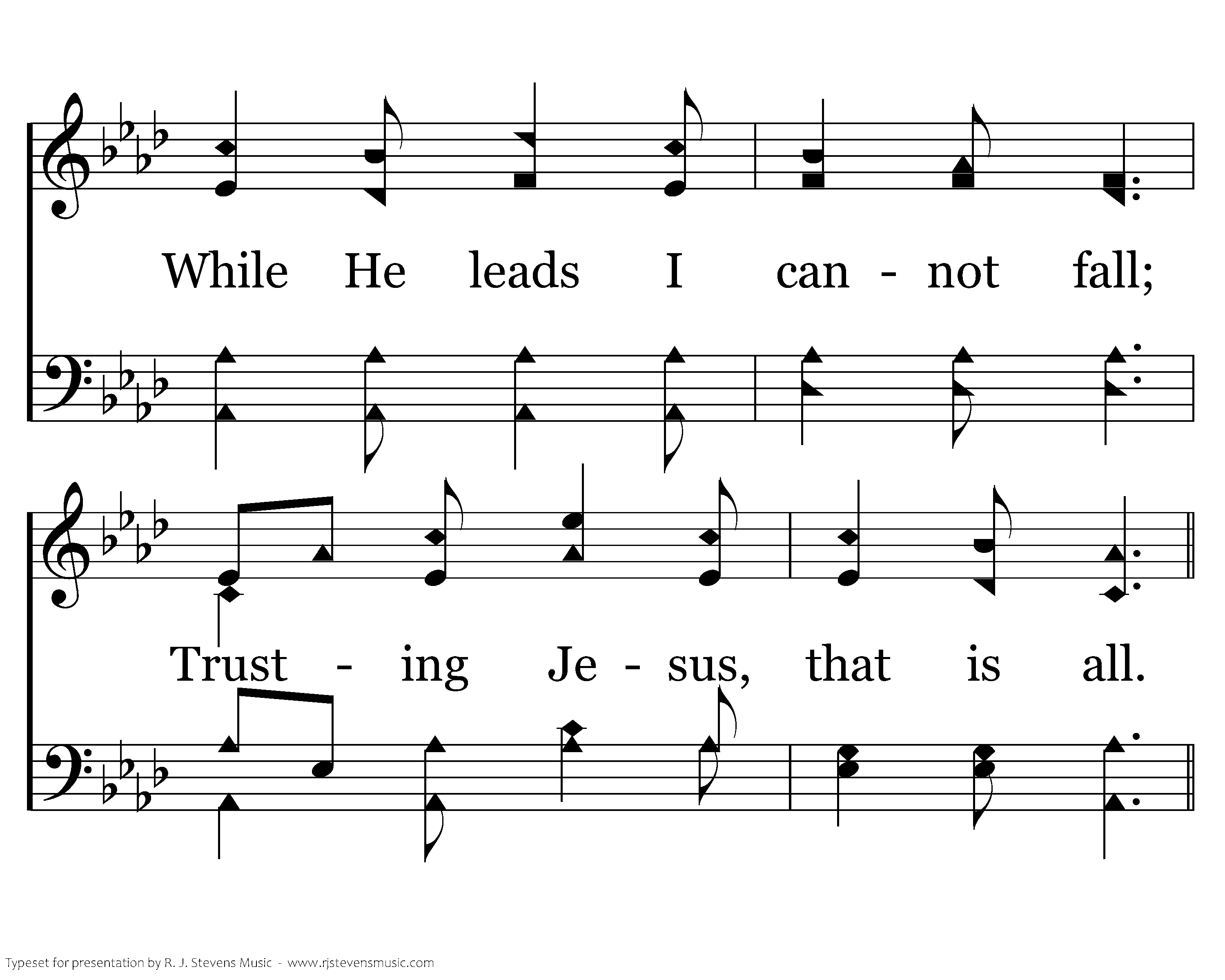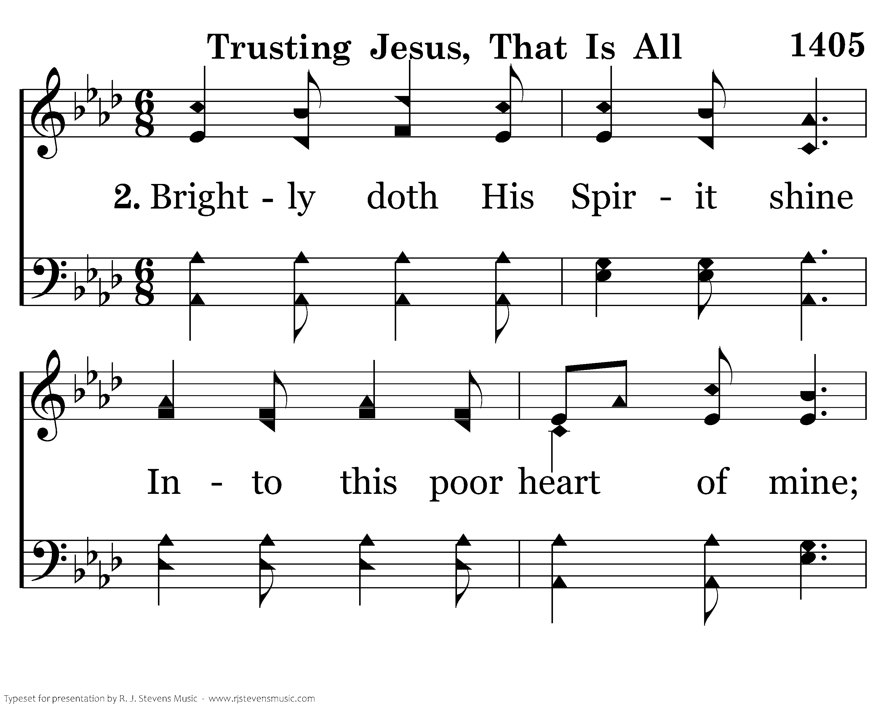 Brightly doth His Spirit shine Into this poor heart of mine; While He leads I cannot fall; Trusting Jesus, that is all.