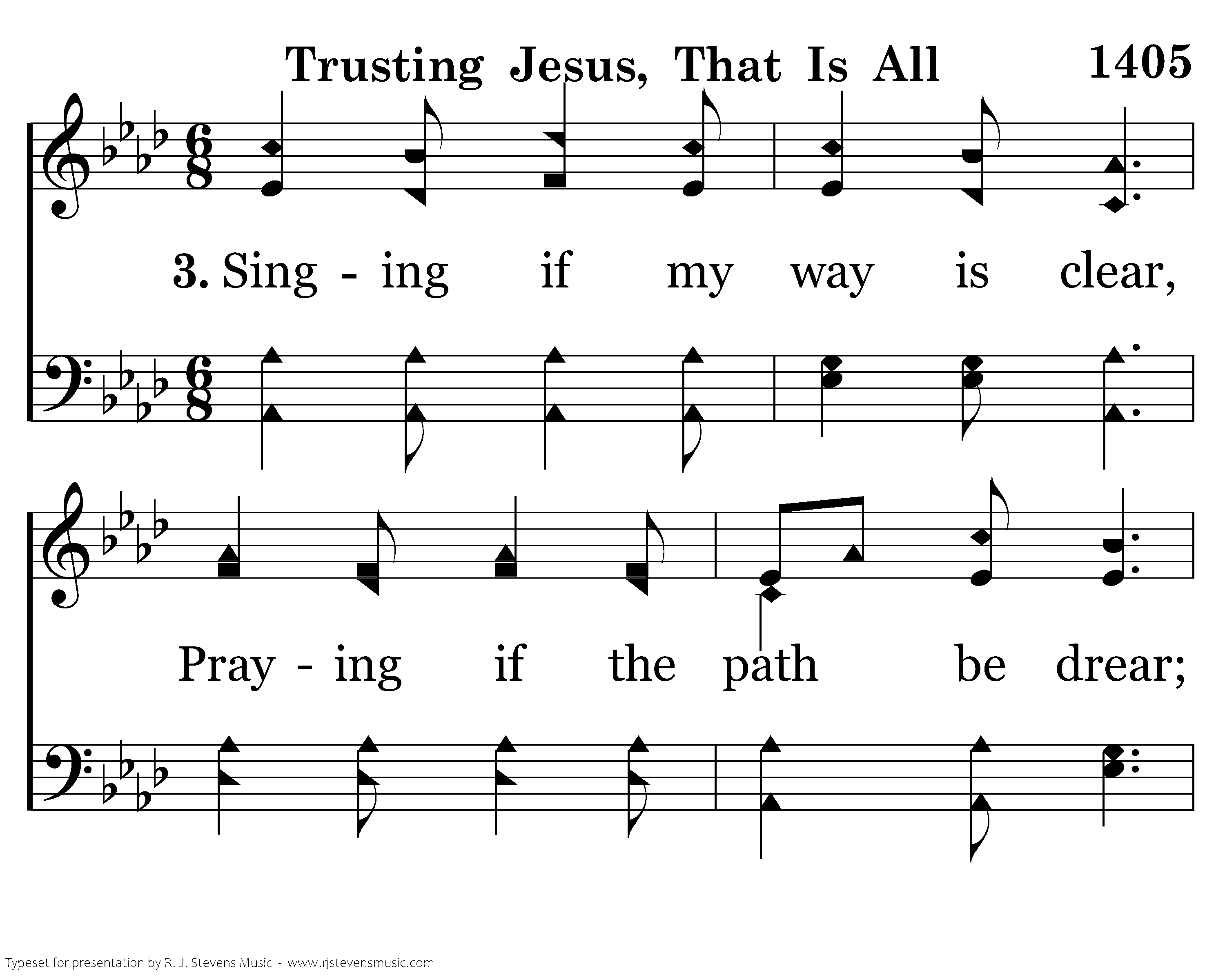 Singing if my way is clear, Praying if the path be drear; If in danger for Him call; Trusting Jesus, that is all.