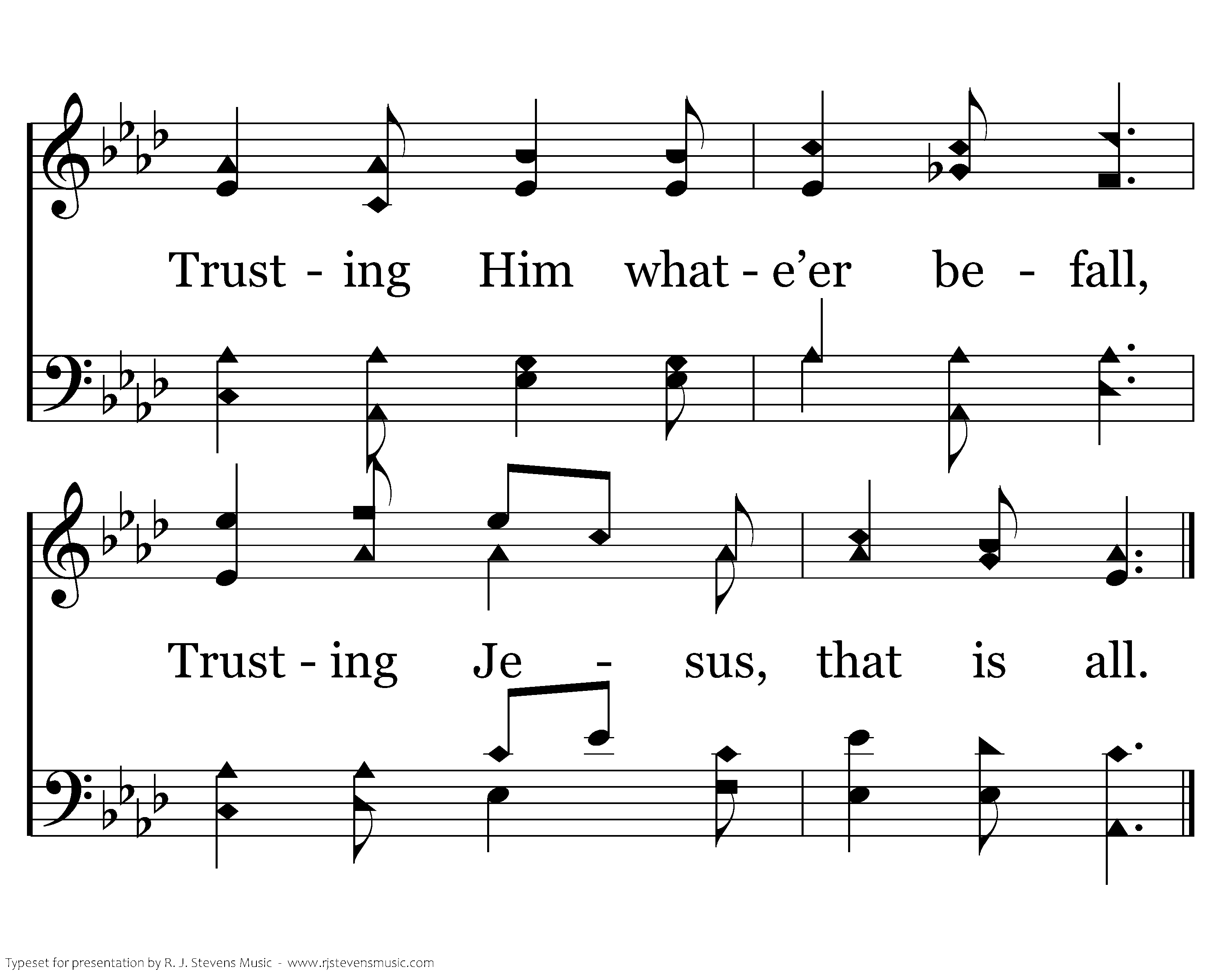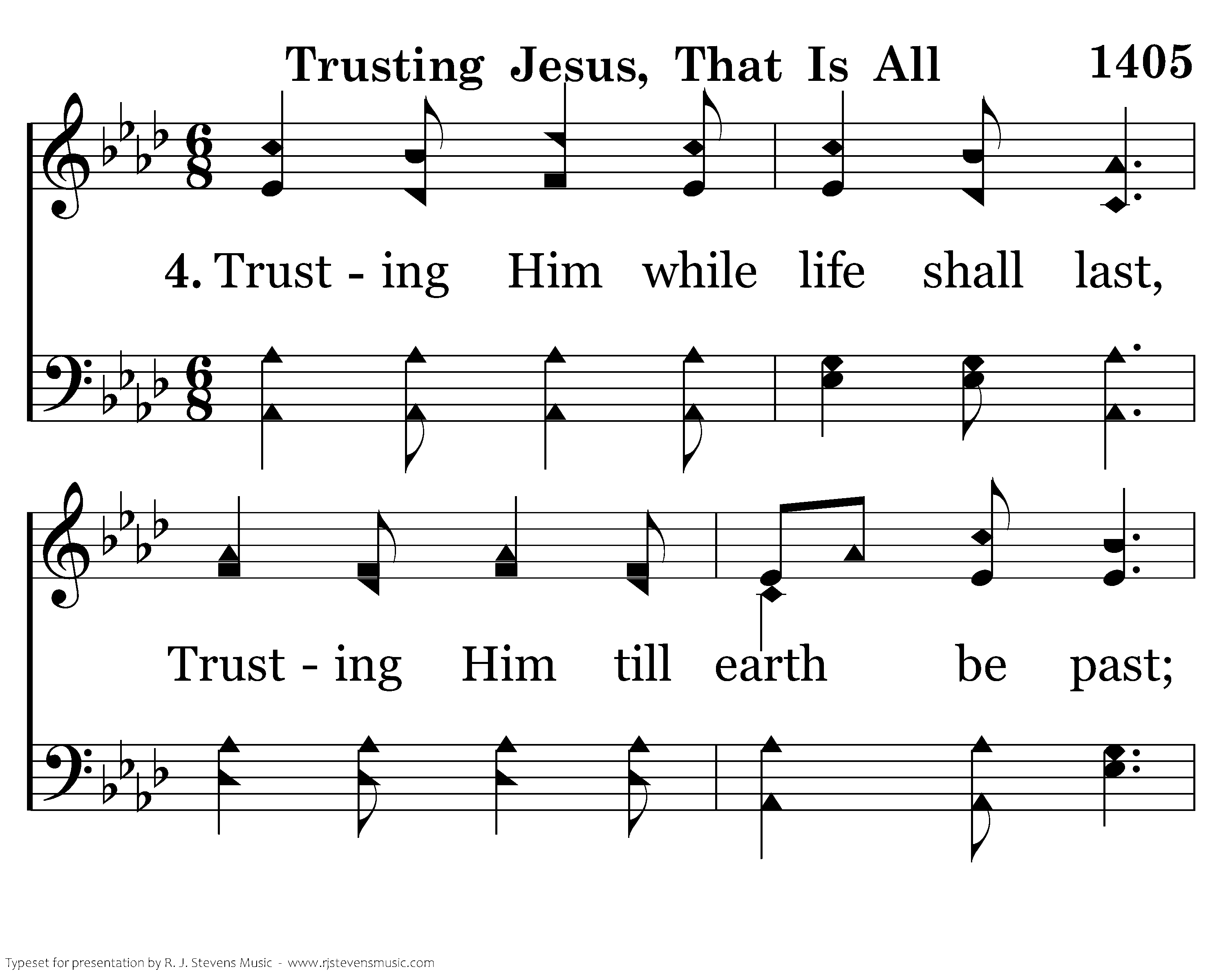 Trusting Him while life shall last, Trusting Him till earth be past; Till within the jasper wall, Trusting Jesus, that is all.
