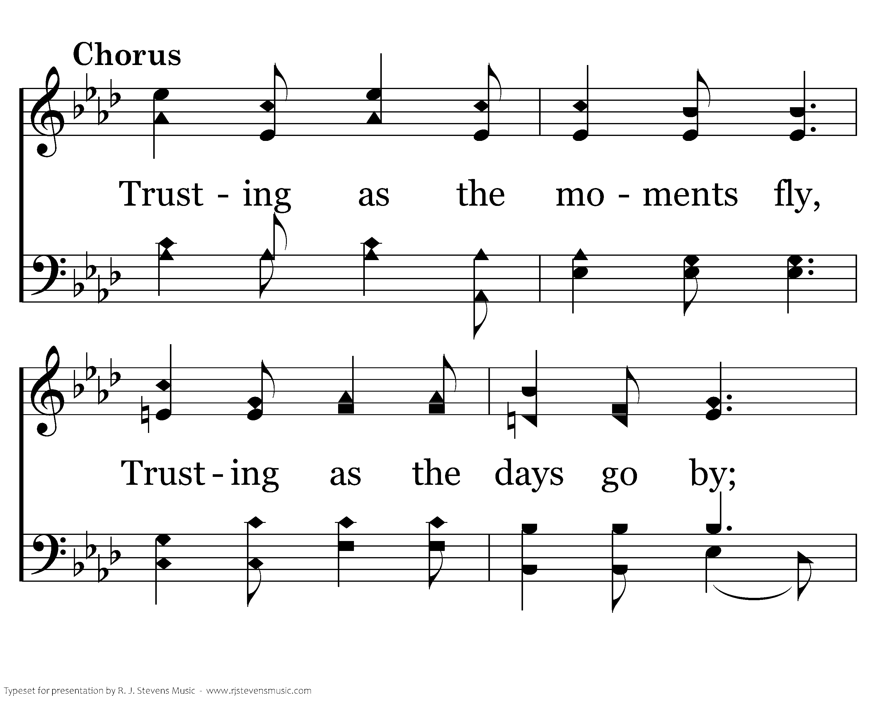 Trusting as the moments fly, Trusting as the days go by; Trusting Him whate’er befall, Trusting Jesus, that is all.