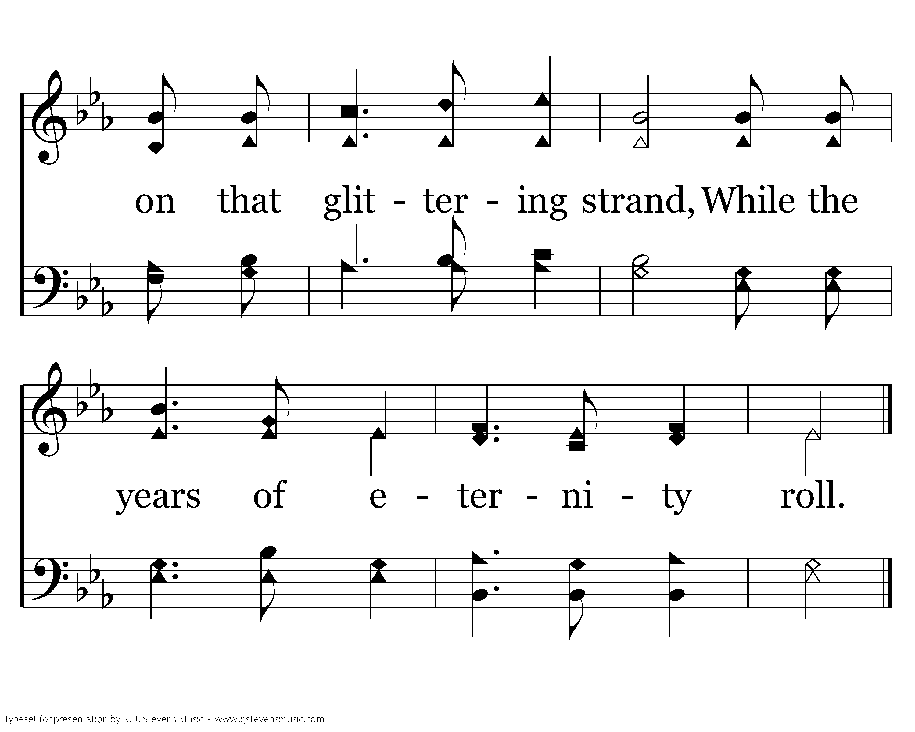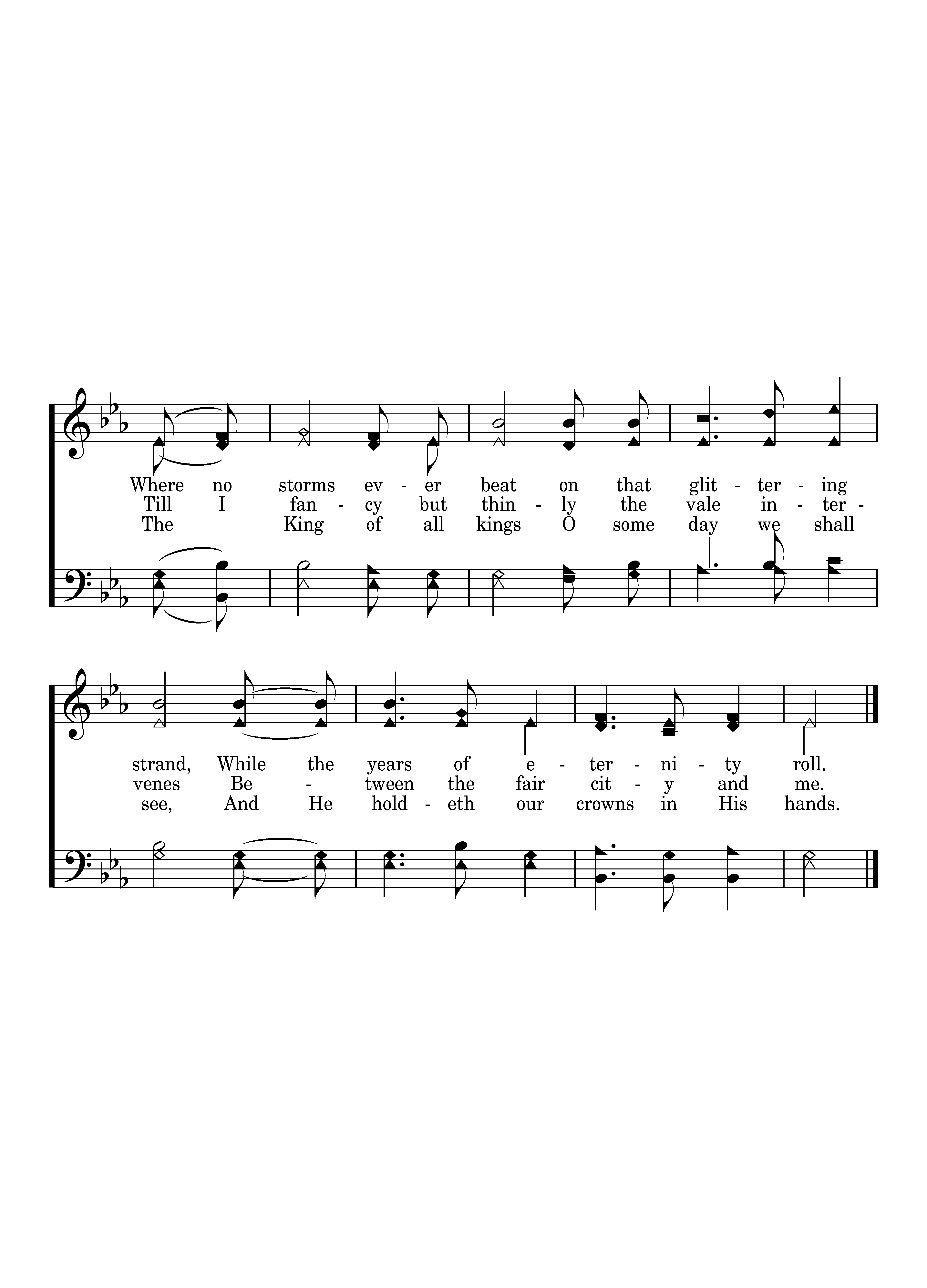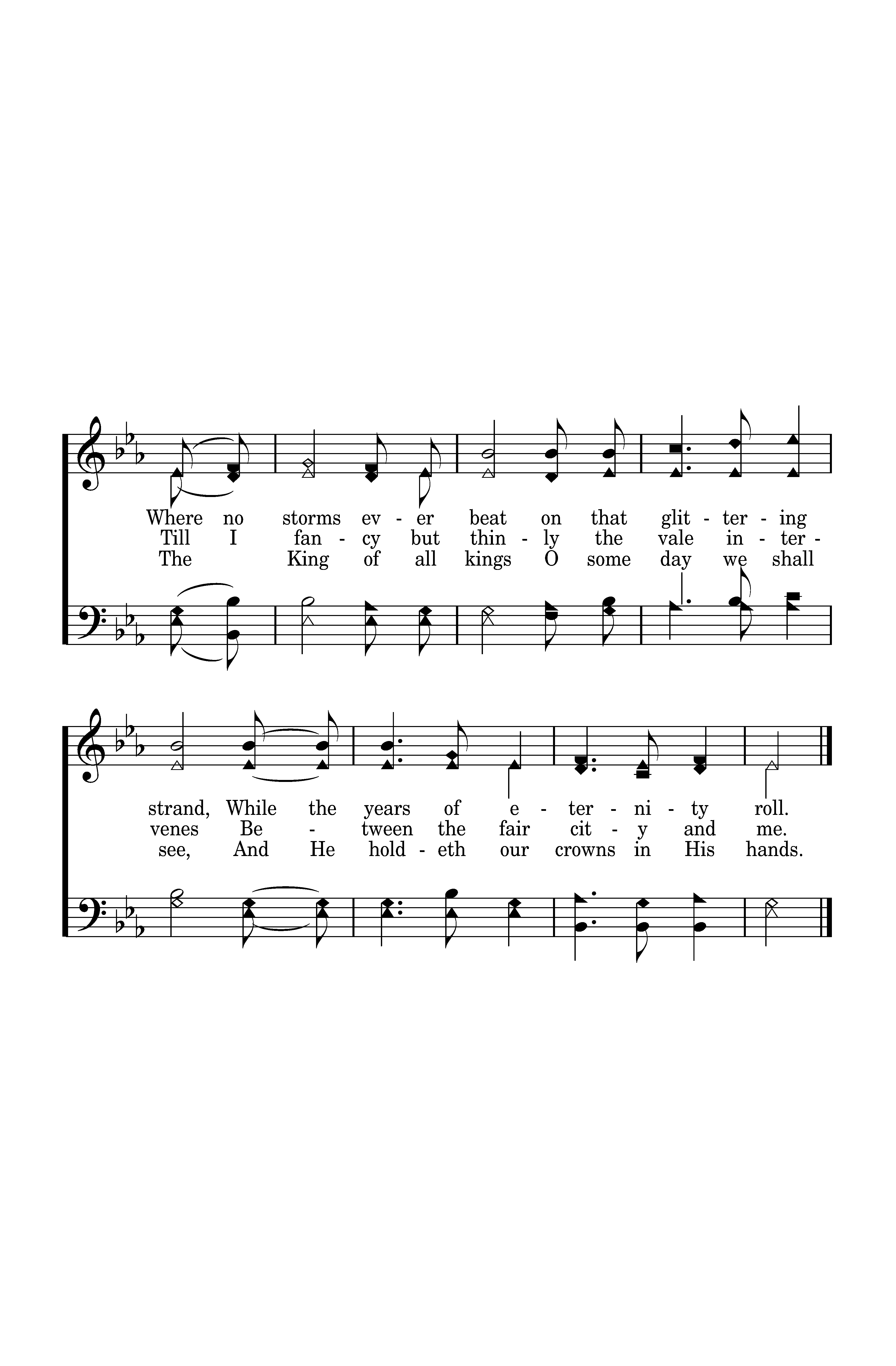 I will sing you a song of that beautiful land, The far away home of the soul; Where no storms ever beat on that glittering strand, While the years of eternity roll, While the years of eternity roll; Where no storms ever beat on that glittering strand, While the years of eternity roll.