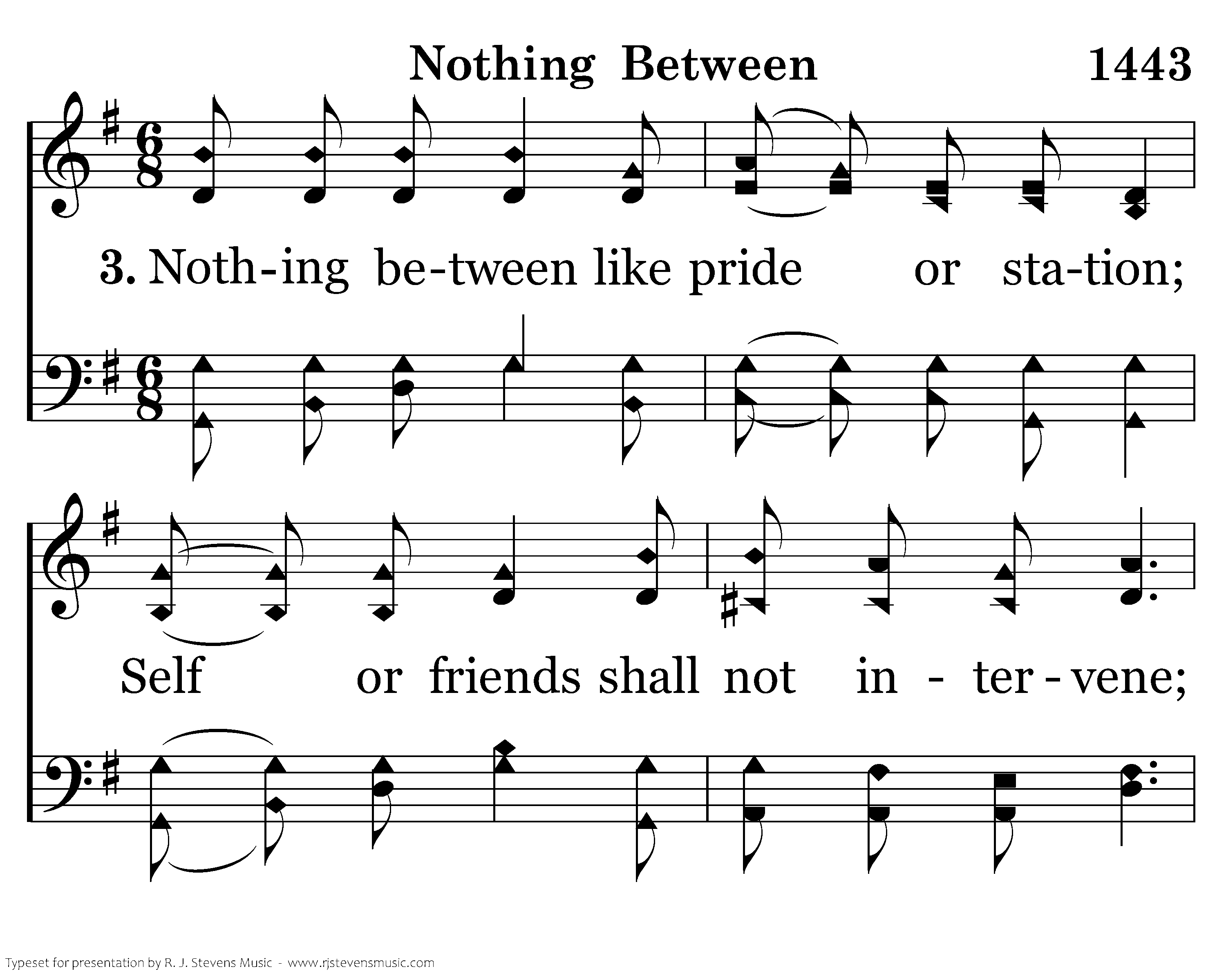 Nothing between like worldly pleasure; Habits of life, tho' harmless they seem; Must not my heart from Him ever sever, He is my all, there's nothing between.