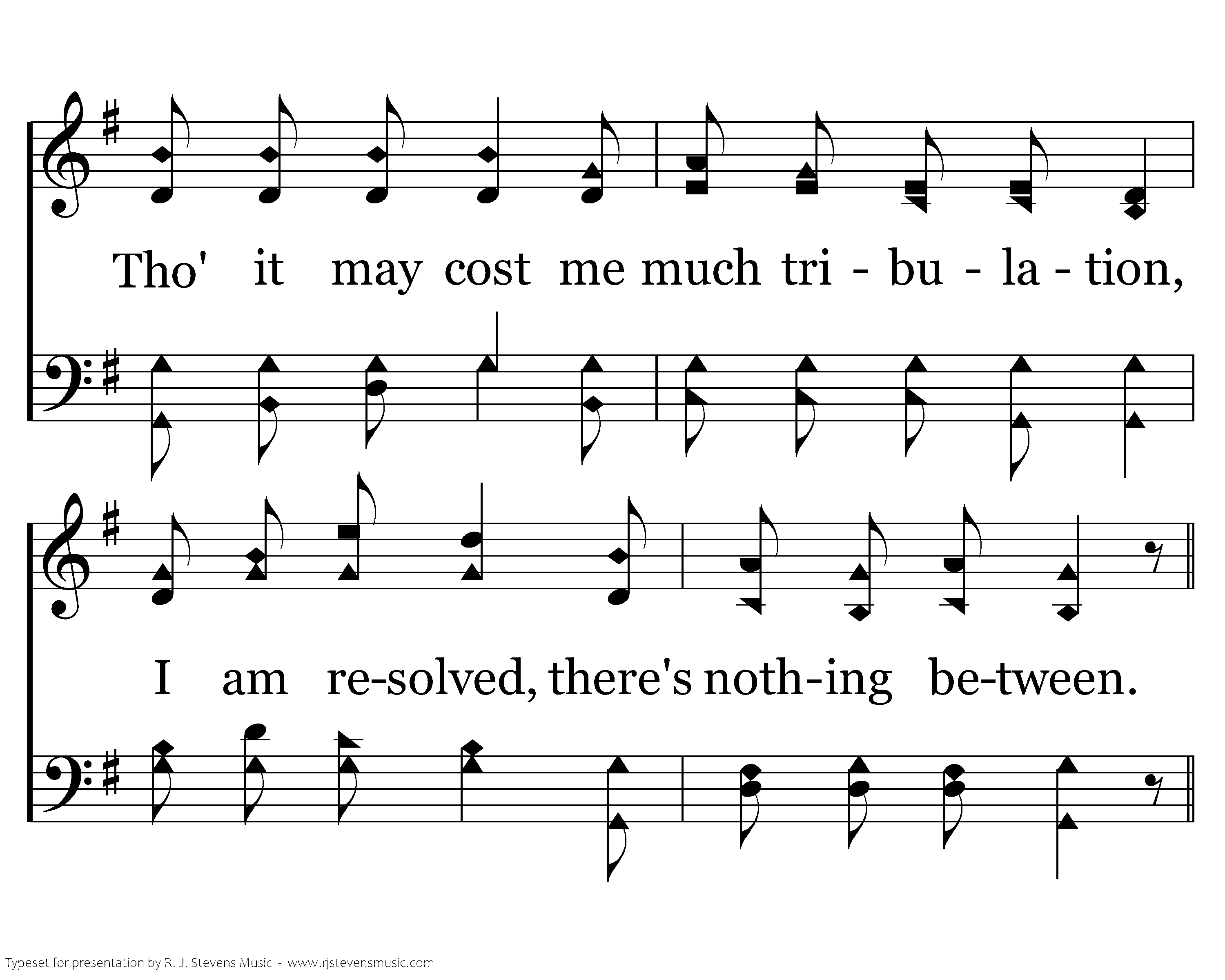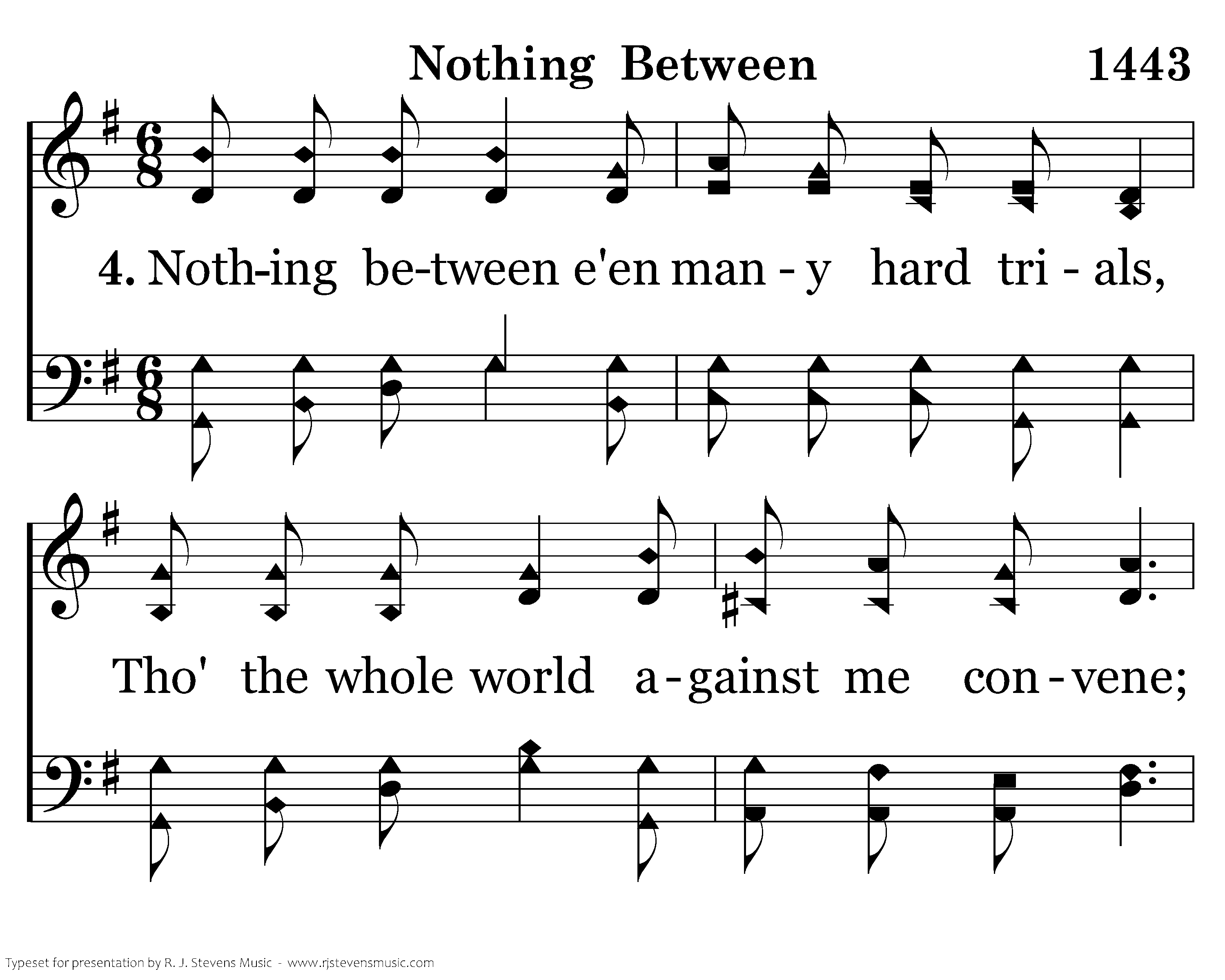 Nothing between e'en many hard trials, Tho' the whole world against me convene; Watching with pray'r and much self denial, I'll triumph at last, there's nothing between.