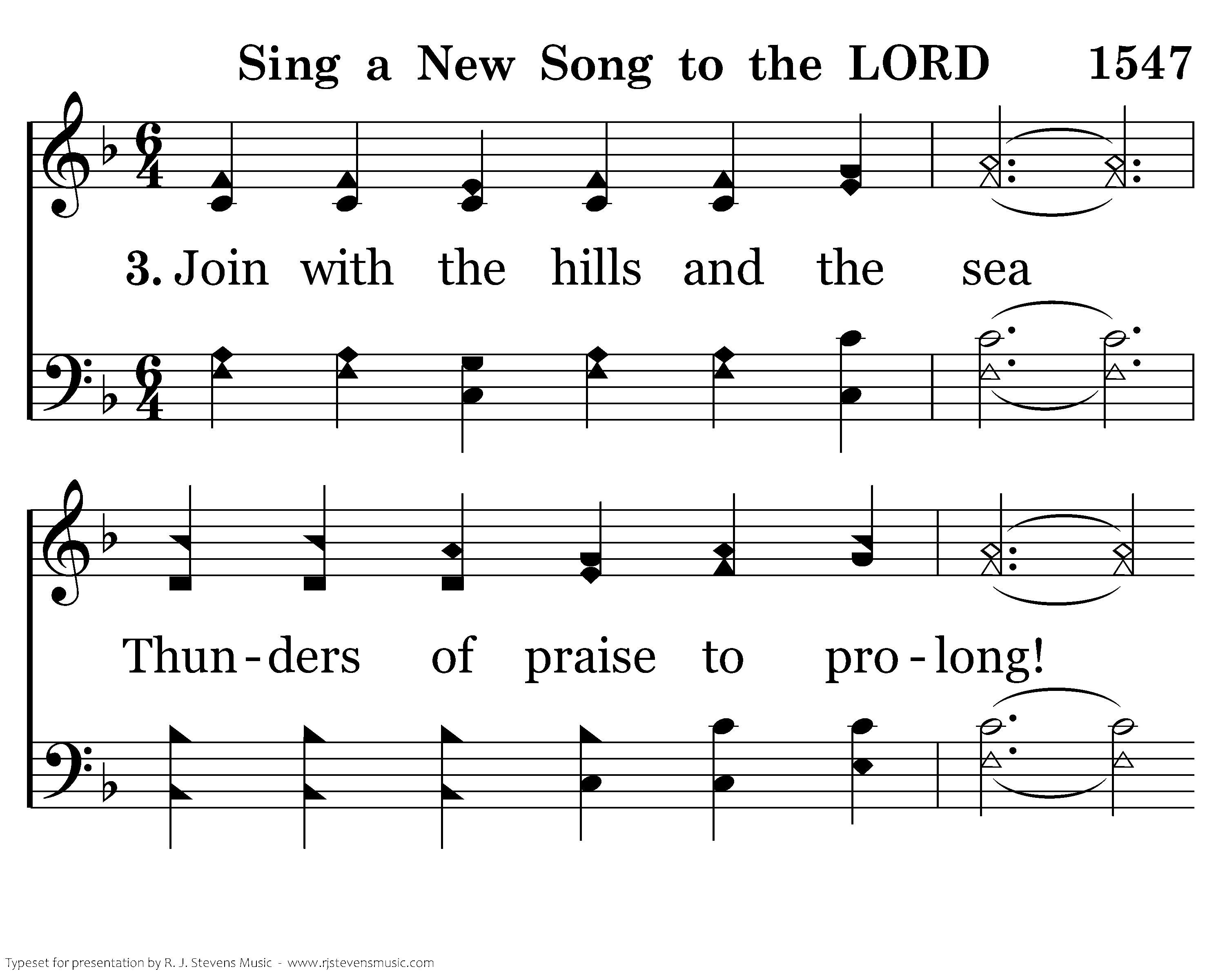Join with the hills and the sea Thunders of praise to prolong! In judgment and justice He comes to the earth, He comes to the earth. O sing to the LORD a new song!