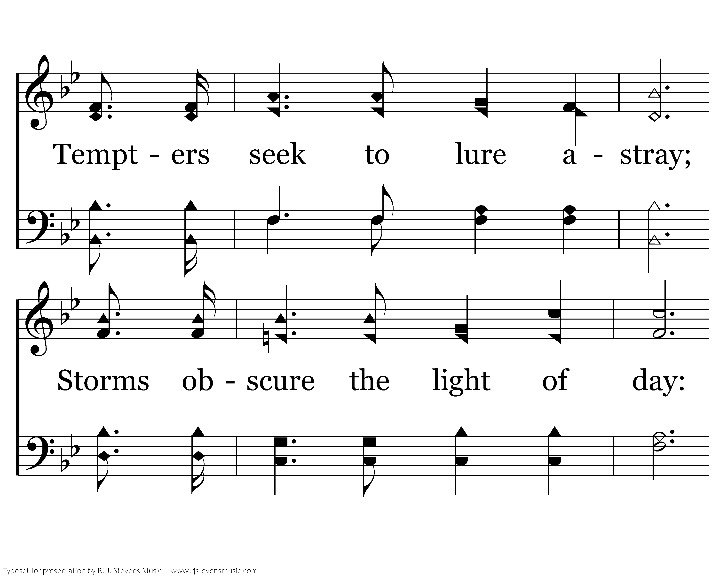 Mighty tides about me sweep, Perils lurk within the deep, Angry clouds o'ershade the sky, and the tempest rises high; Still I stand the tempest's shock, For my anchor grips the rock.